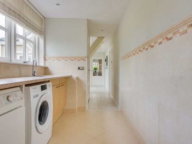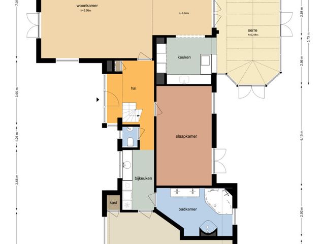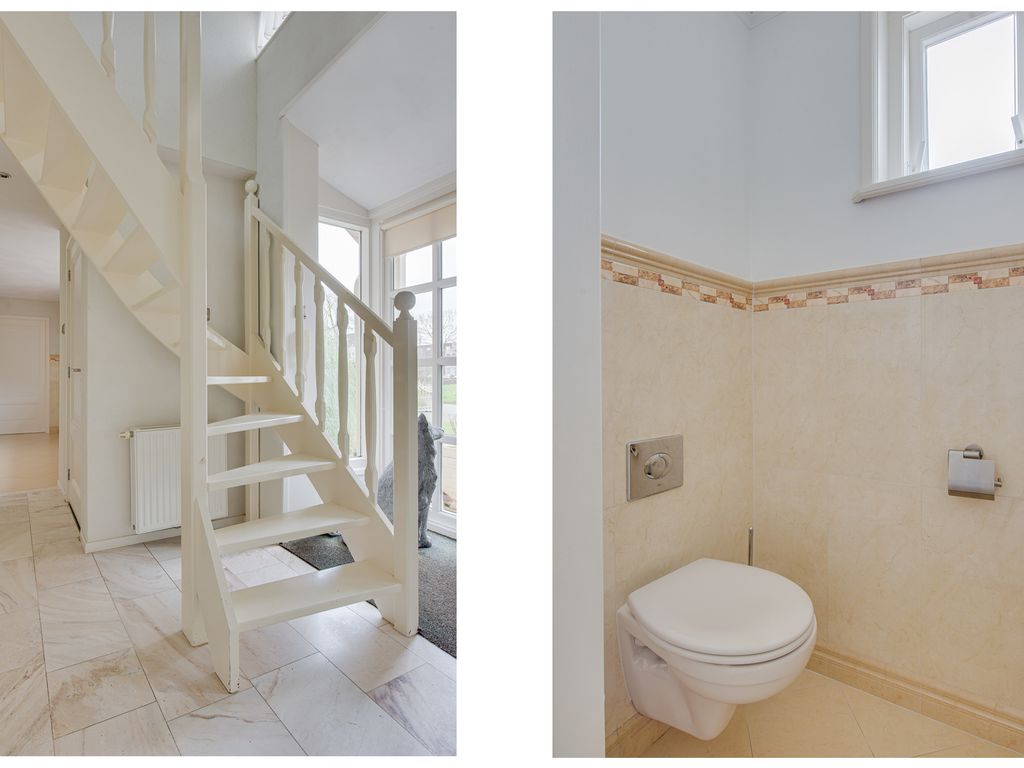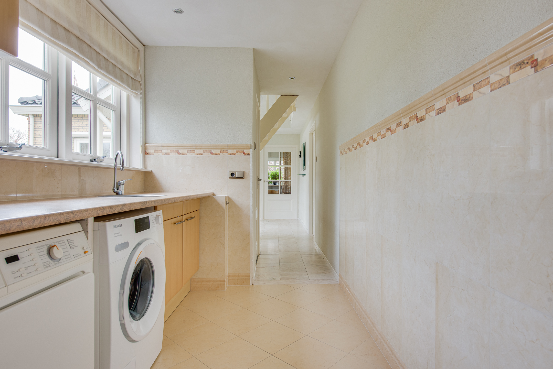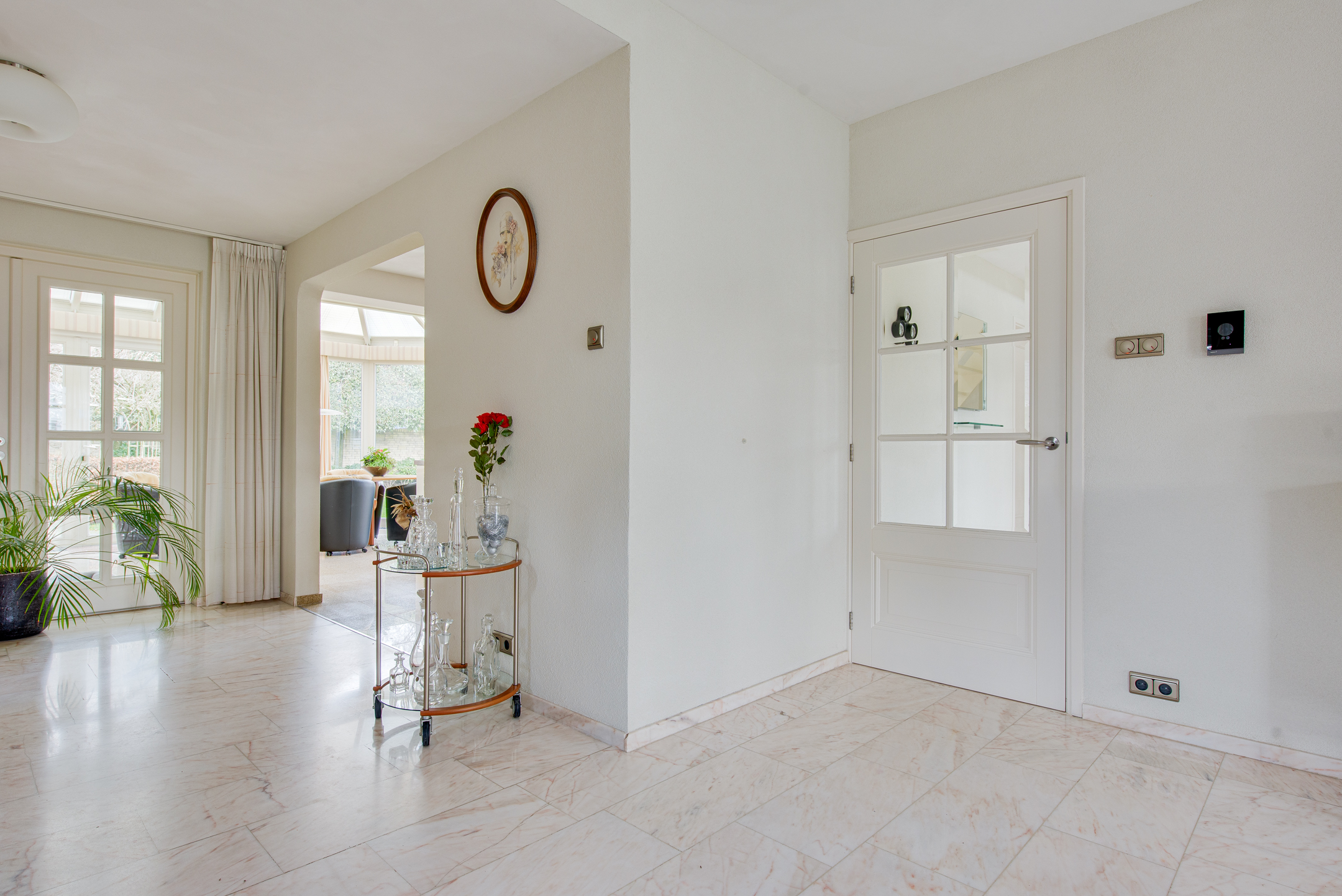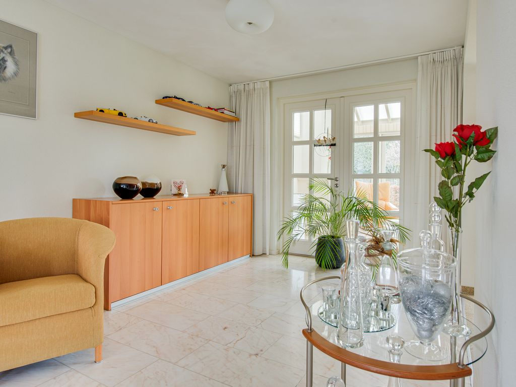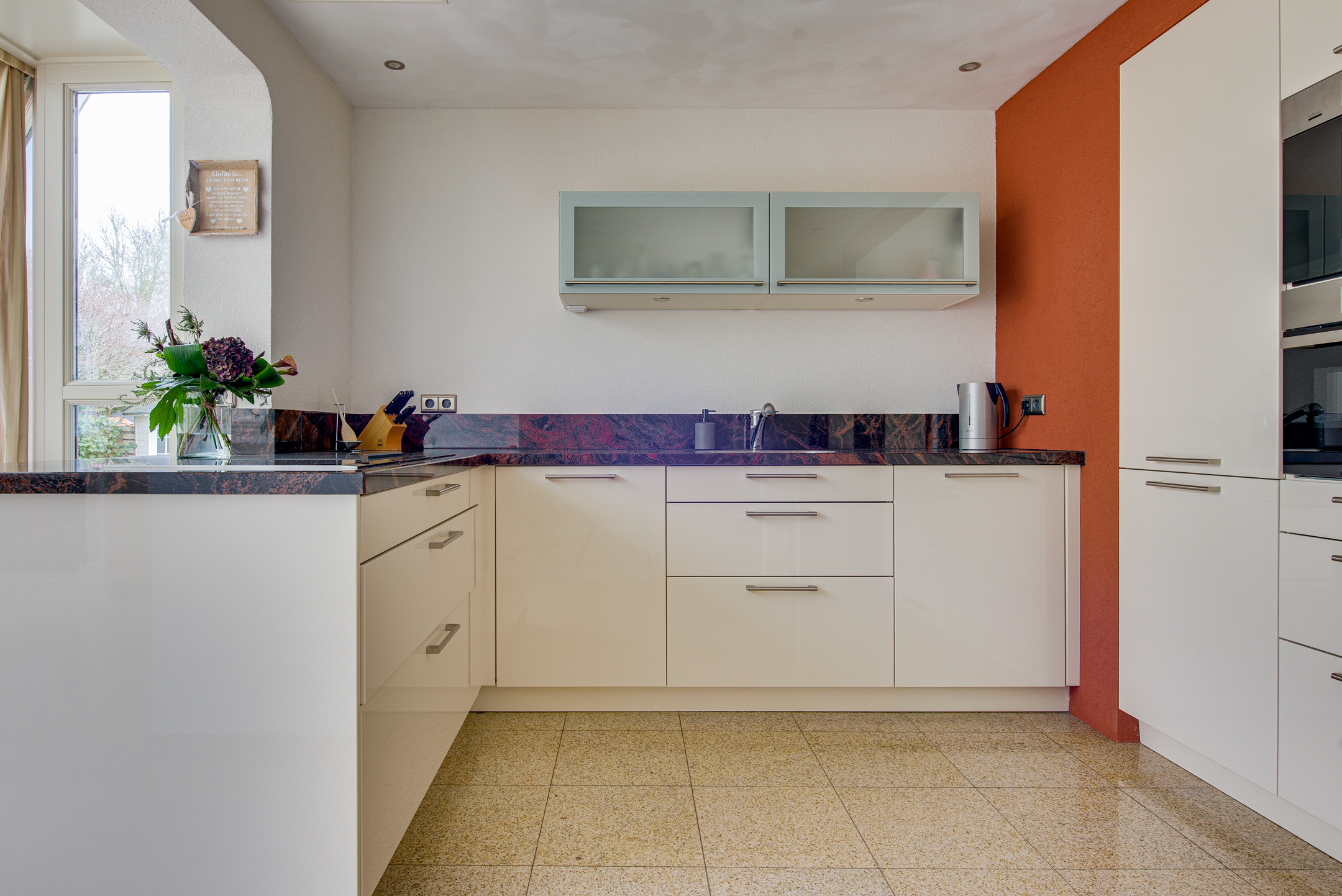 Aansluitend bevindt zich de keuken en de serre. De luxe keuken is van alle gemakken voorzien, waaronder een koel-/vriescombinatie, close-in boiler, vaatwasser, inductiekookplaat, inbouwfriteuze, afzuigkap, combi-oven en een ingebouwde koffiemachine. De lichte kleurstelling, het granieten werkblad en de royale kastruimte zorgen voor een frisse en warme uitstraling.