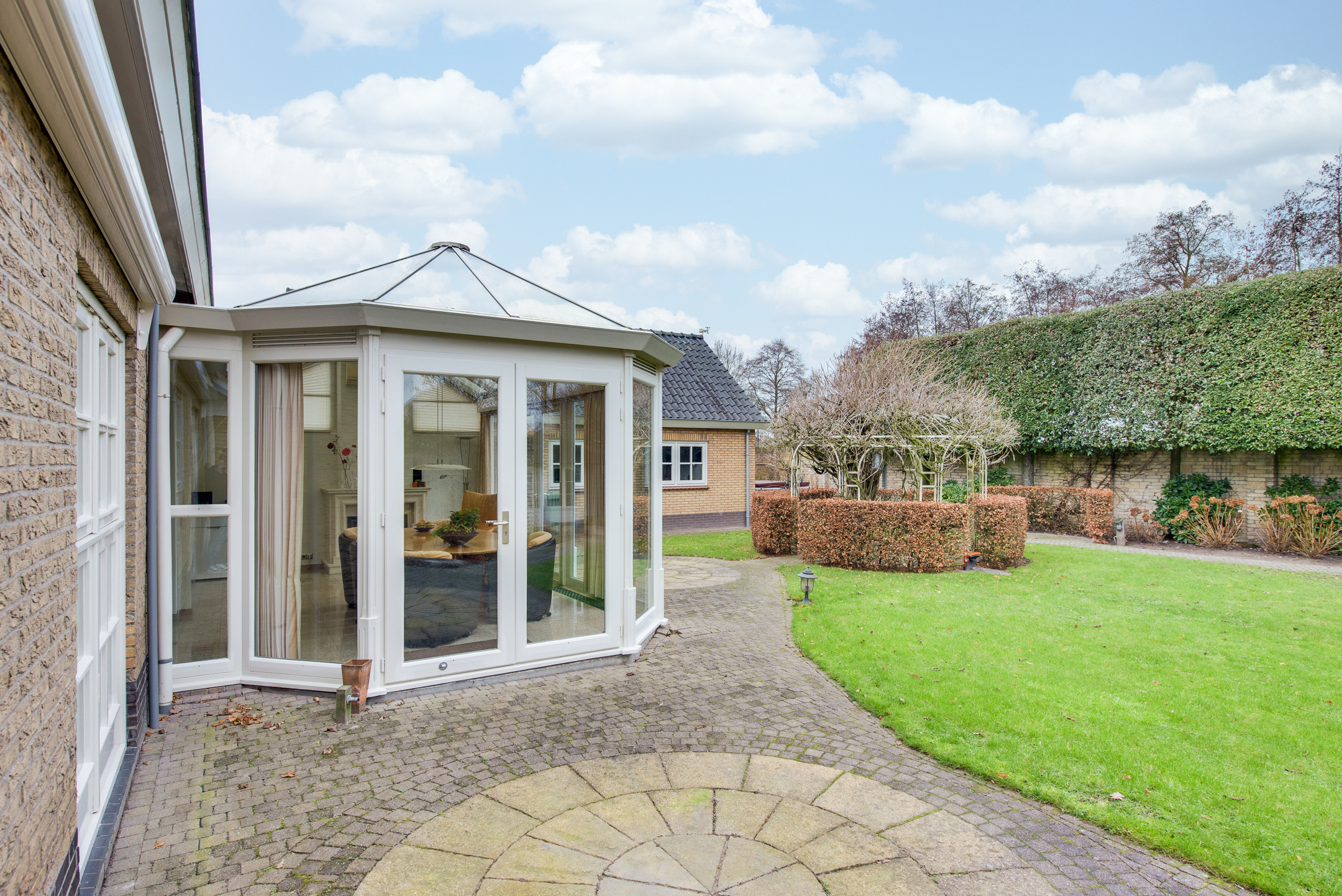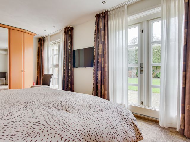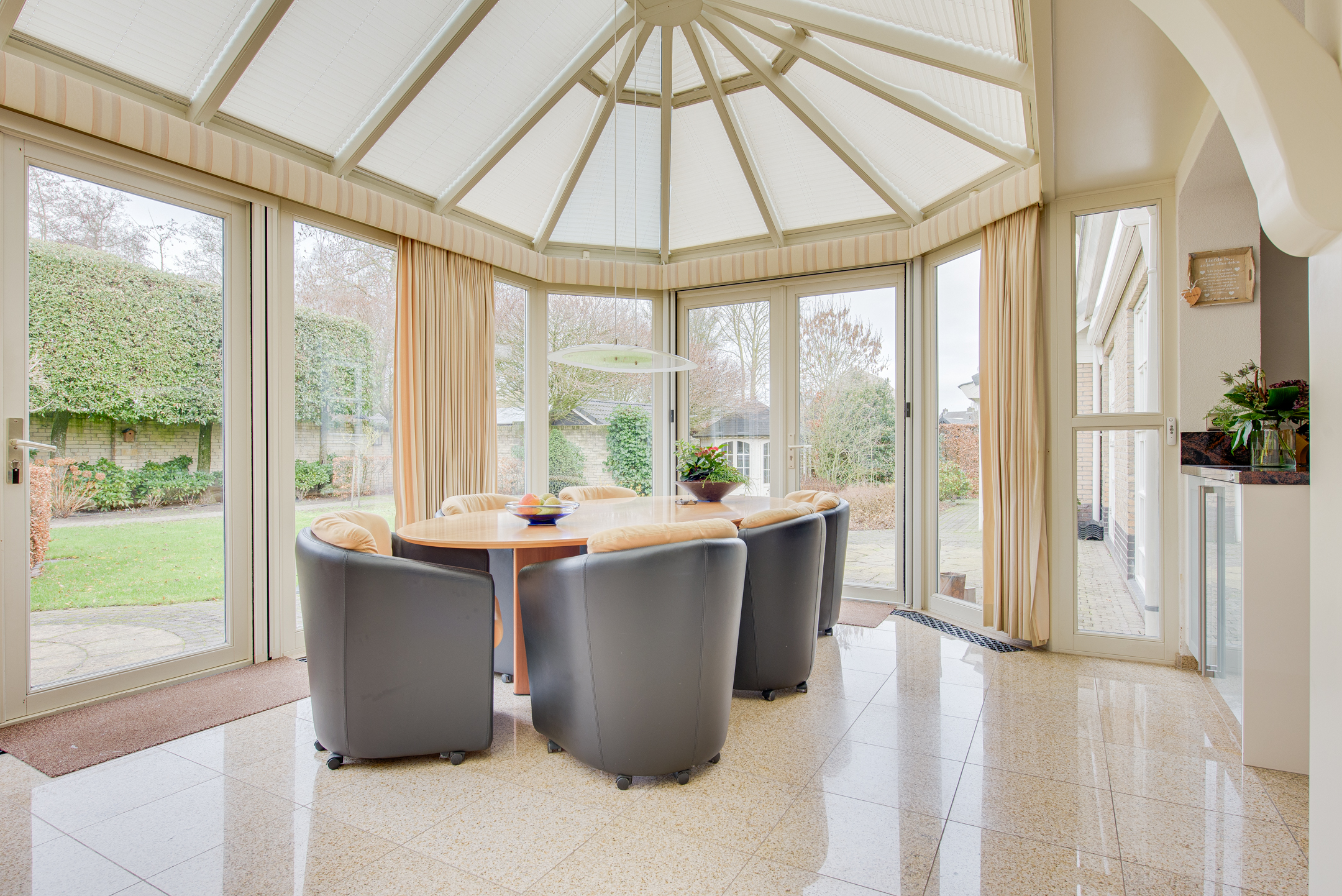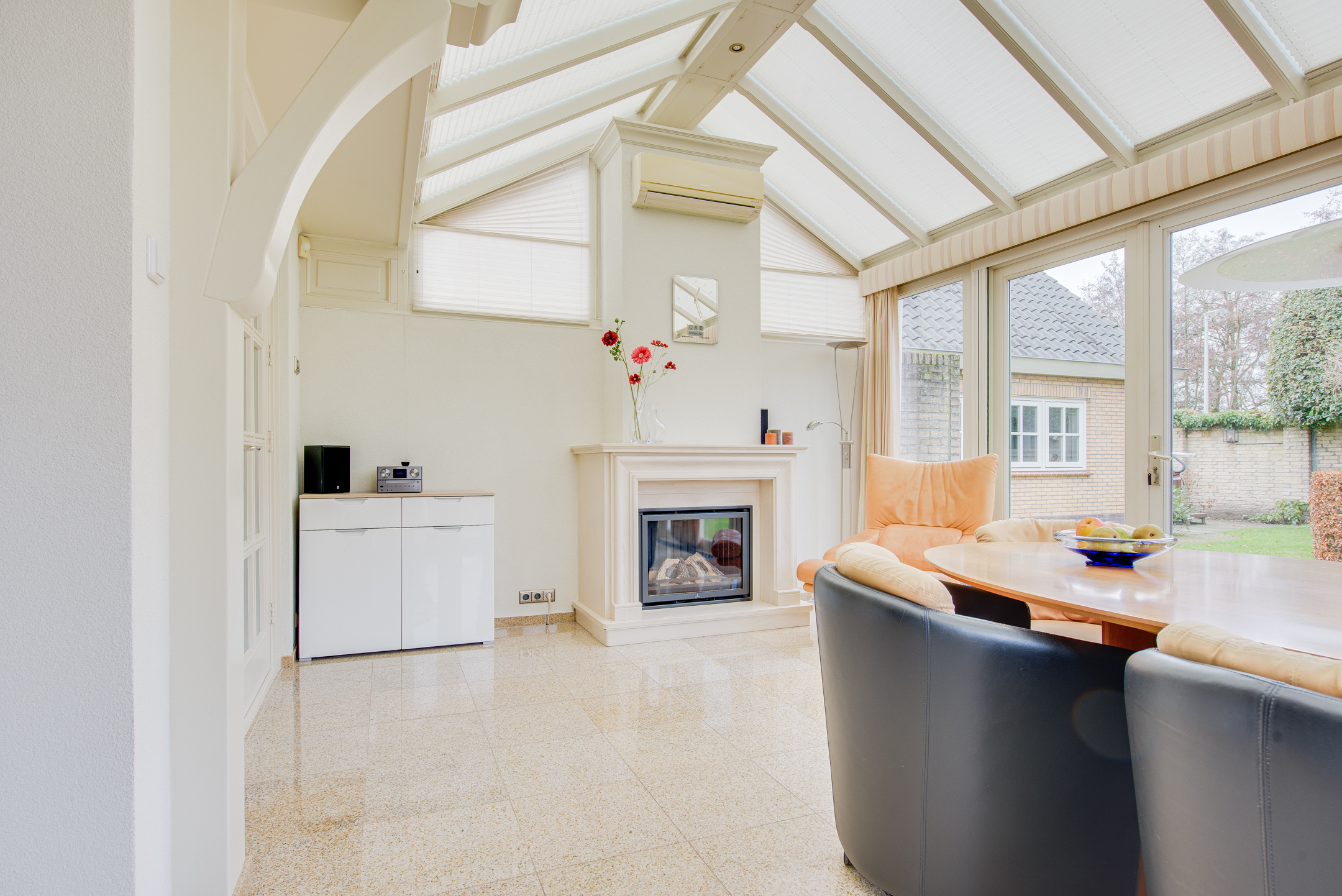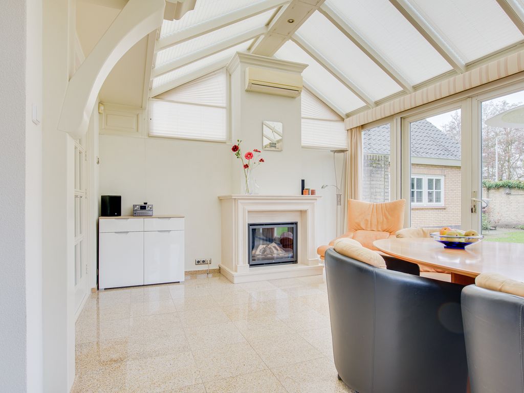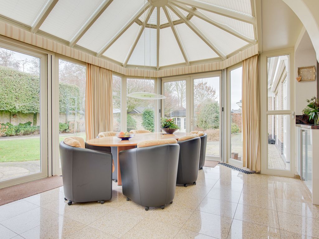 De serre is ingericht als gezellige eetkamer en biedt een prachtig uitzicht over de achtertuin. Mede dankzij de gashaard is het hier zelfs in de koudere maanden heerlijk vertoeven, terwijl de airconditioning zorgt voor comfort op warme zomerdagen.