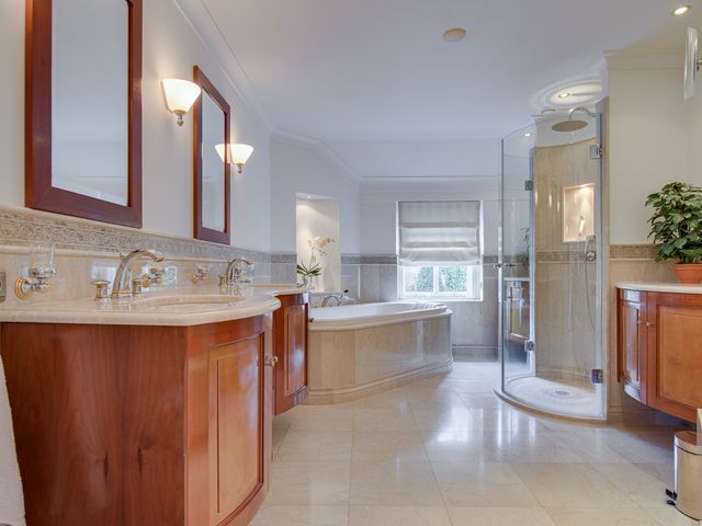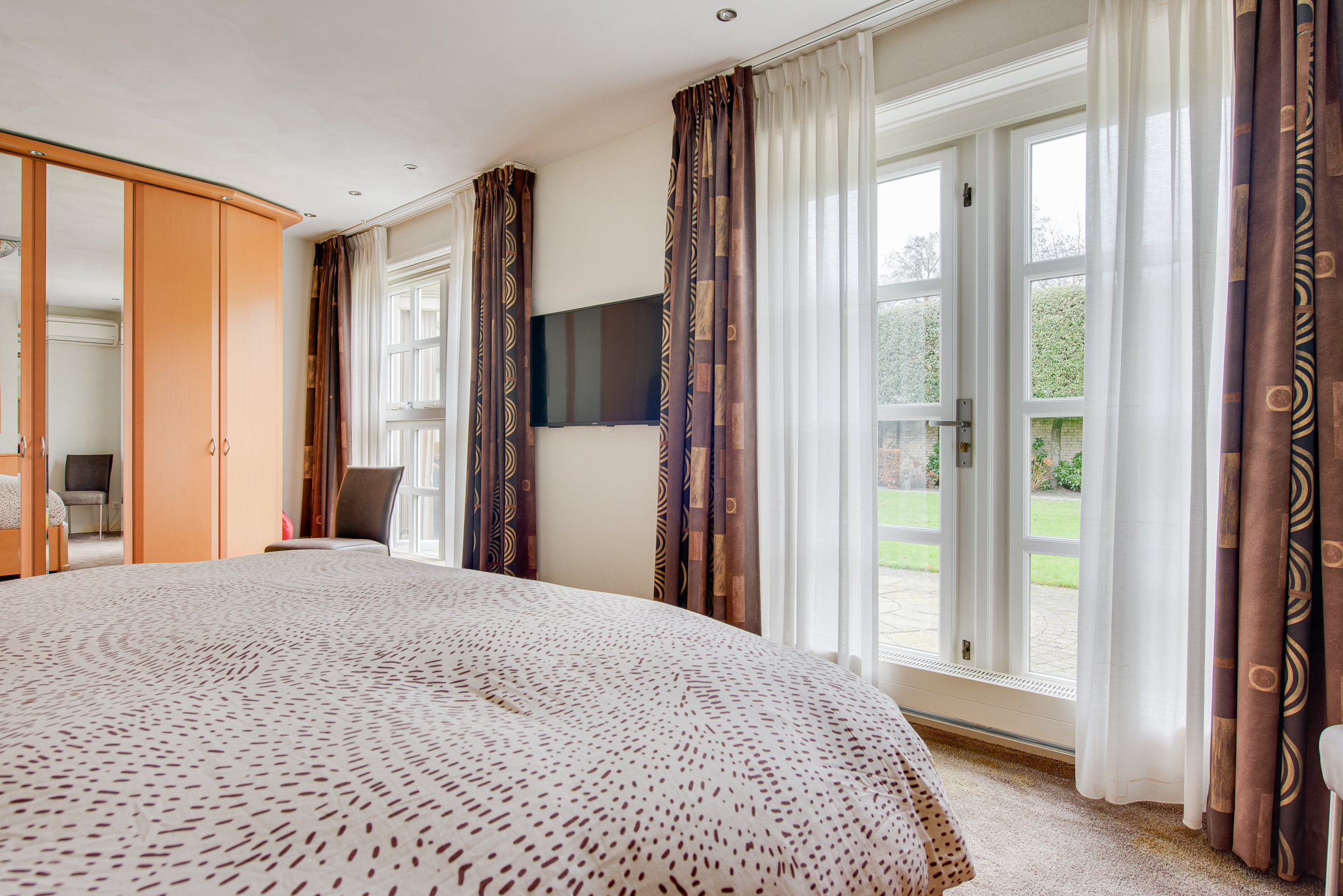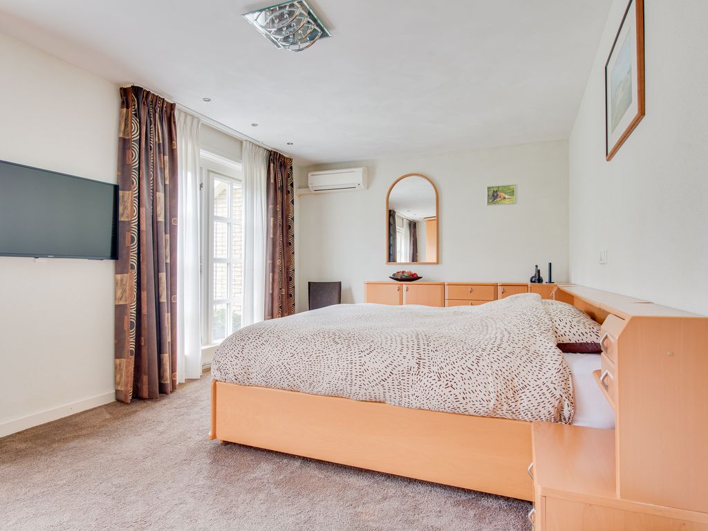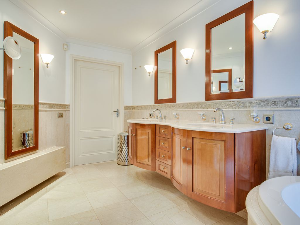 Op de begane grond bevinden zich tevens een royale slaapkamer met openslaande deuren naar de tuin en airconditioning, en een luxe badkamer. De badkamer is royaal en uitgerust met een ligbad, douche, dubbel wastafelmeubel en veel kastruimte, kortom een fijne plek om echt even te ontspannen.