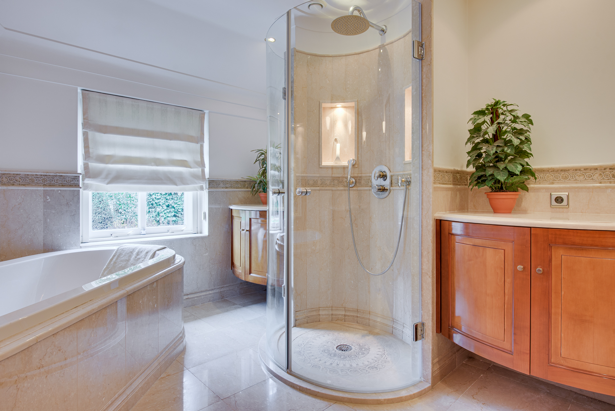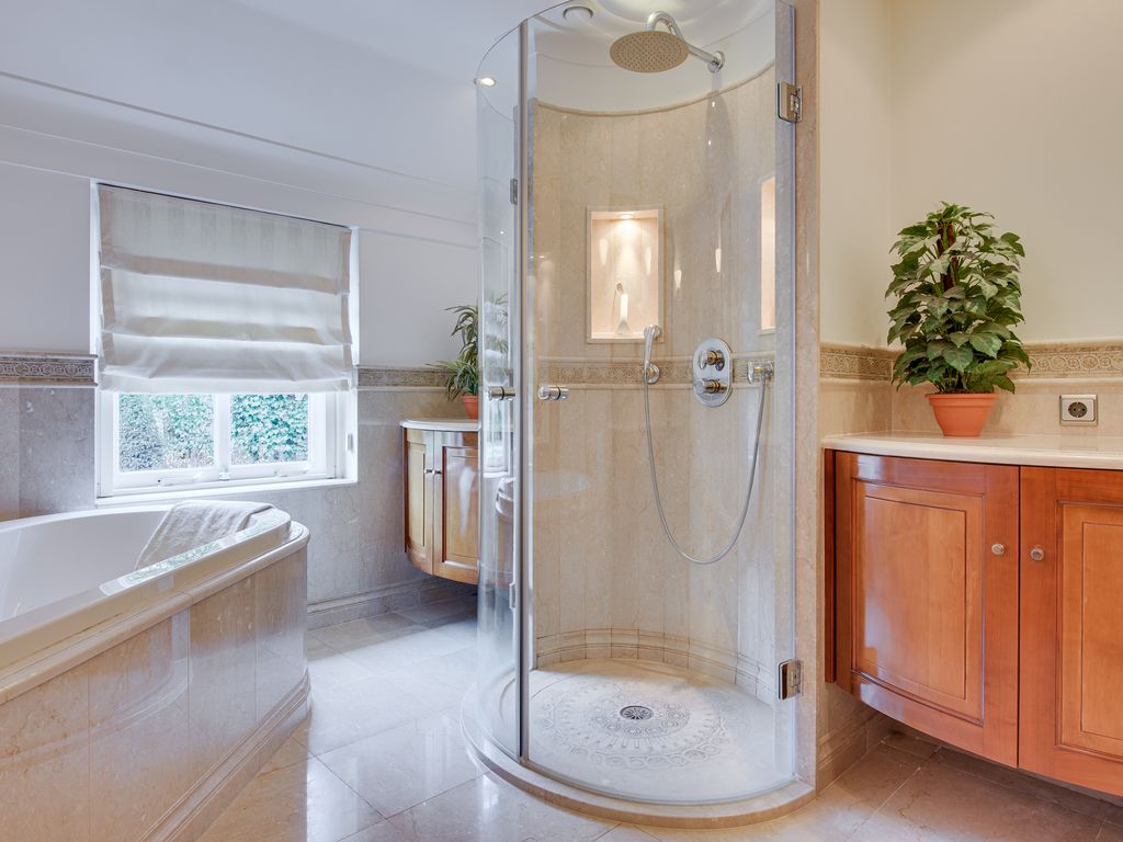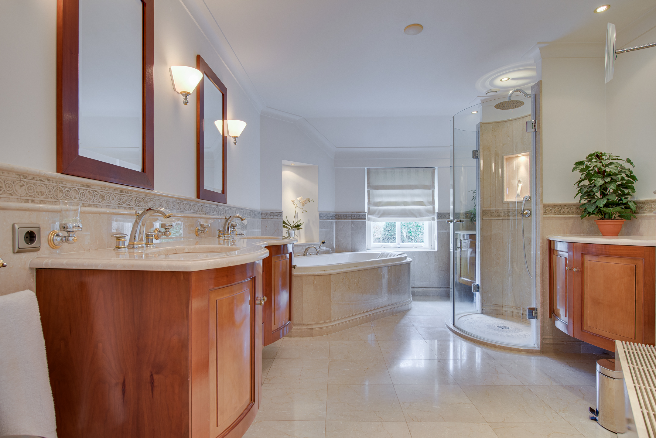 Op de begane grond bevinden zich tevens een royale slaapkamer met openslaande deuren naar de tuin en airconditioning, en een luxe badkamer. De badkamer is royaal en uitgerust met een ligbad, douche, dubbel wastafelmeubel en veel kastruimte, kortom een fijne plek om echt even te ontspannen.
