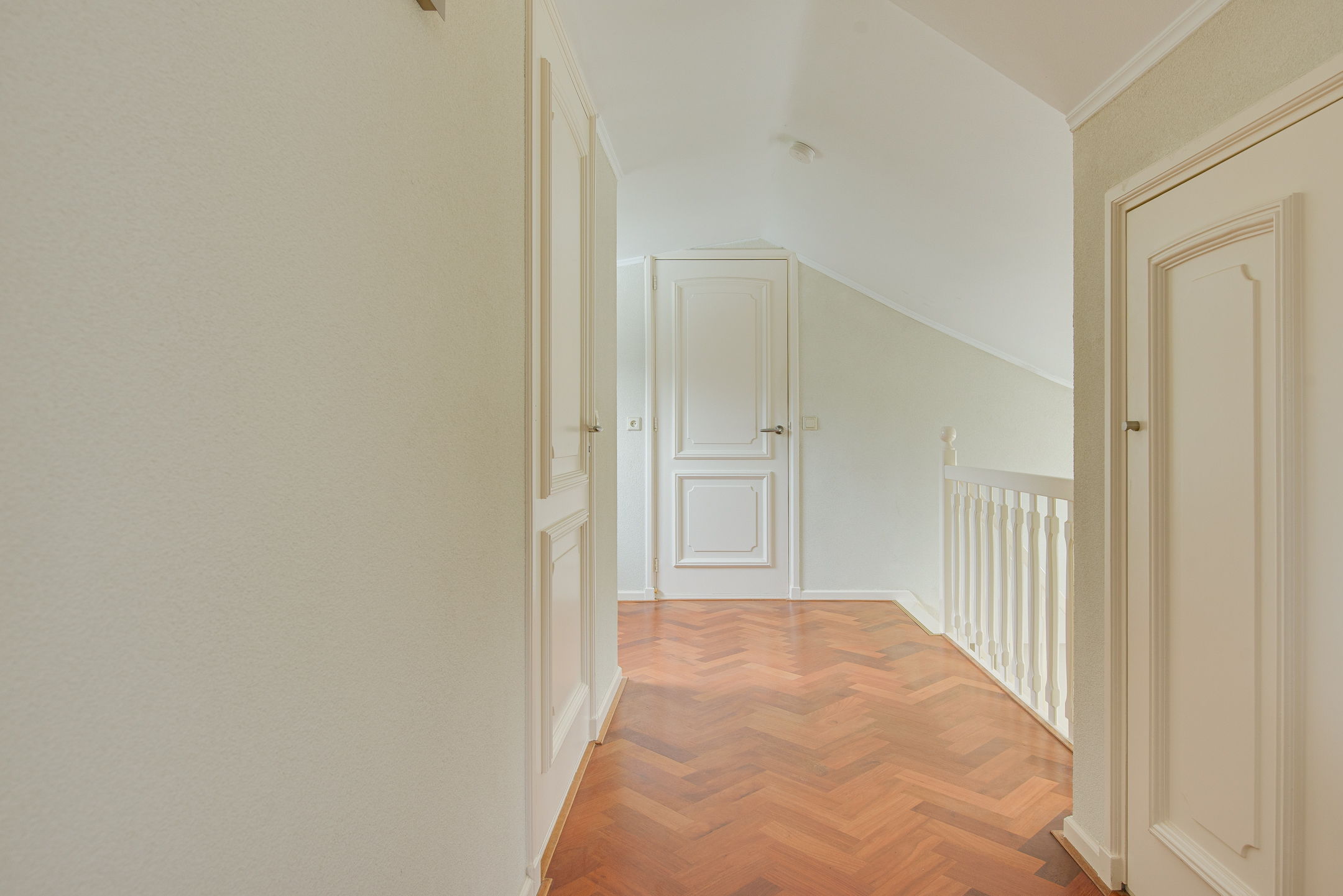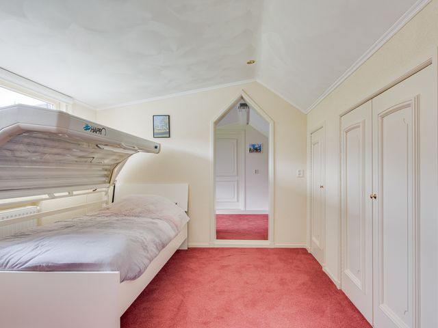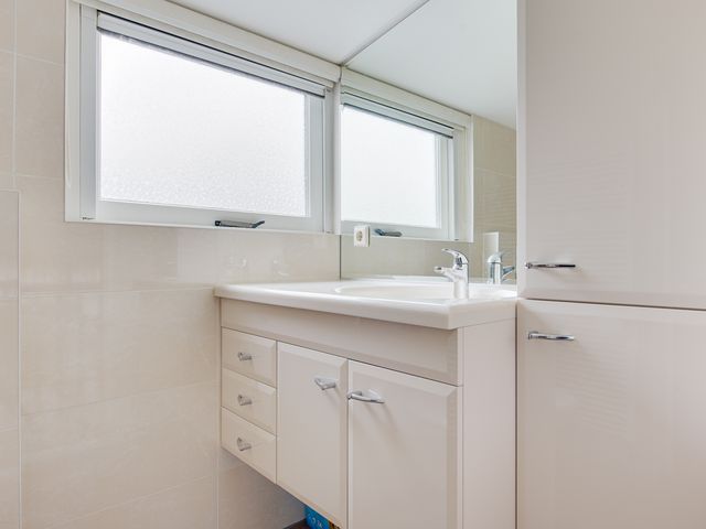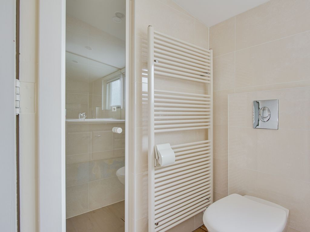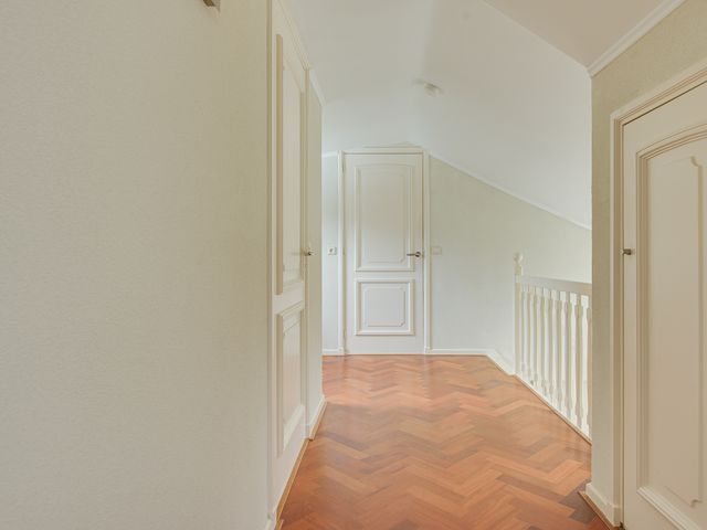 Via de open trap bereik je de verdieping met vide. De lichte overloop geeft toegang tot de badkamer en de slaapvertrekken. Dankzij de brede dakkapel aan de achterzijde zijn de kamers extra licht en ruim, met volop bergruimte. De badkamer beschikt over een douche, toilet, wastafelmeubel en handdoekradiator.