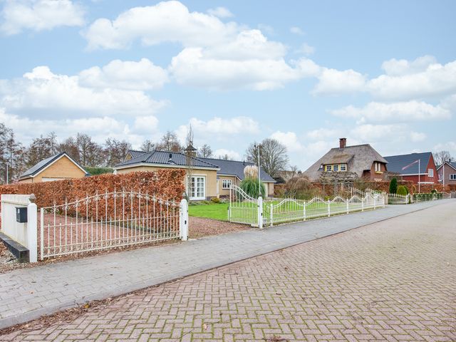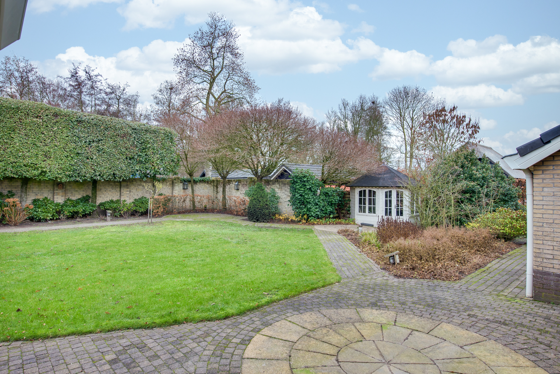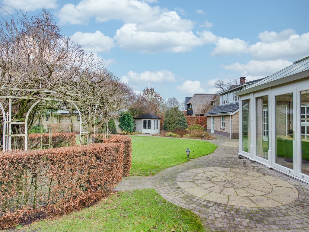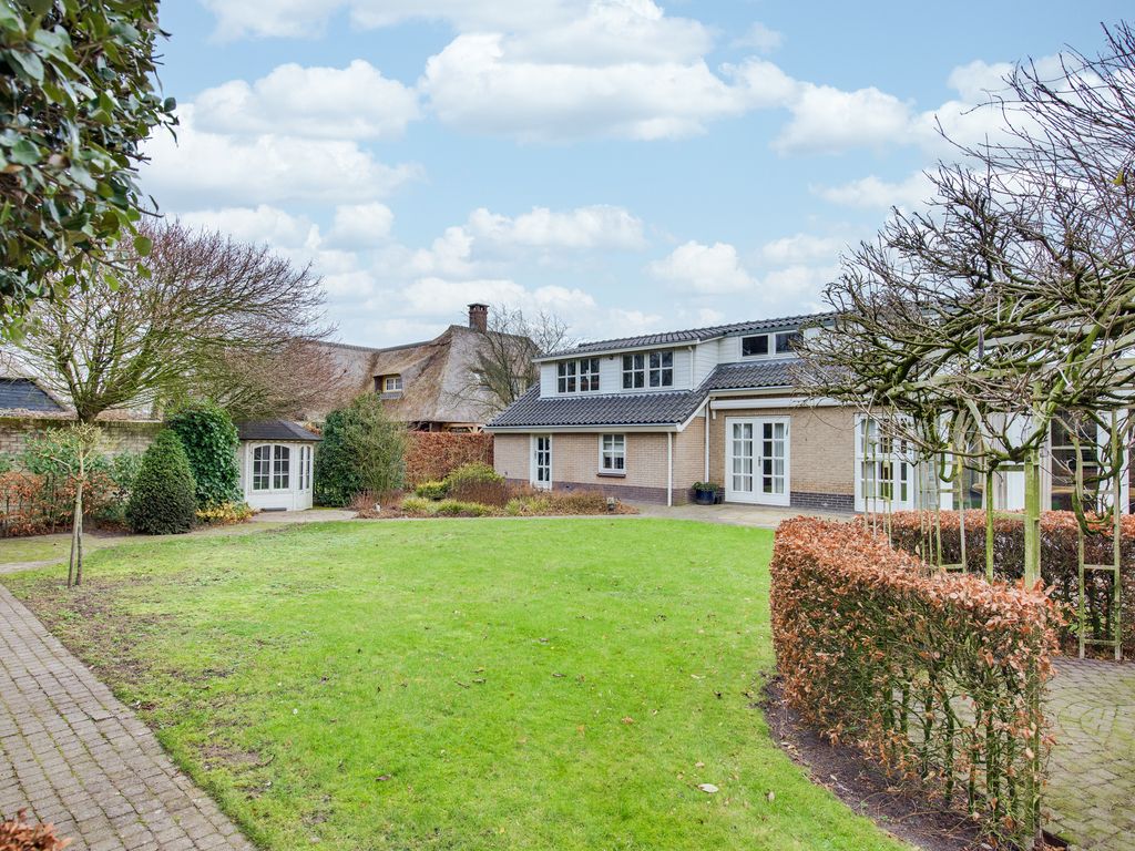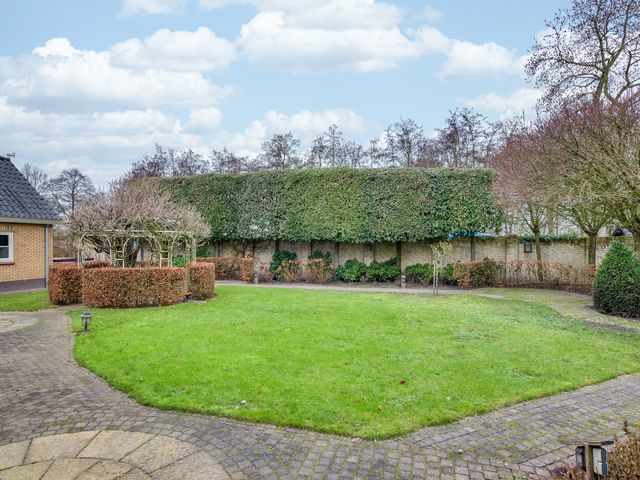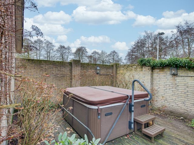 De keurig aangelegde voortuin vormt een mooi visitekaartje van de woning, met sierhekwerk, twee opritten en een verzorgd gazon. De achtertuin is minstens zo aantrekkelijk: groen, ruim en met meerdere gezellige zitplekken. Hier vind je tevens een houten tuinhuis.