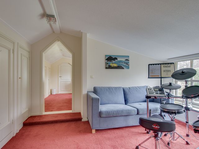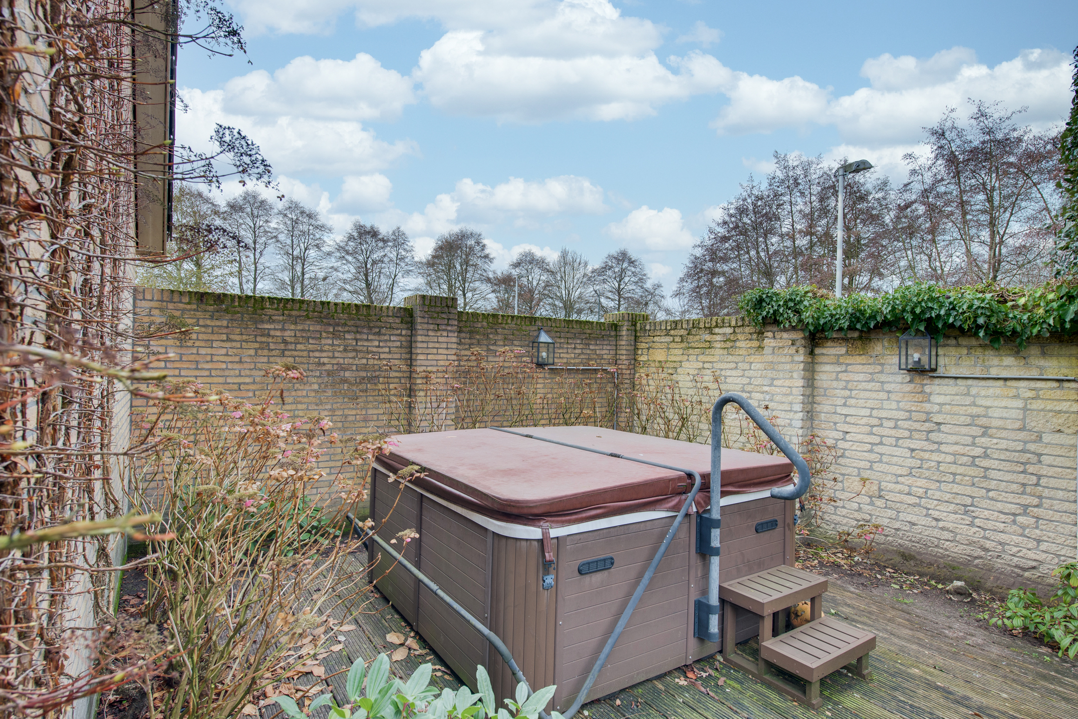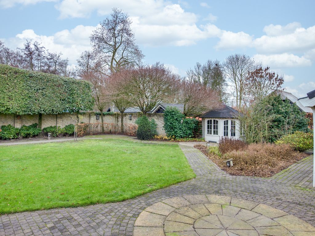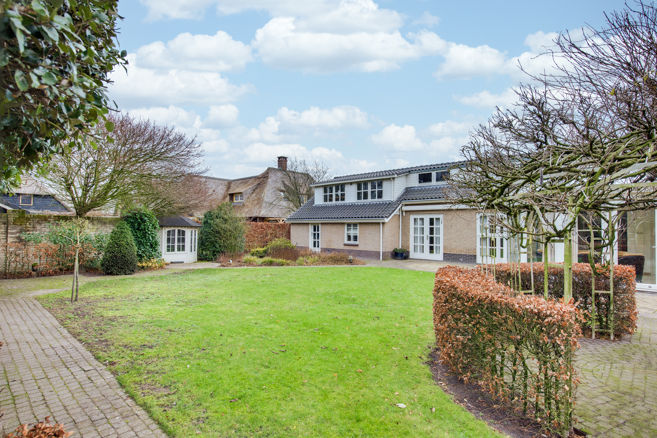 De keurig aangelegde voortuin vormt een mooi visitekaartje van de woning, met sierhekwerk, twee opritten en een verzorgd gazon. De achtertuin is minstens zo aantrekkelijk: groen, ruim en met meerdere gezellige zitplekken. Hier vind je tevens een houten tuinhuis.