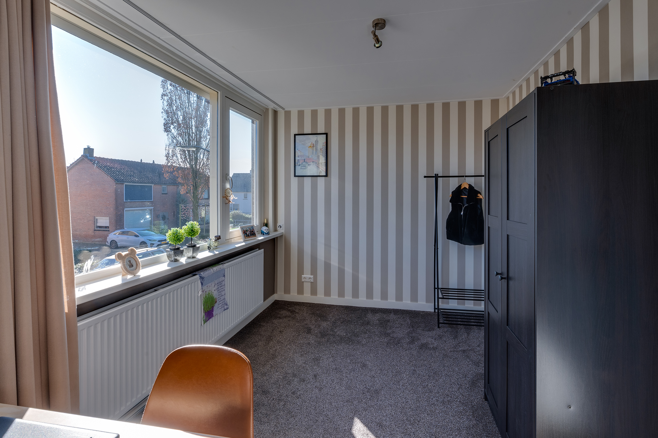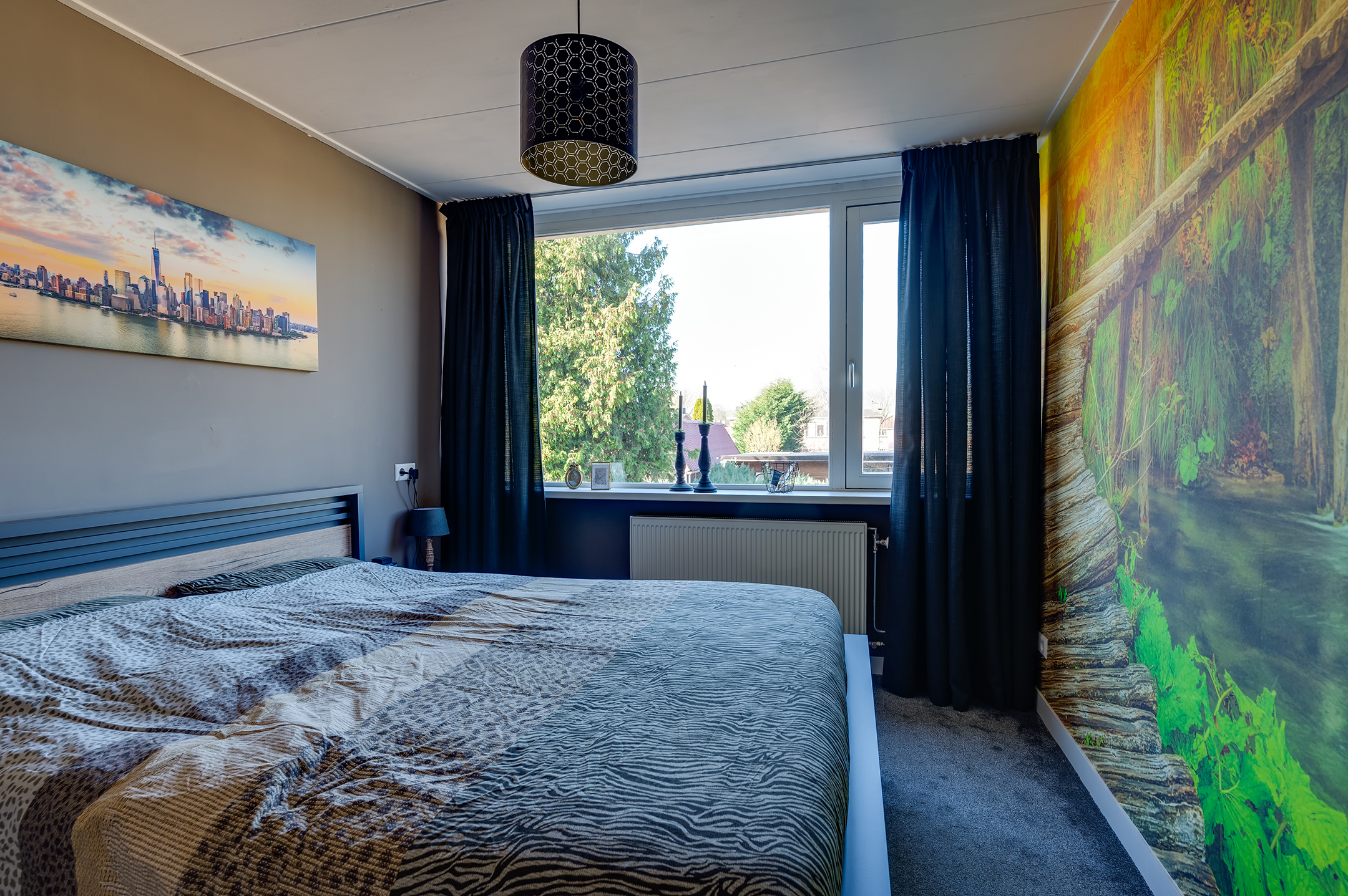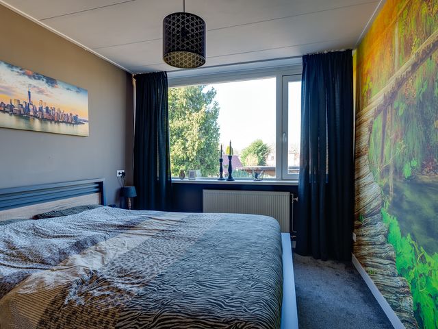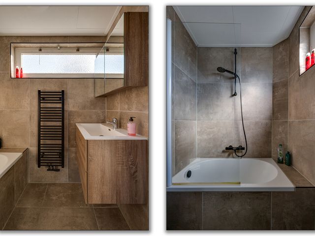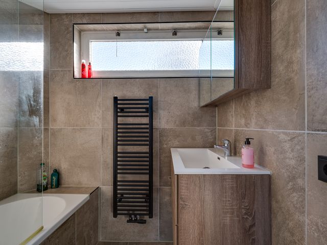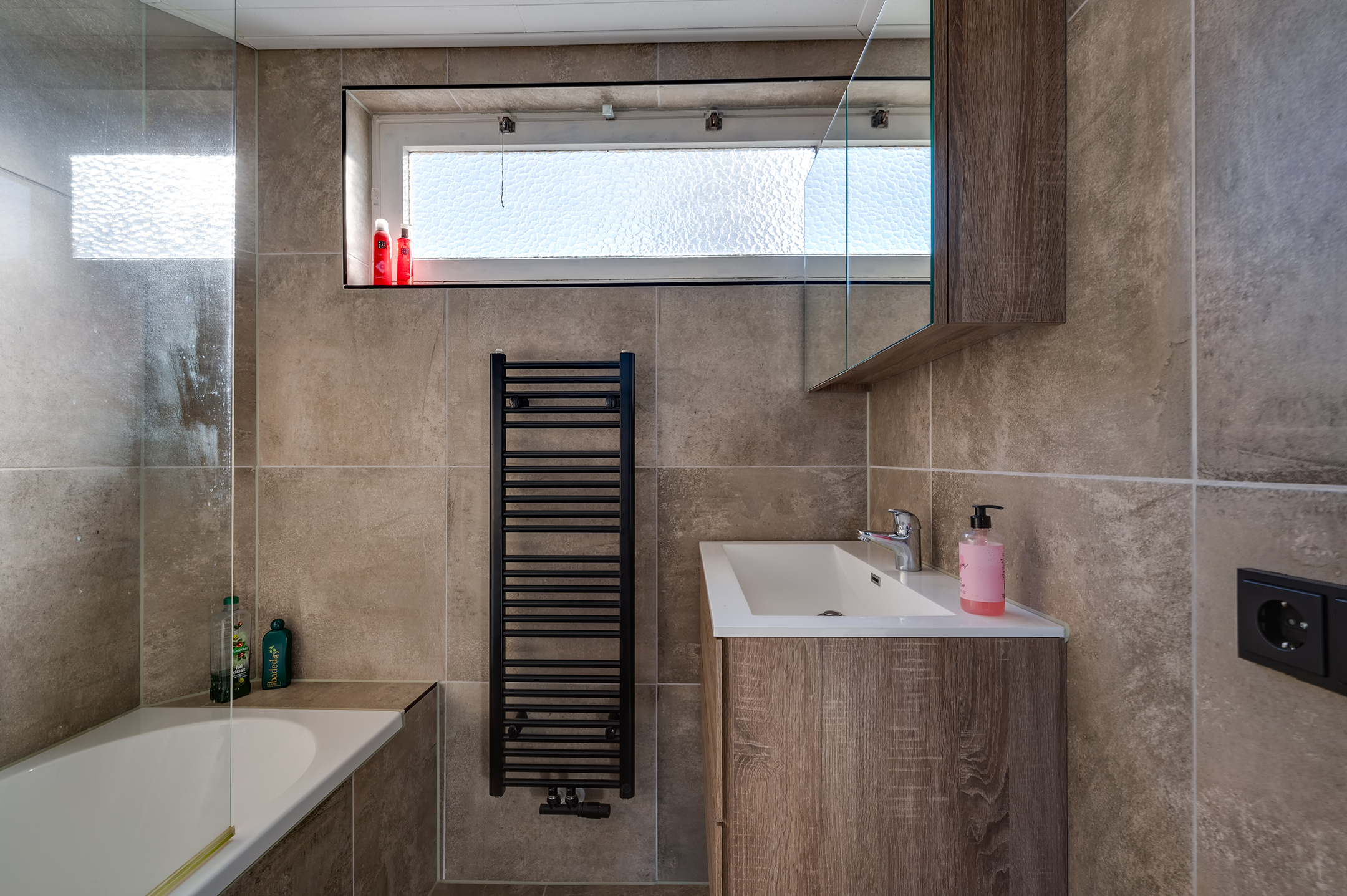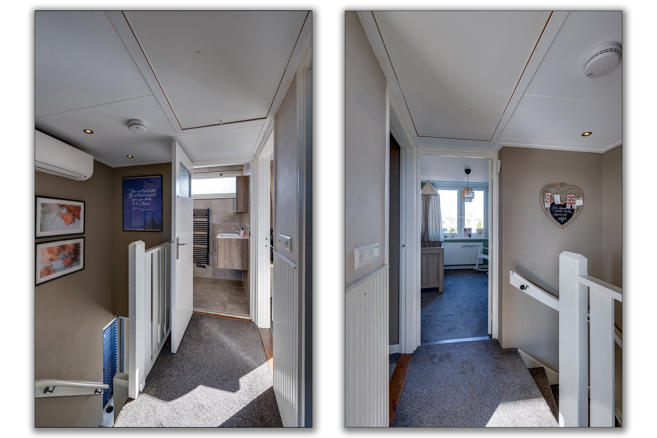 Slaapverdieping: overloop met vloerbedekking, airco unit en luik met vlizotrap naar de bergvliering. Opstelplaats CV-combiketel (ca. 2021). Er is een slaapkamer met vloerbedekking en vaste kast en 2 slaapkamers met vloerbedekking en behang. Geheel betegelde badkamer met ligbad, designradiator en wastafelmeubel.