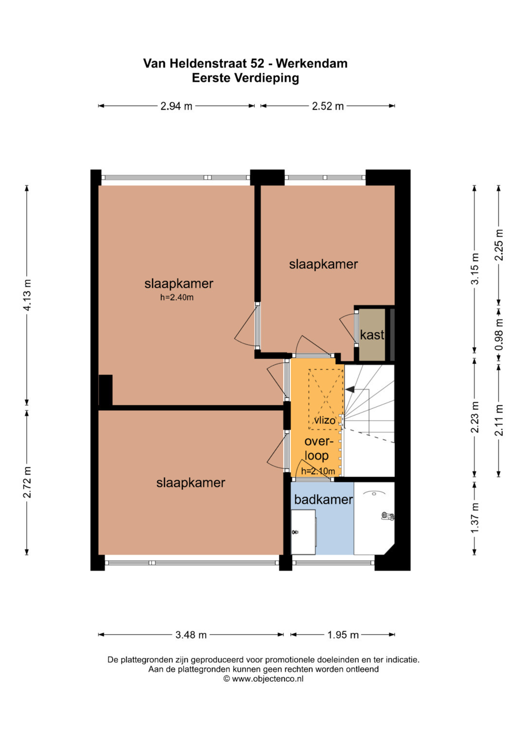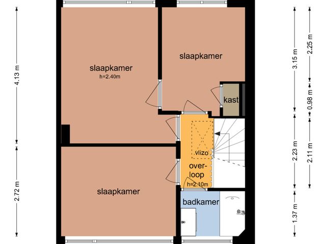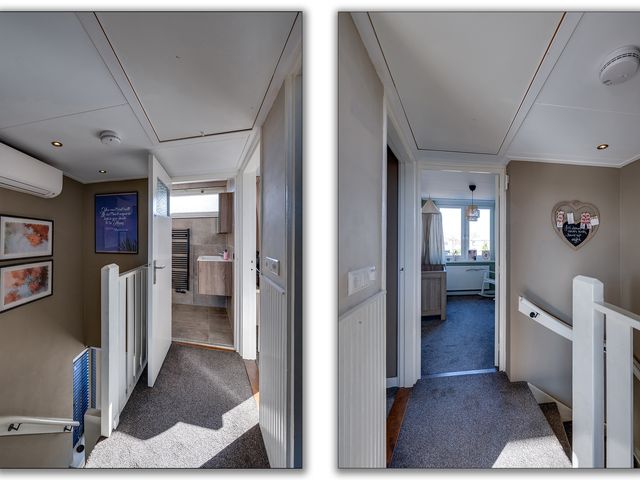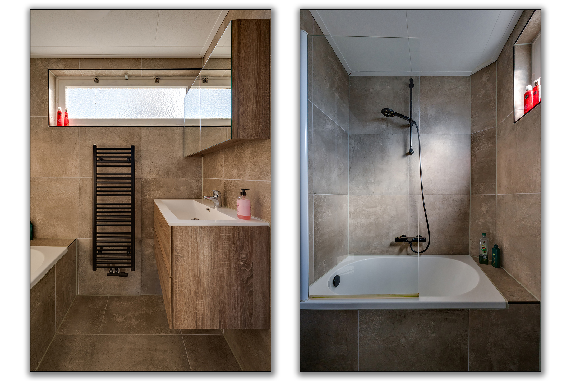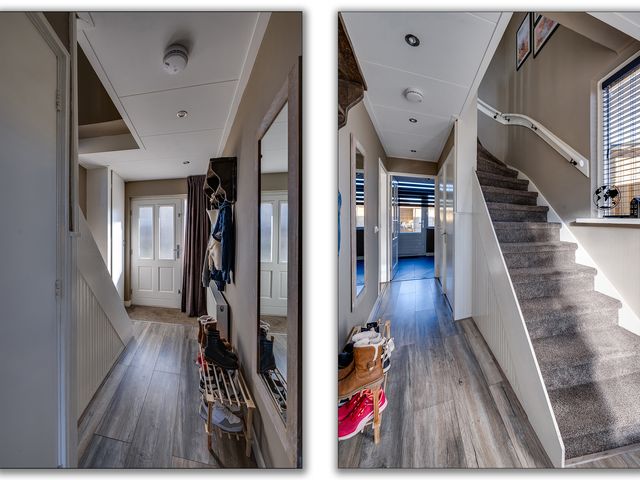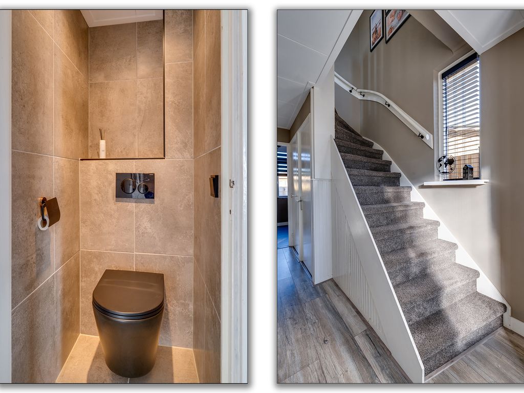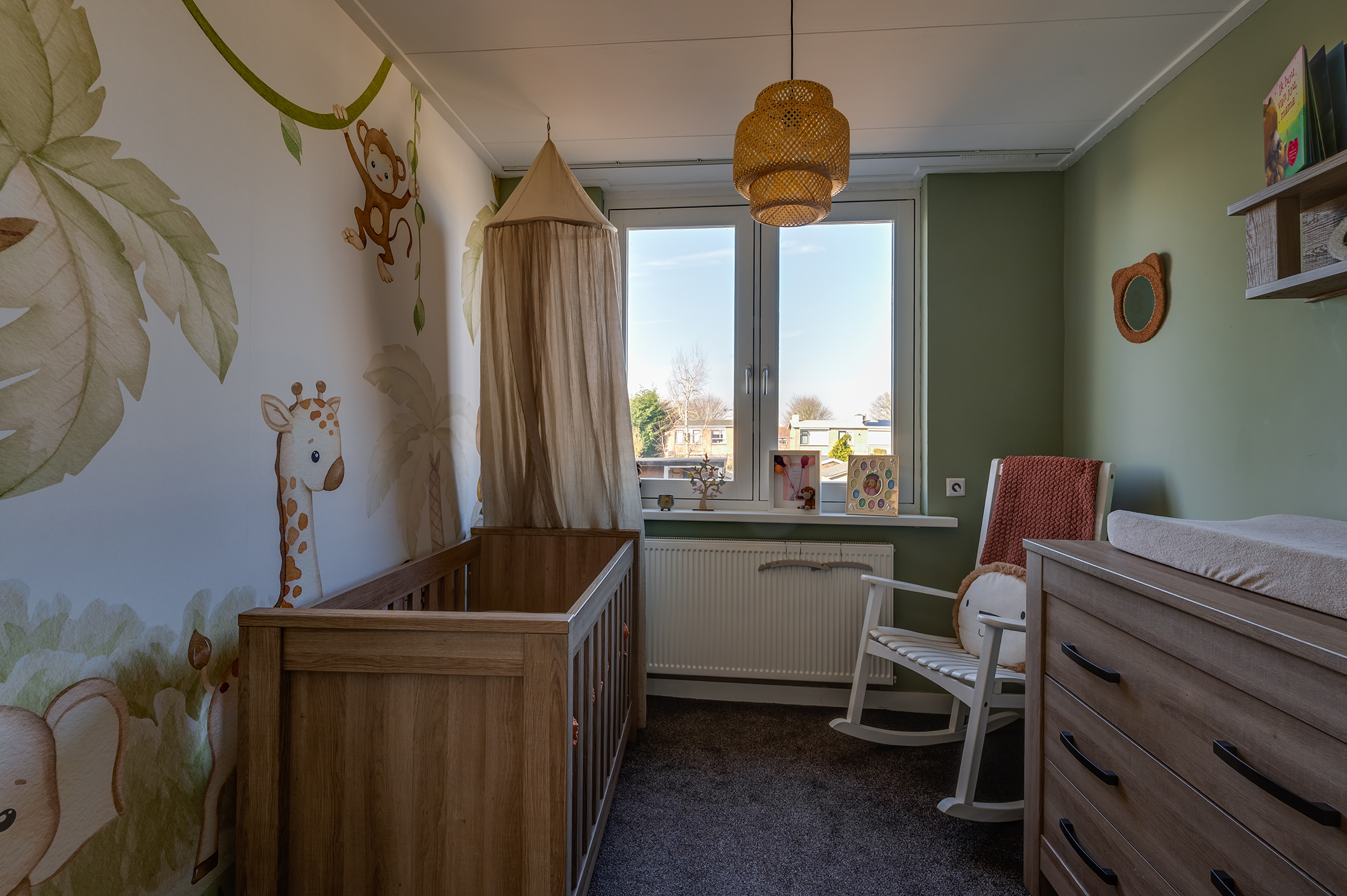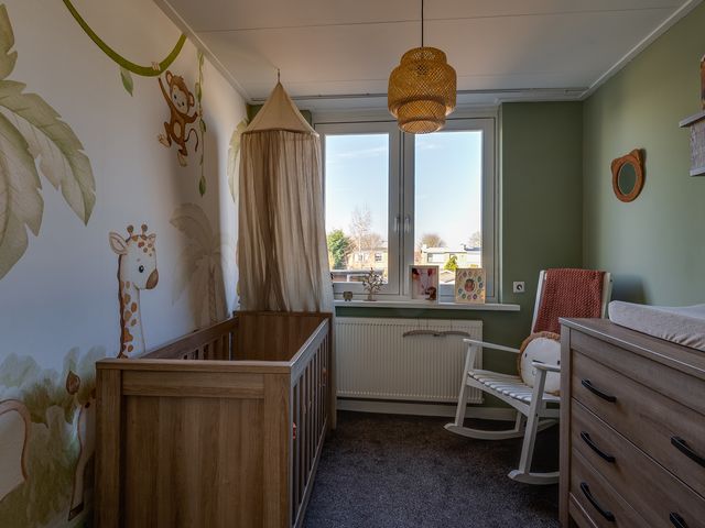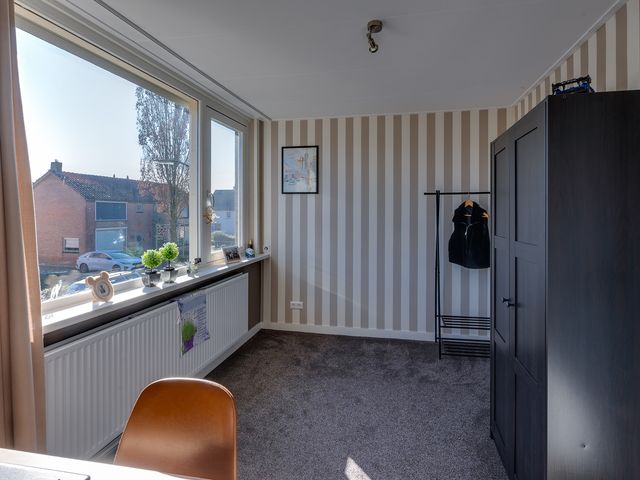 Slaapverdieping: overloop met vloerbedekking, airco unit en luik met vlizotrap naar de bergvliering. Opstelplaats CV-combiketel (ca. 2021). Er is een slaapkamer met vloerbedekking en vaste kast en 2 slaapkamers met vloerbedekking en behang. Geheel betegelde badkamer met ligbad, designradiator en wastafelmeubel.