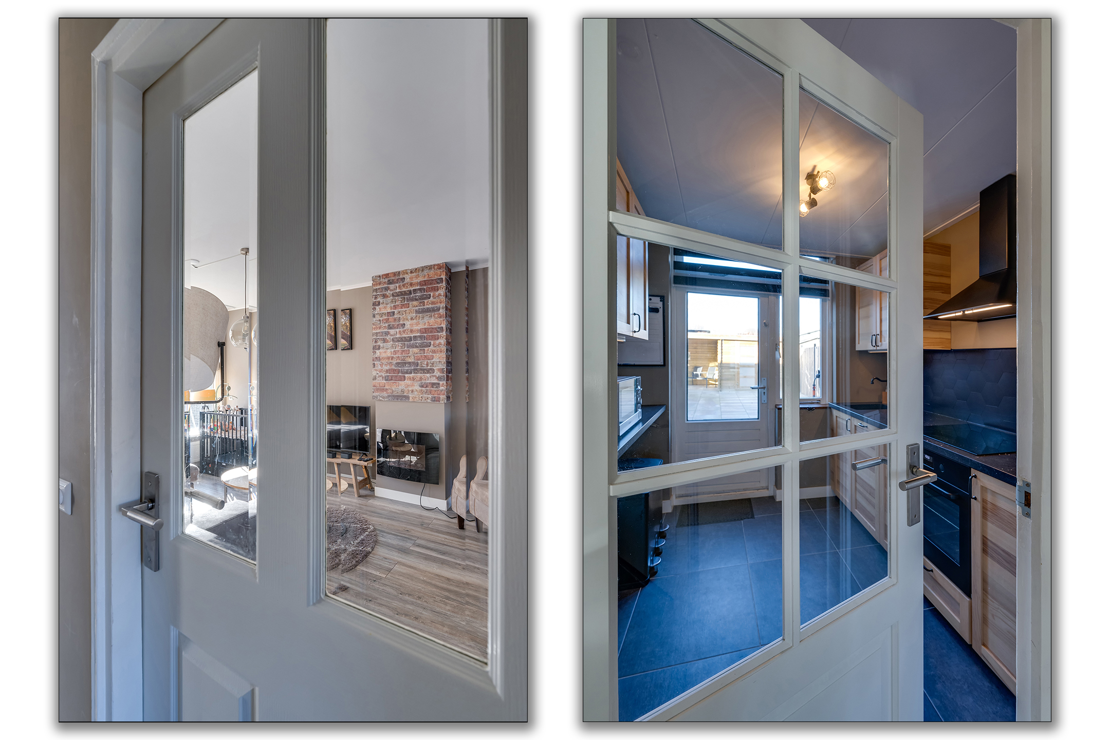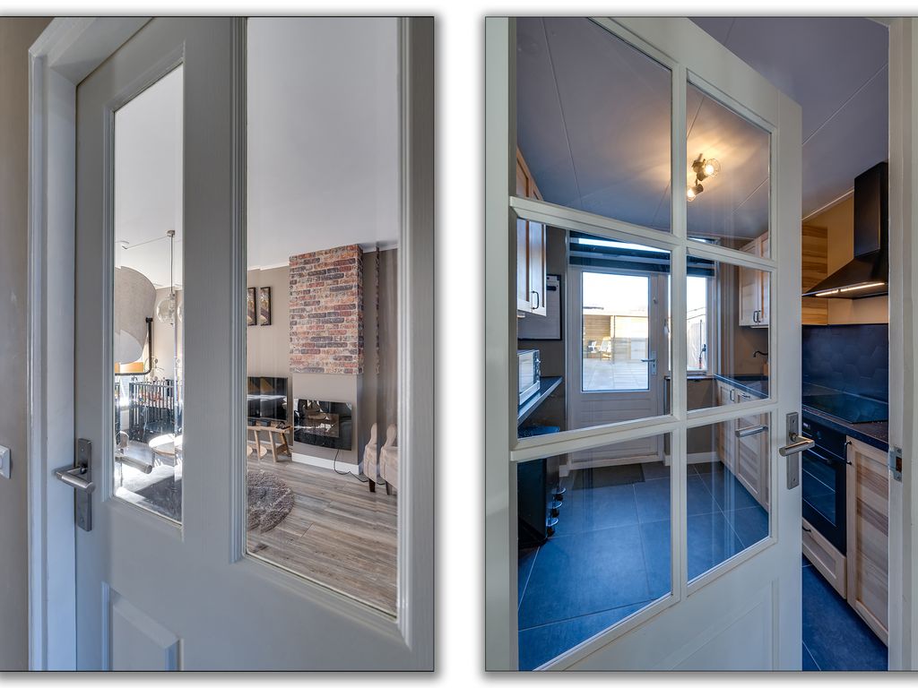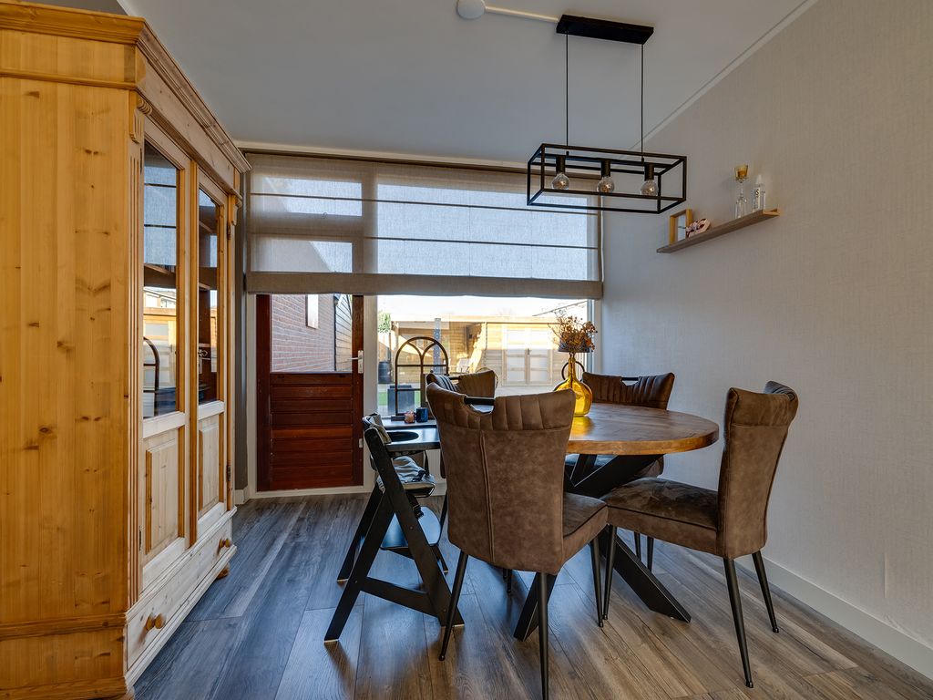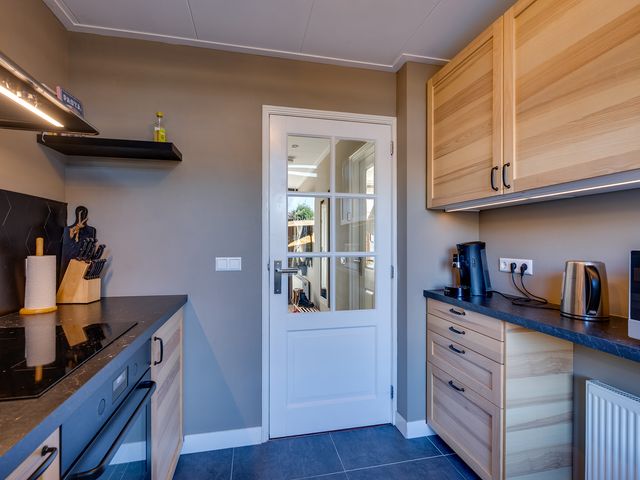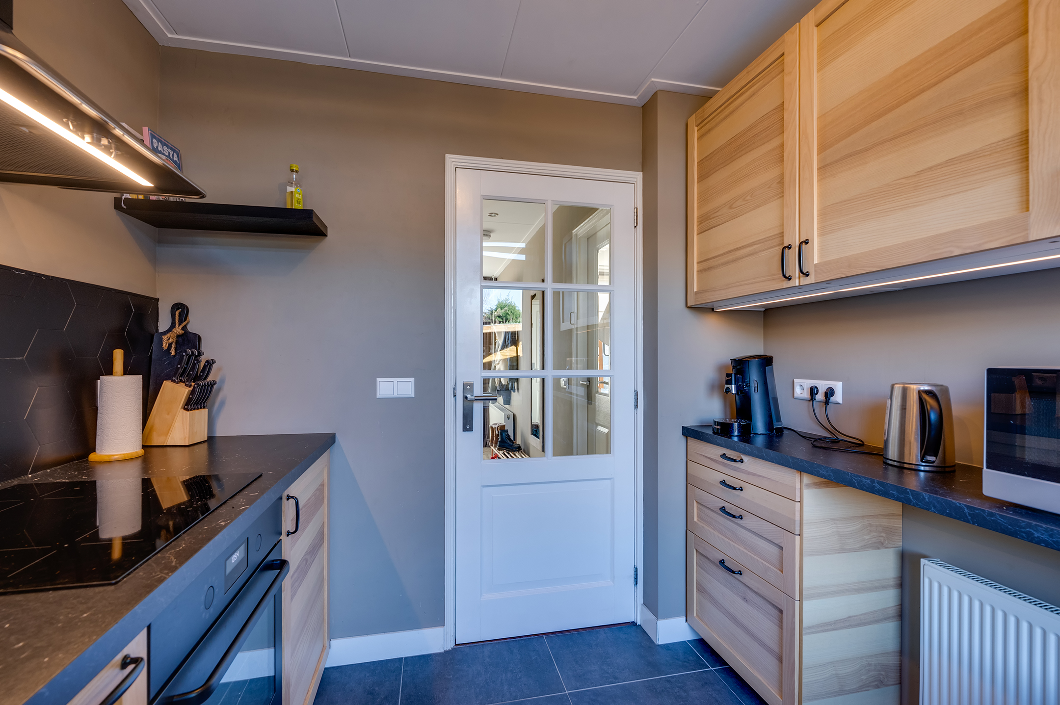 Begane grond: entree/hal met laminaatvloer, provisiekast, meterkast (nieuwe groepenkast uit ca. 2023 met 10 groepen, 3 aardlekschakelaars en krachtstroom), geheel betegelde toiletruimte met hangend toilet, woonkamer met laminaatvloer en elektrische haard, dichte keuken met tegelvloer en een net keukenblok met inbouwapparatuur, te weten: keramische kookplaat, afzuigkap, oven, koelkast en close-in boiler.