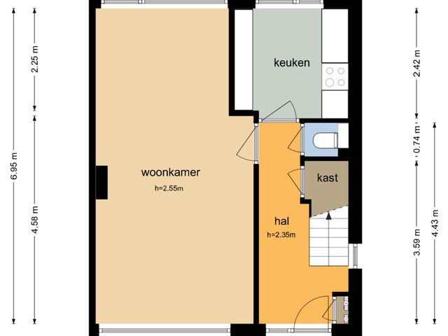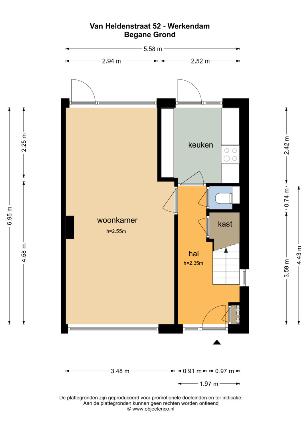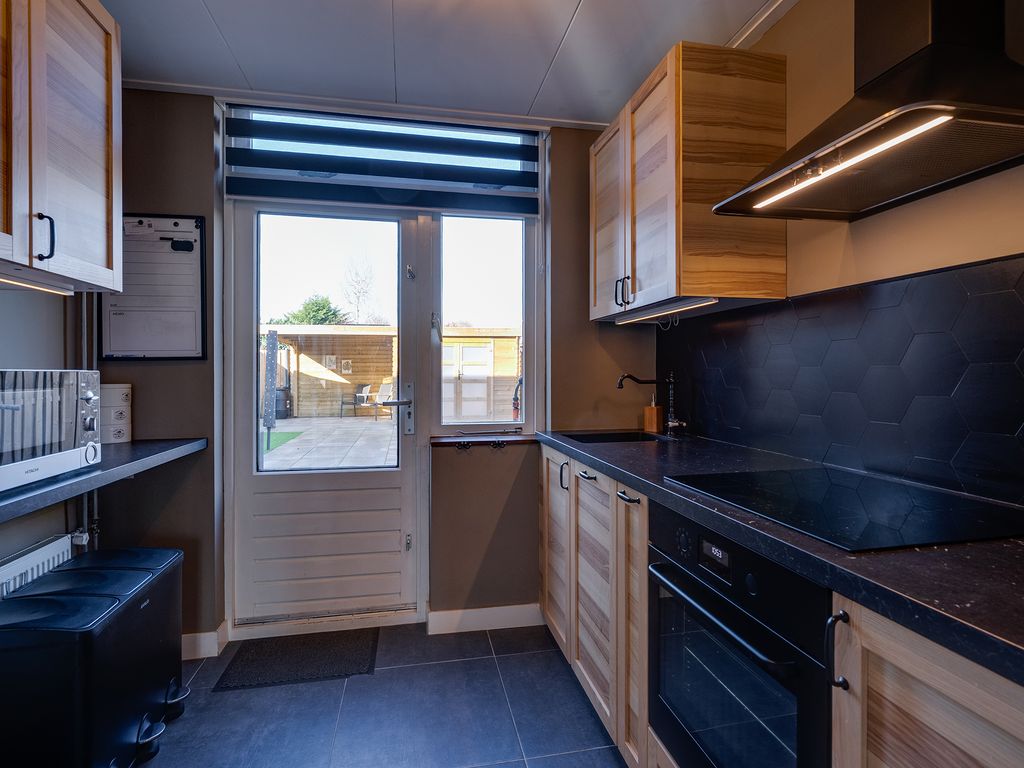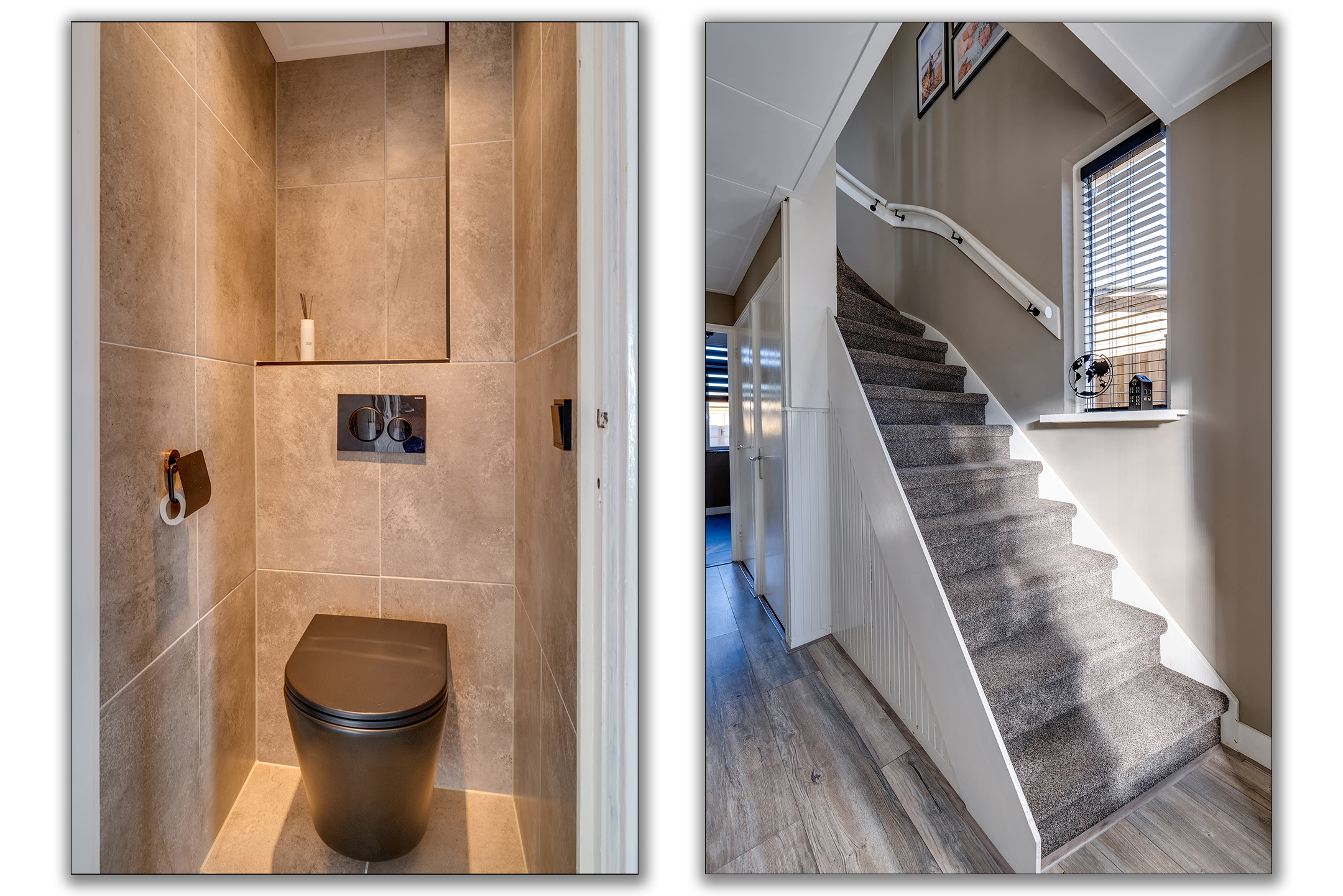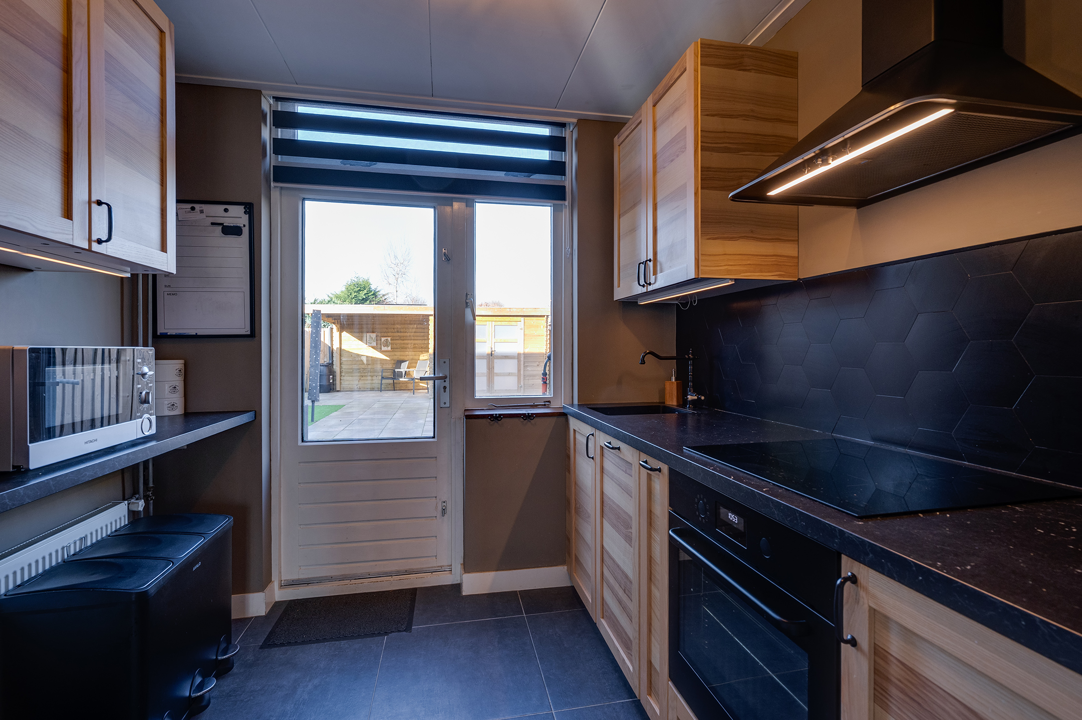 Begane grond: entree/hal met laminaatvloer, provisiekast, meterkast (nieuwe groepenkast uit ca. 2023 met 10 groepen, 3 aardlekschakelaars en krachtstroom), geheel betegelde toiletruimte met hangend toilet, woonkamer met laminaatvloer en elektrische haard, dichte keuken met tegelvloer en een net keukenblok met inbouwapparatuur, te weten: keramische kookplaat, afzuigkap, oven, koelkast en close-in boiler.