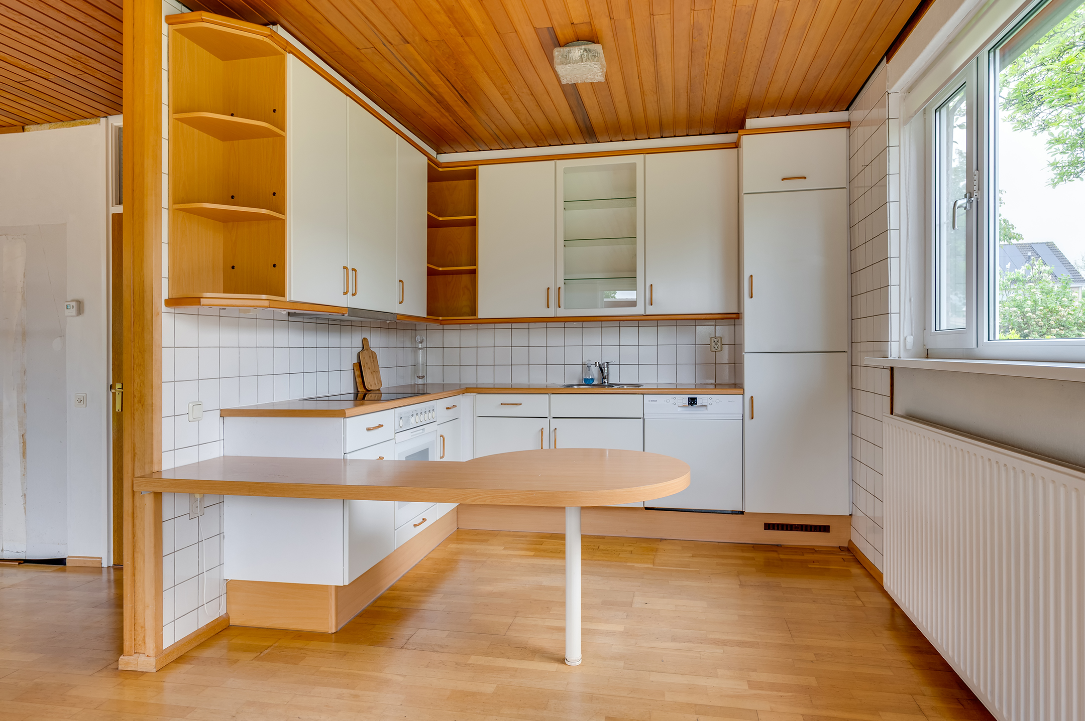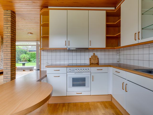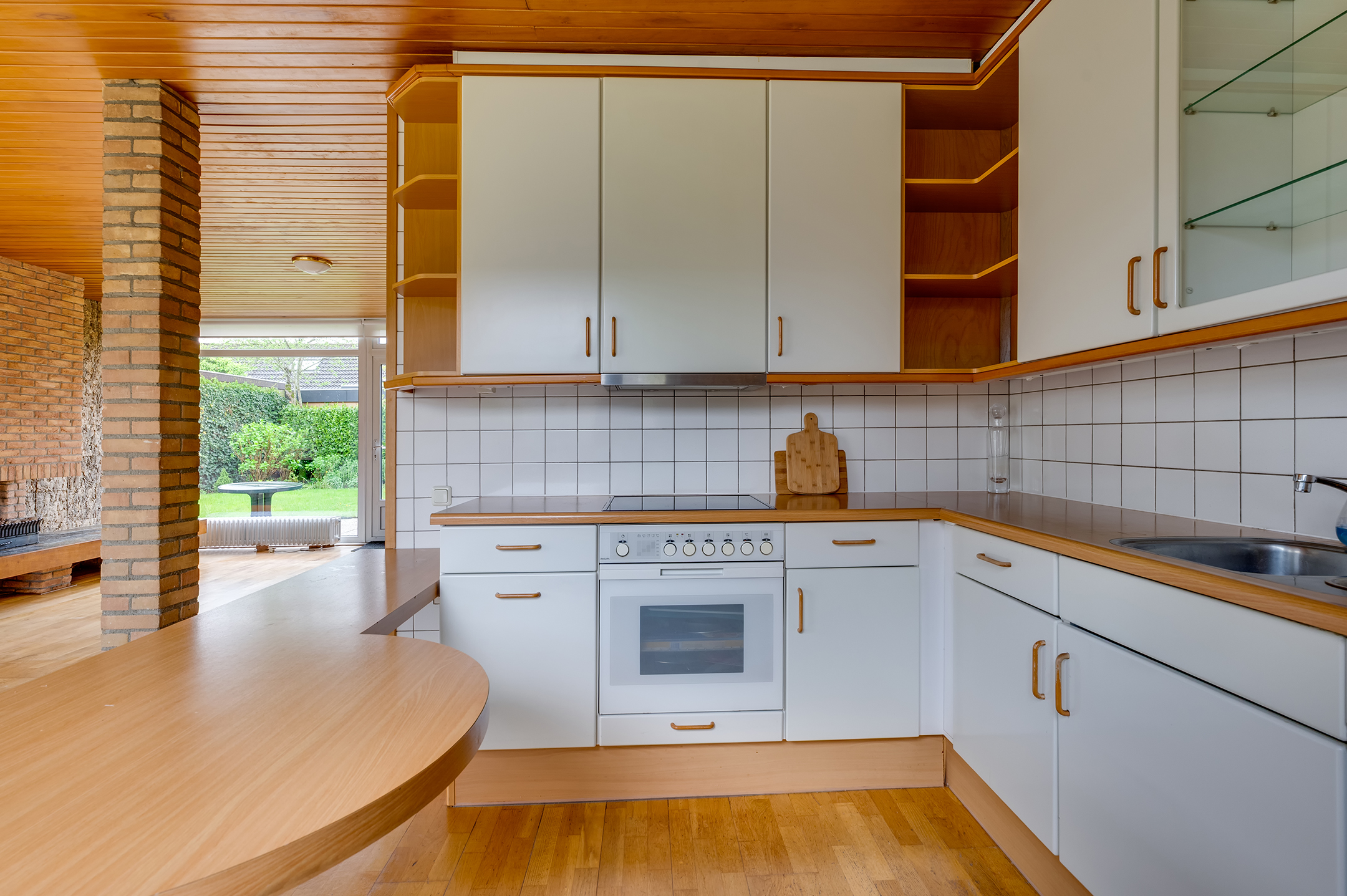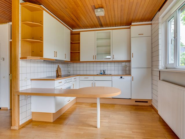 De woonkamer heeft een sfeervolle open haard met een kleine verhoging eromheen – perfect voor de winterse periode! De ruimte loopt over in de keuken, die wordt afgescheiden door een knus barretje. De keuken is voorzien van alle gemakken: een keramische kookplaat, oven, afzuigkap, spoelbak en een vriezer.