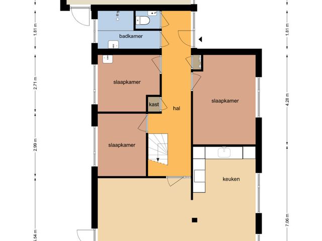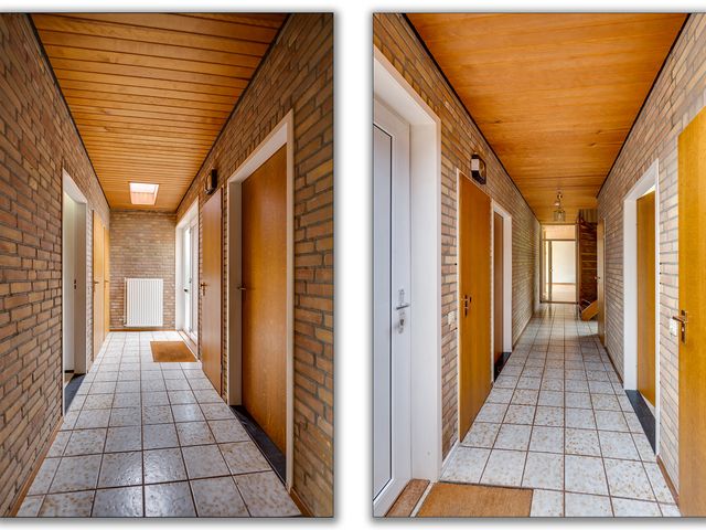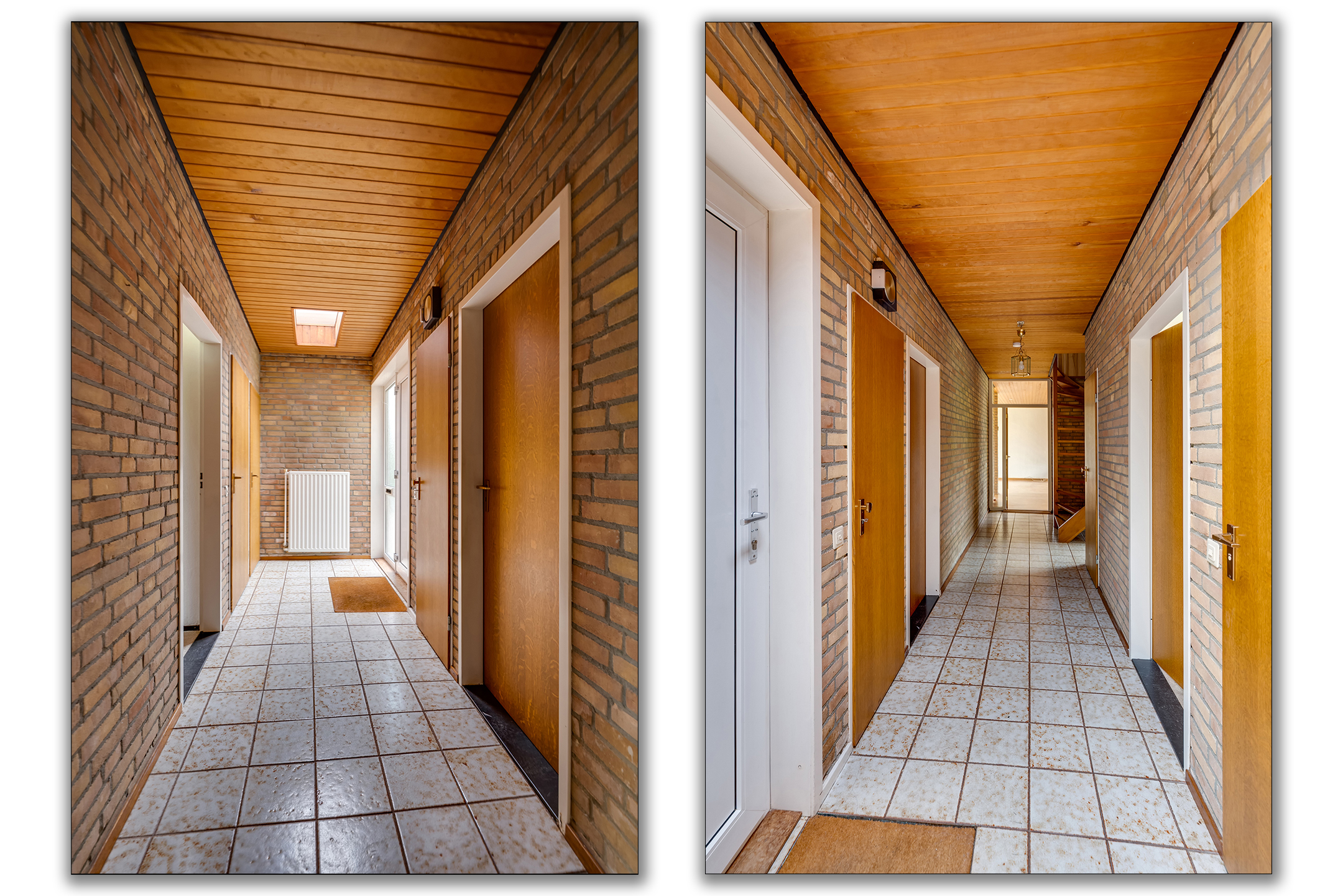 Bij binnenkomst sta je in de hal die toegang geeft tot de badkamer, het aparte toilet, drie slaapkamers en natuurlijk de woonkamer.