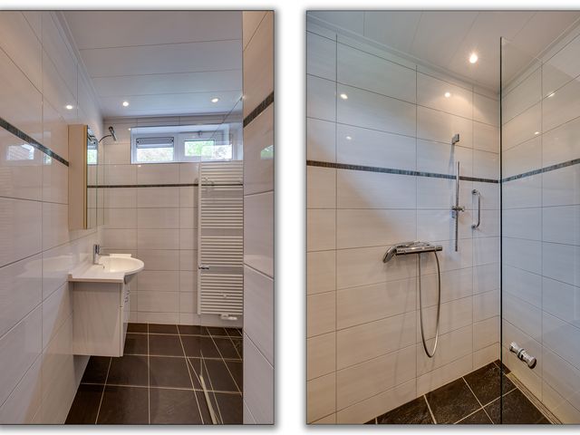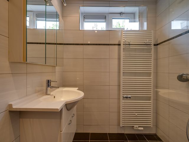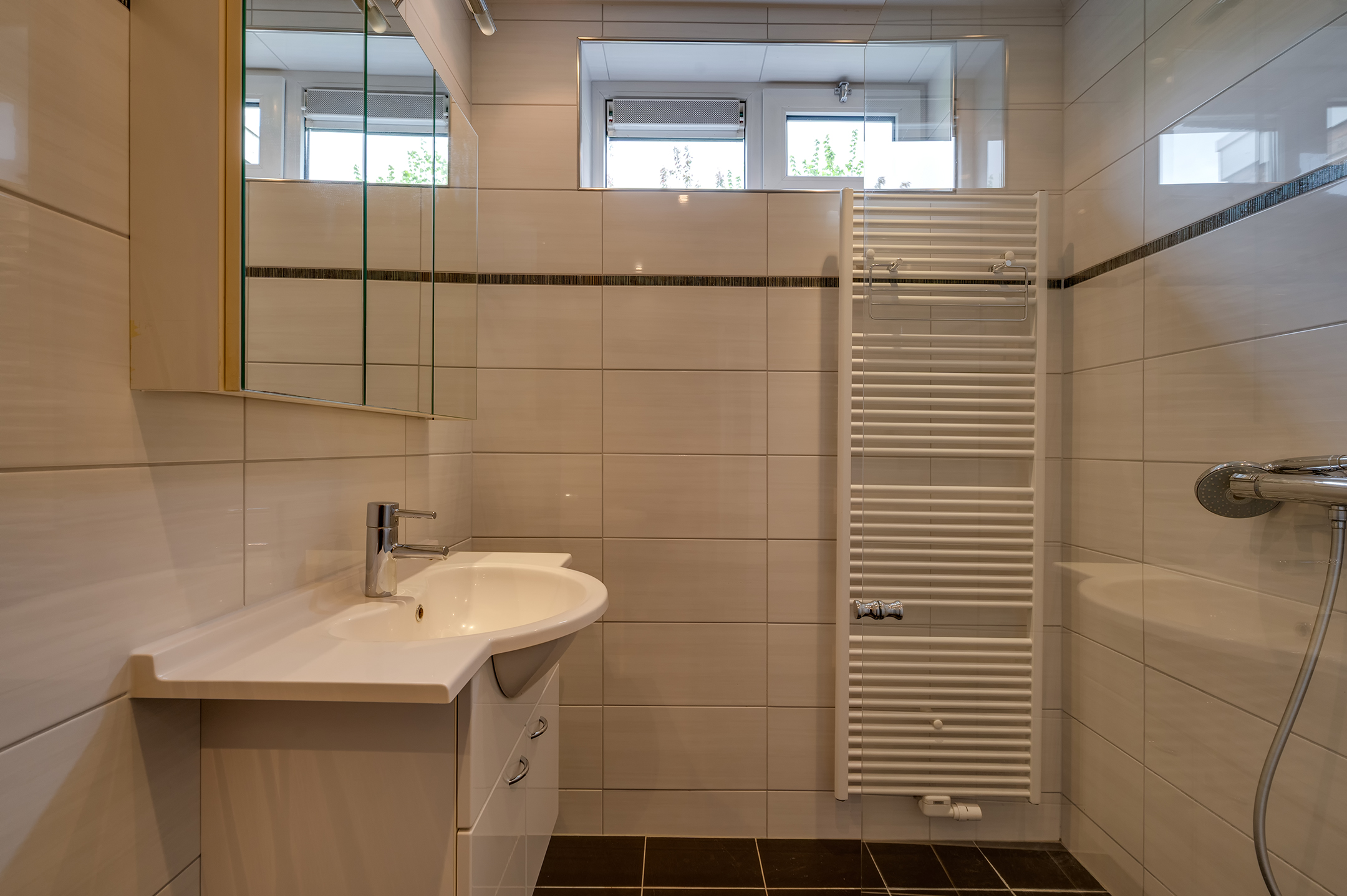 De badkamer is voorzien van een douche, wastafelmeubel en een designradiator.