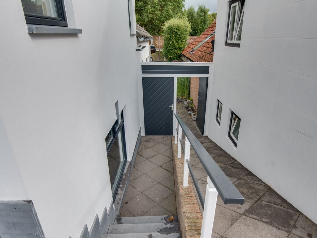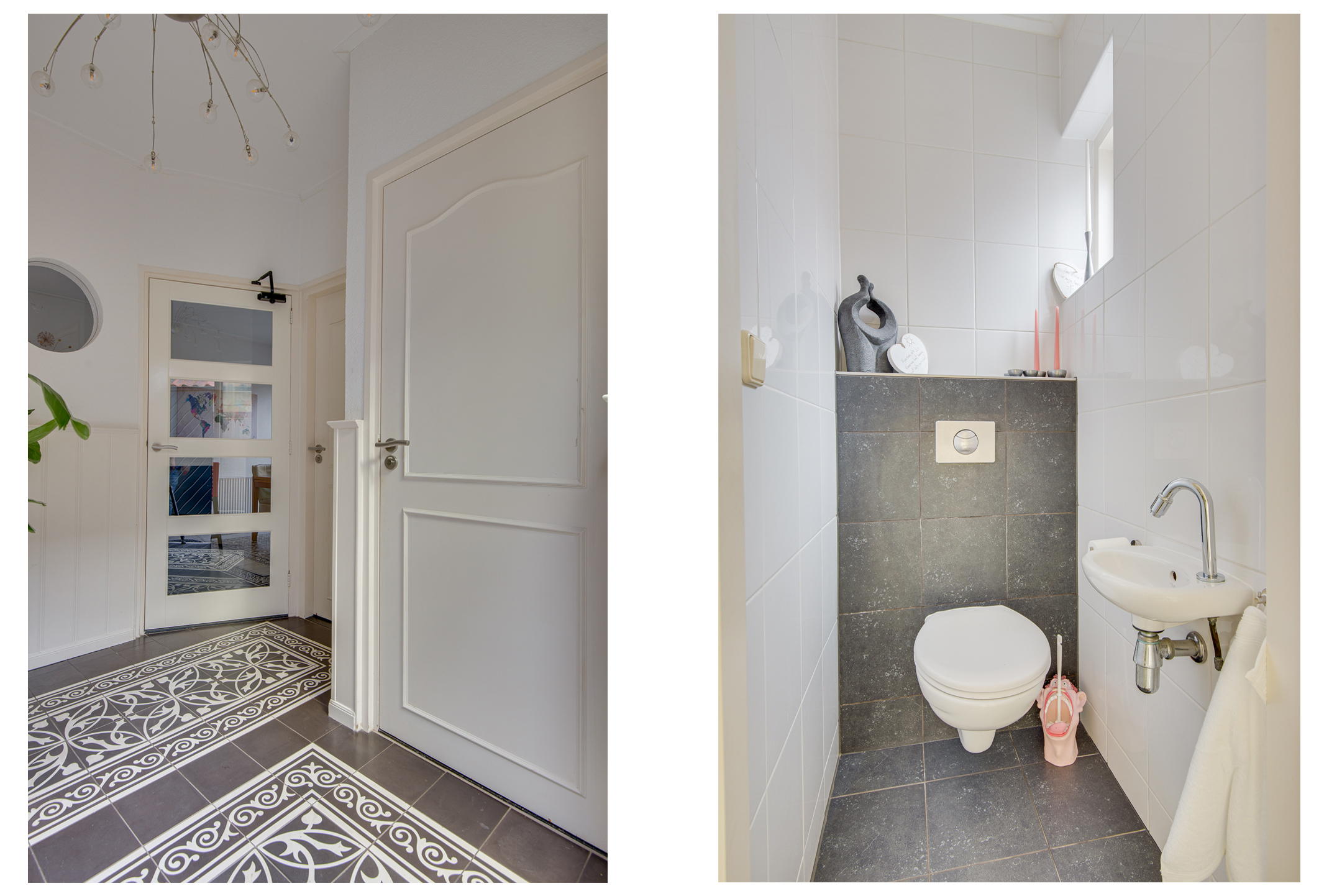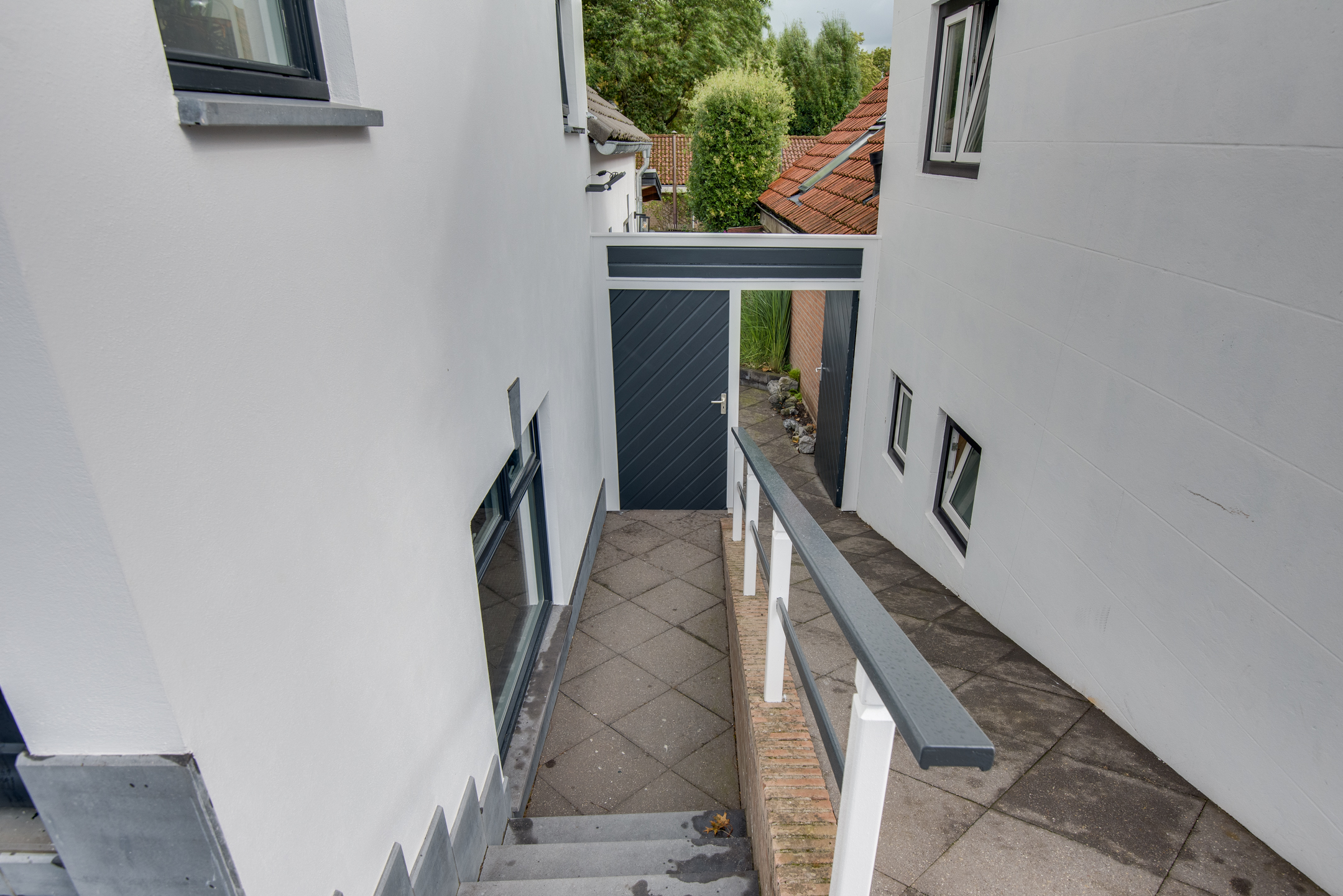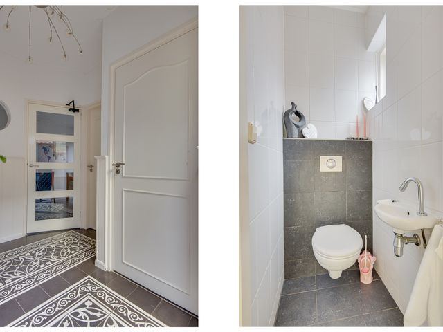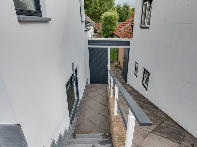 De begane grond is bereikbaar via de trap vanaf dijkniveau, maar ook via een handige zij-ingang. Door de poort langs het huis kom je binnen in een ruime hal met toilet. Deze hal geeft toegang tot de tweede woonkamer, de keuken en de badkamer.