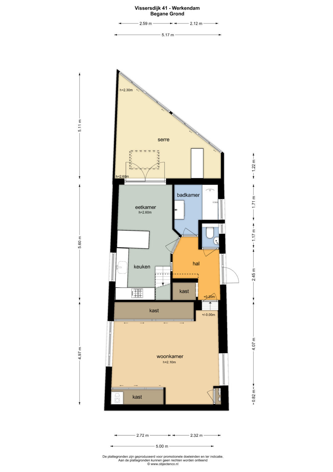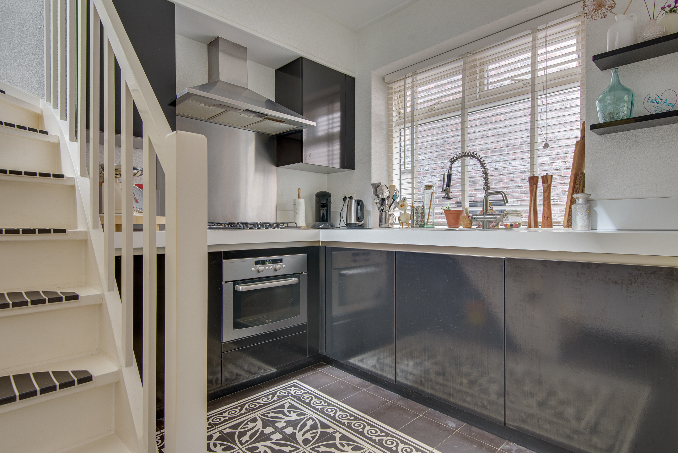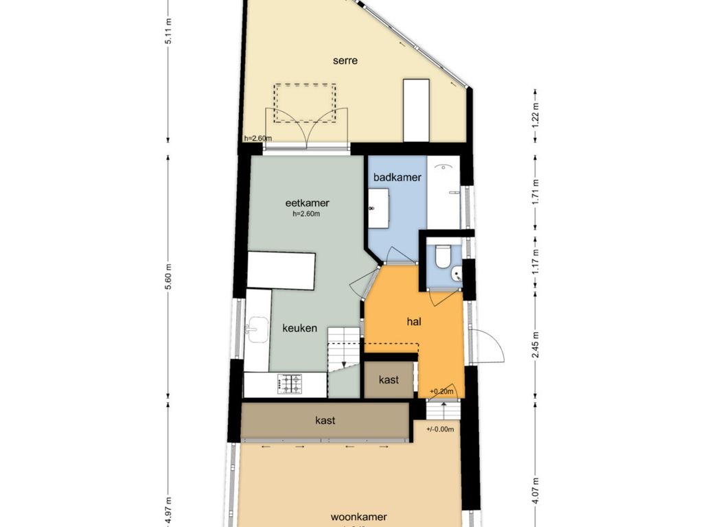 De begane grond is bereikbaar via de trap vanaf dijkniveau, maar ook via een handige zij-ingang. Door de poort langs het huis kom je binnen in een ruime hal met toilet. Deze hal geeft toegang tot de tweede woonkamer, de keuken en de badkamer.