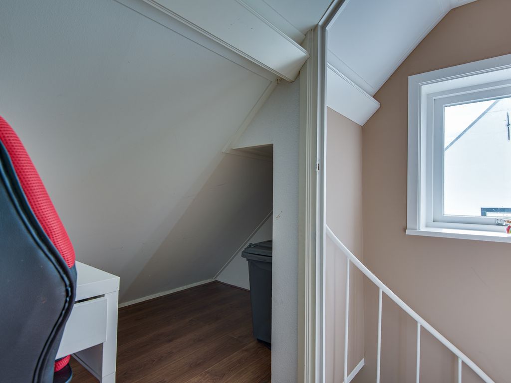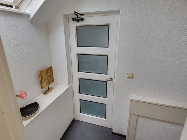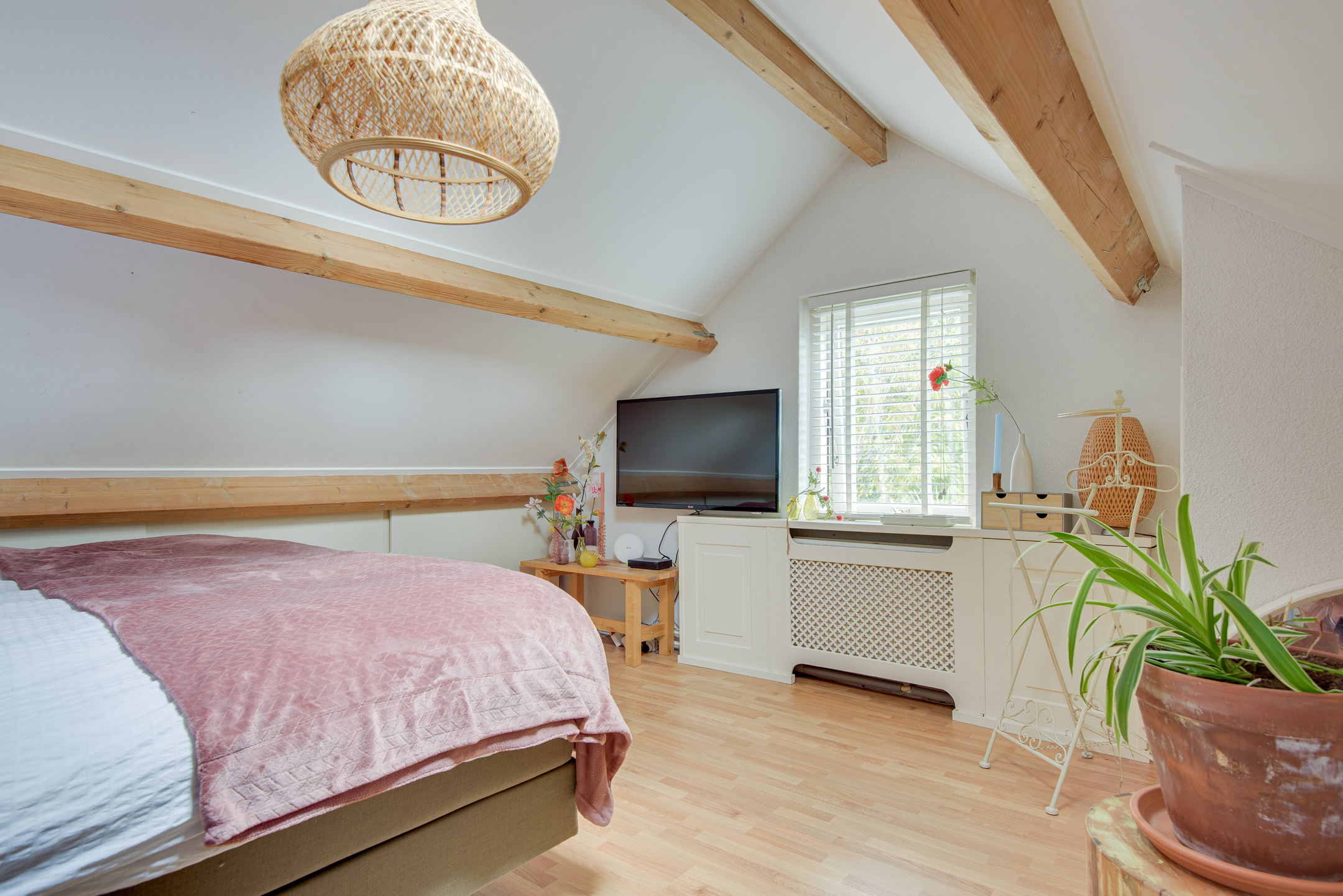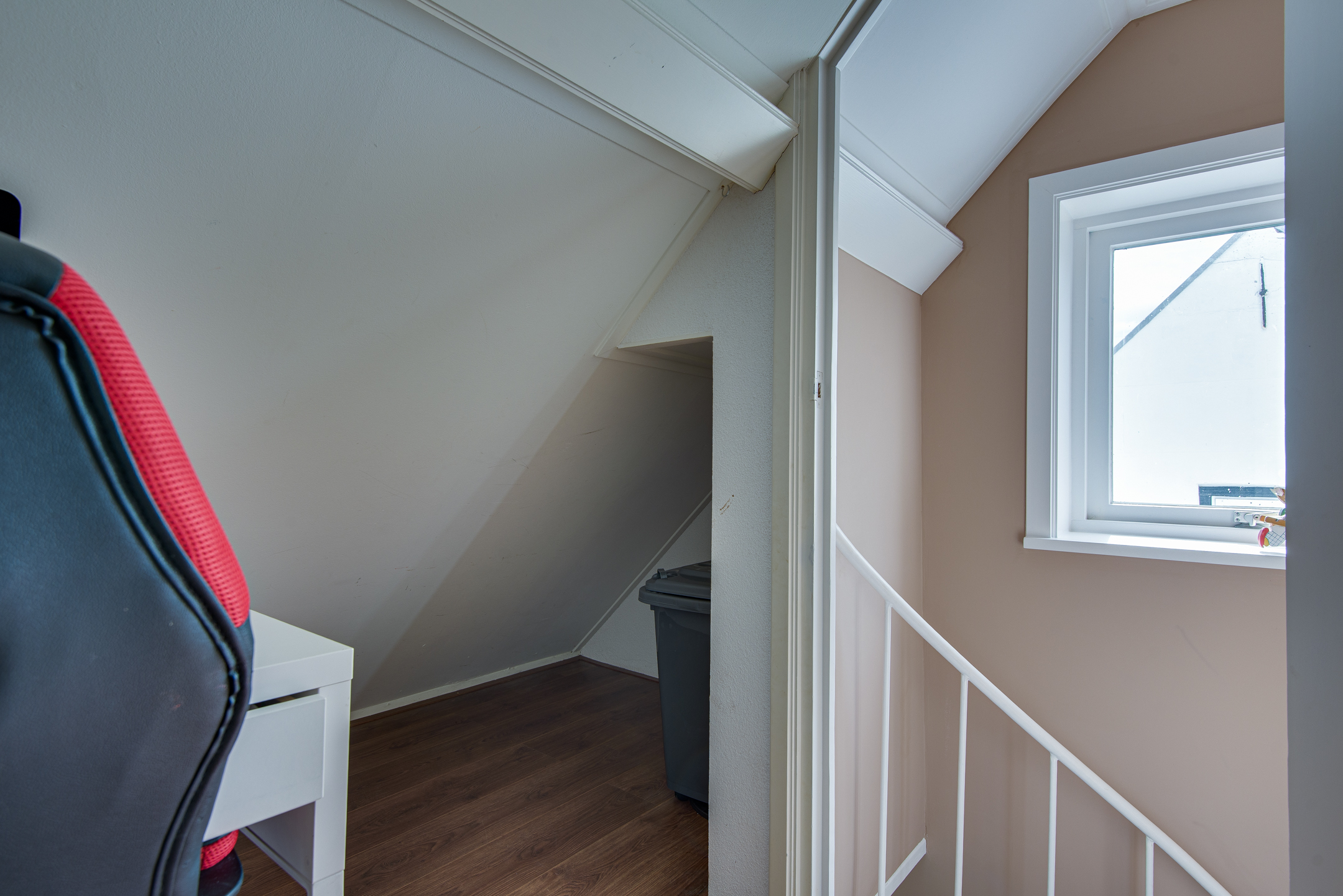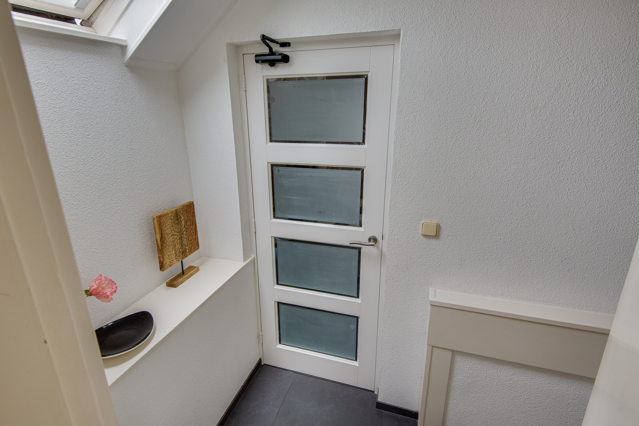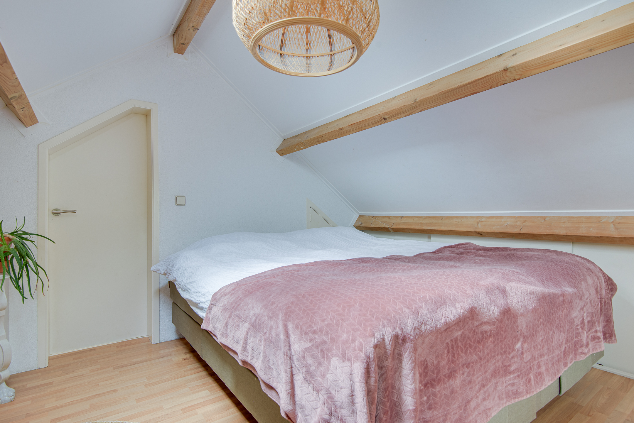 Op de deze verdieping vind je ook een royale slaapkamer. Vanaf de overloop kun je via de trap naar beneden, richting de begane grond.