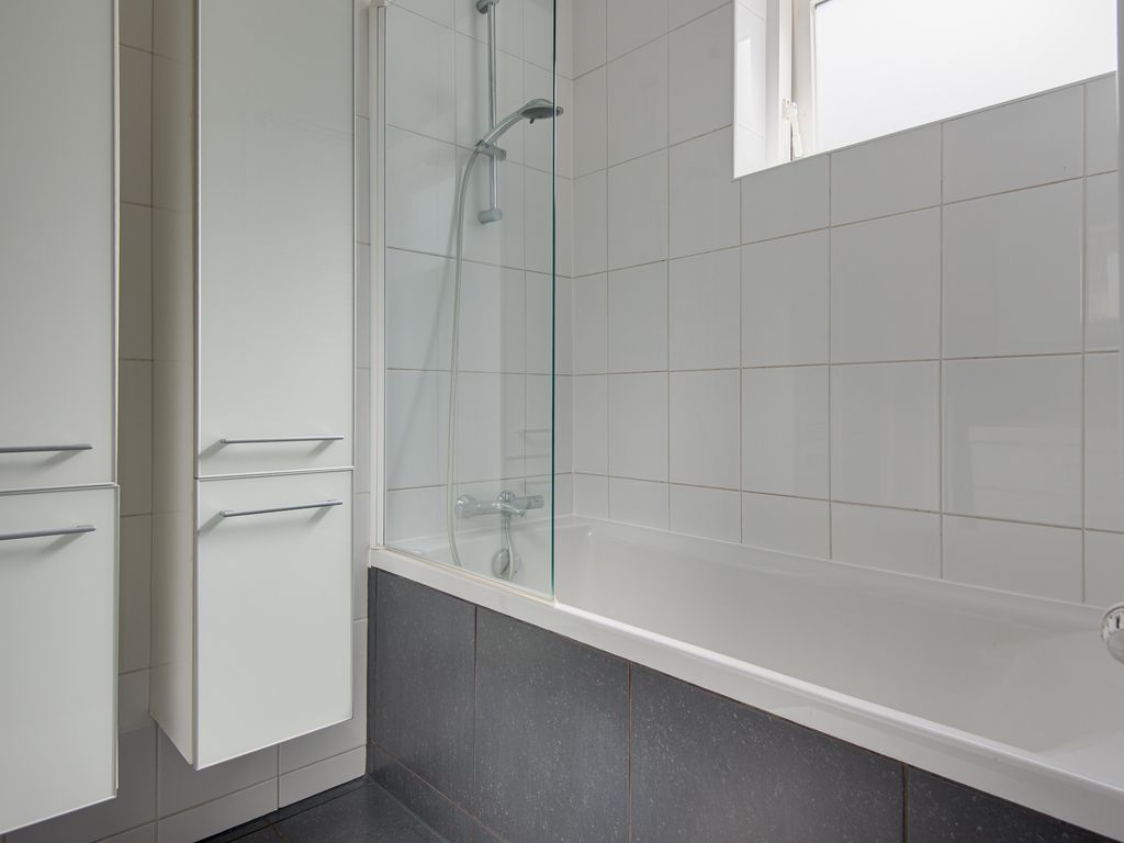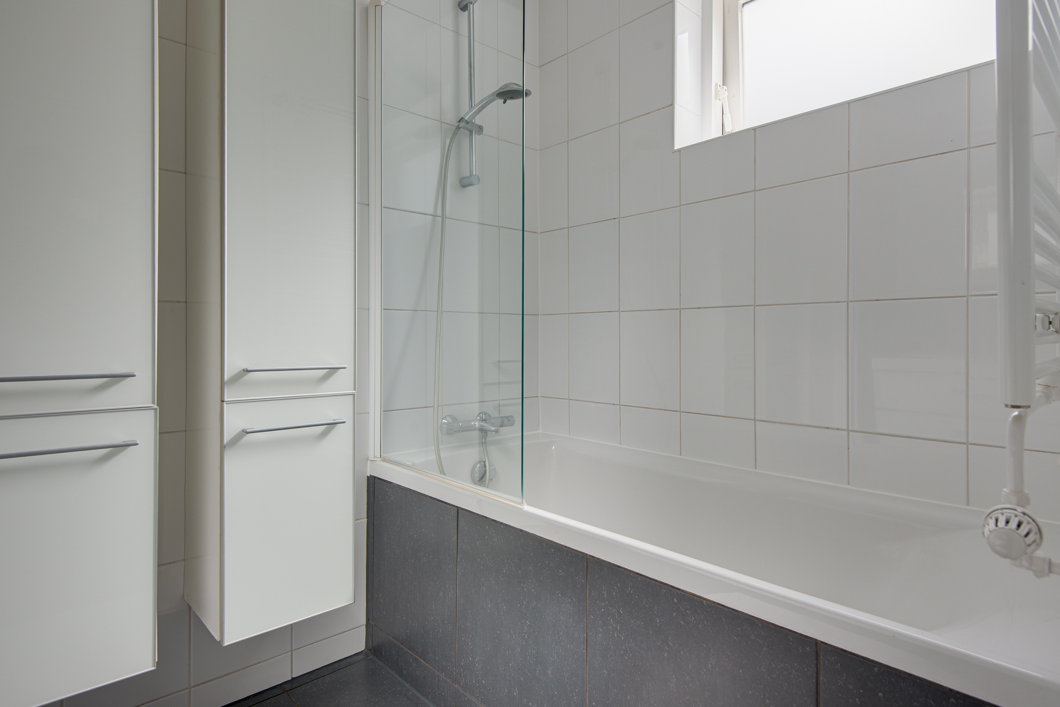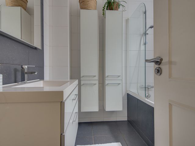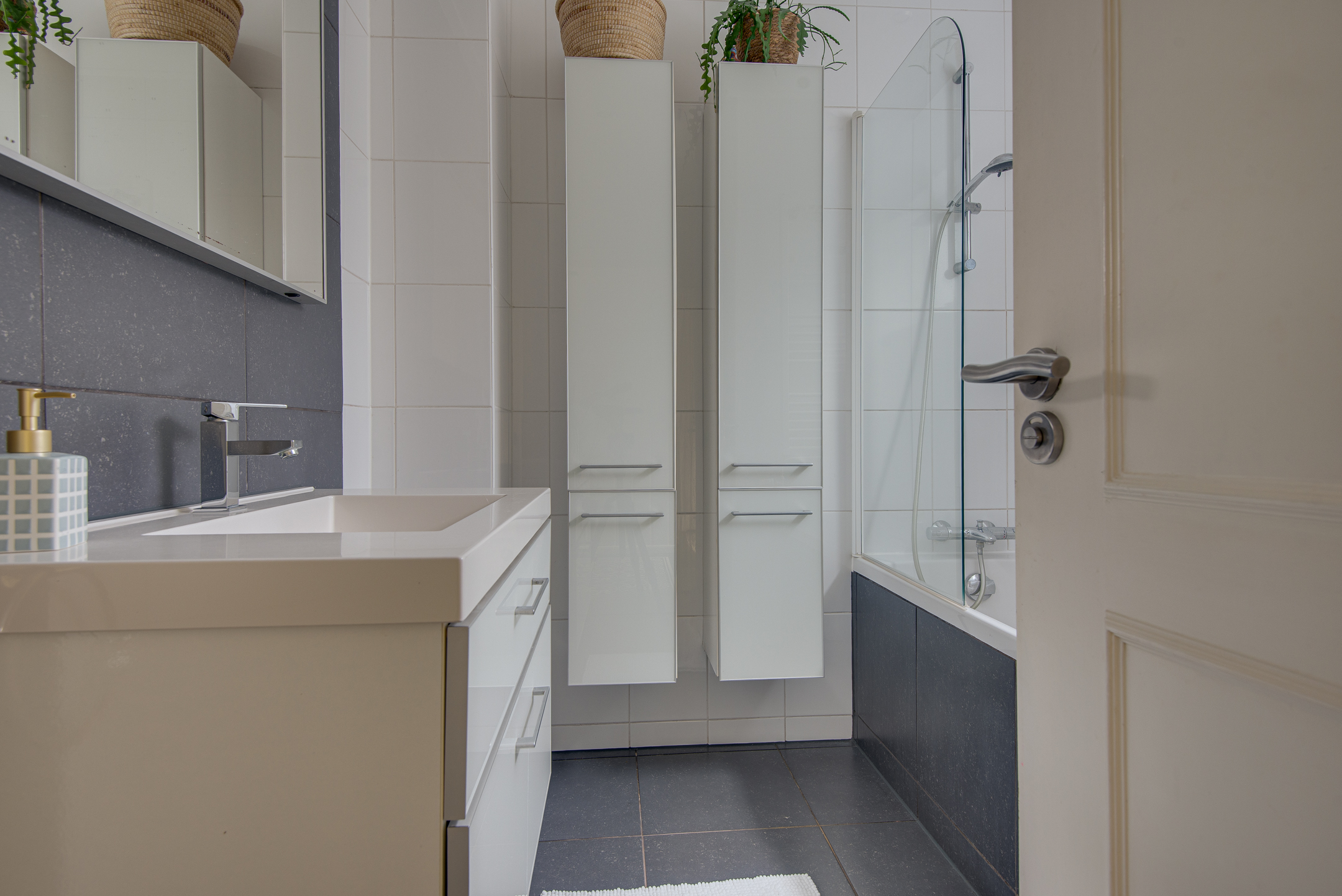 De badkamer is compact maar praktisch, met een wastafelmeubel en een ligbad met douchefunctie.
