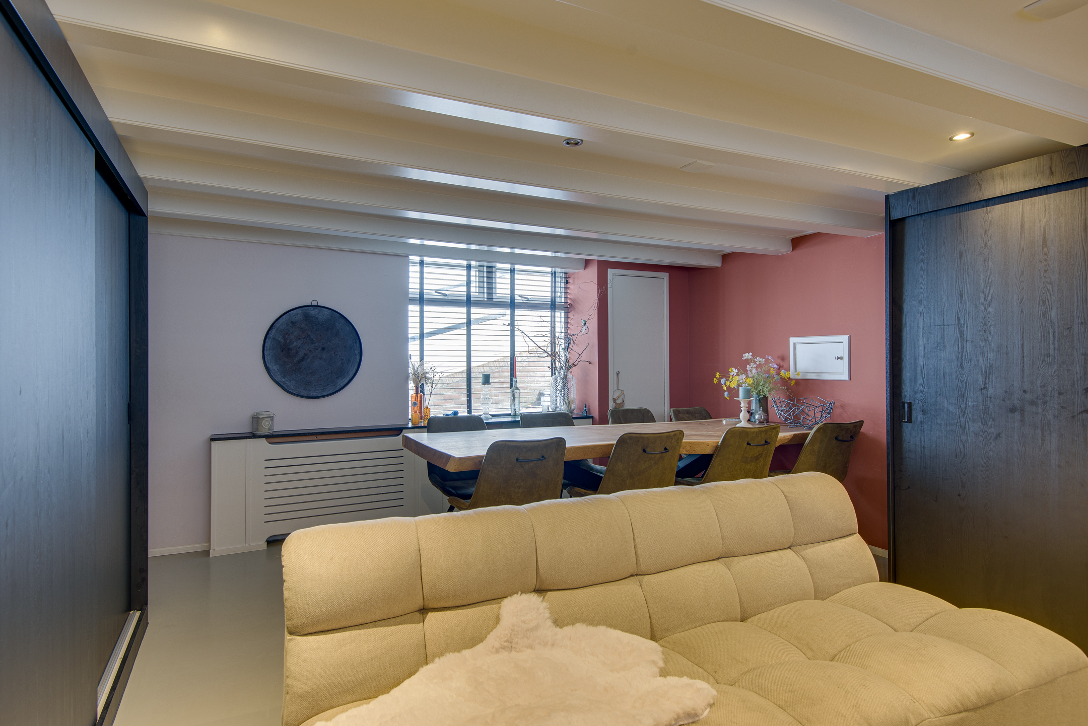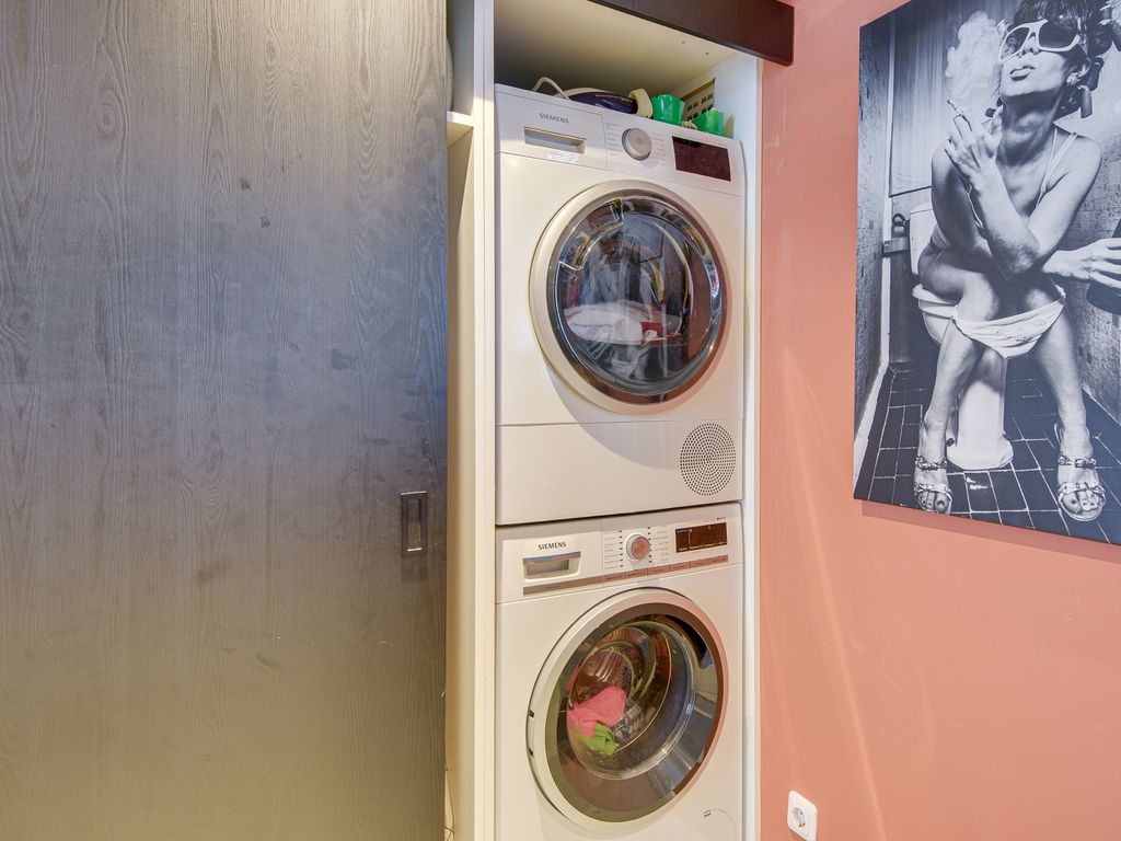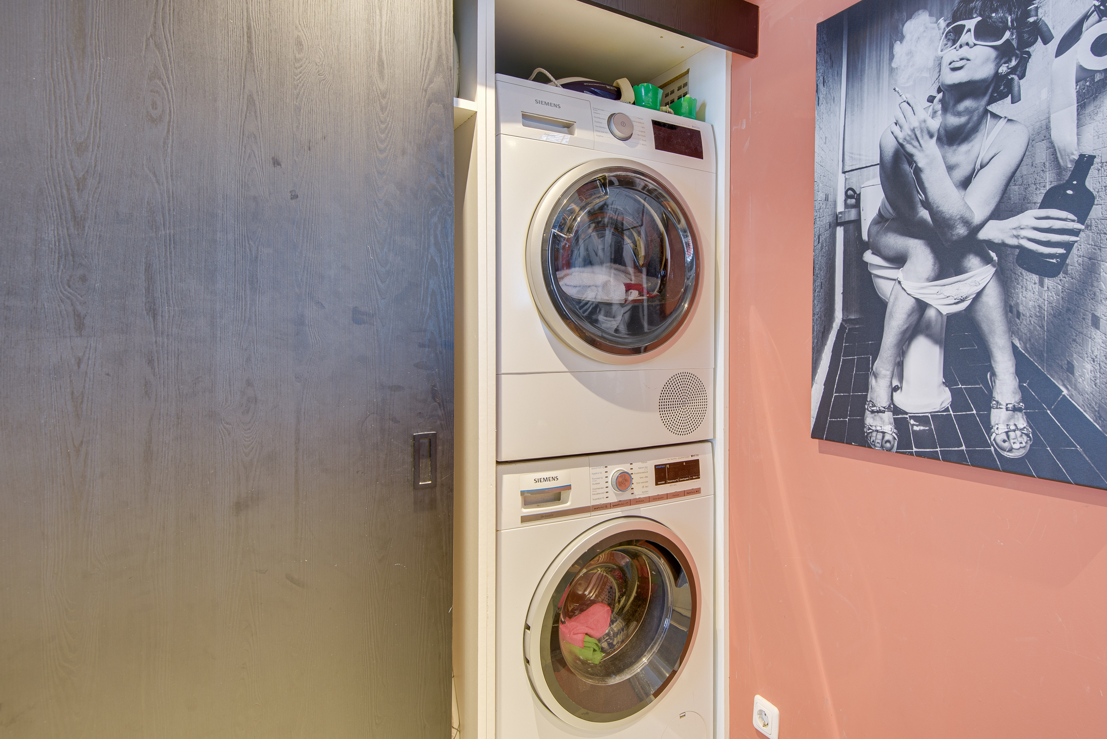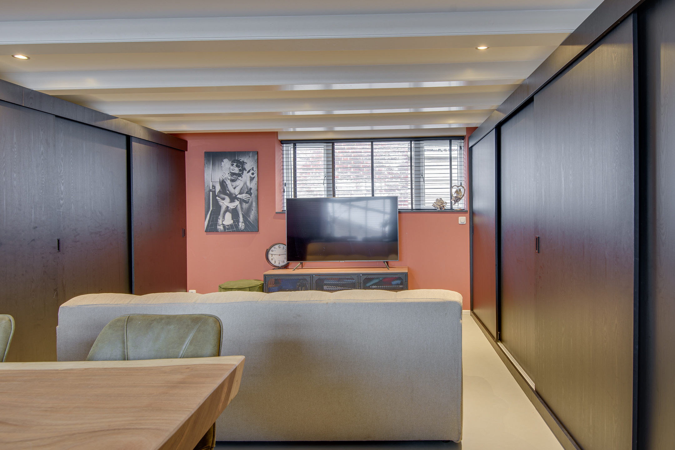De tweede woonkamer is verrassend ruim – ideaal voor een eettafel én zithoek. Eventueel kan deze ruimte ook dienst doen als zeer ruime 4e slaapkamer. Aan beide zijden vind je grote inbouwkasten, perfect om spullen netjes op te bergen. Ook de wasmachine en droger zijn hier slim weggewerkt.