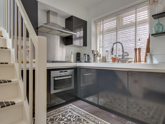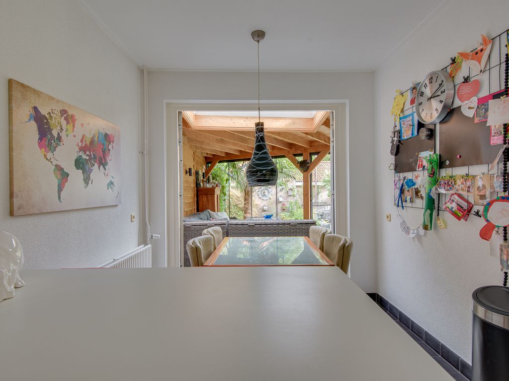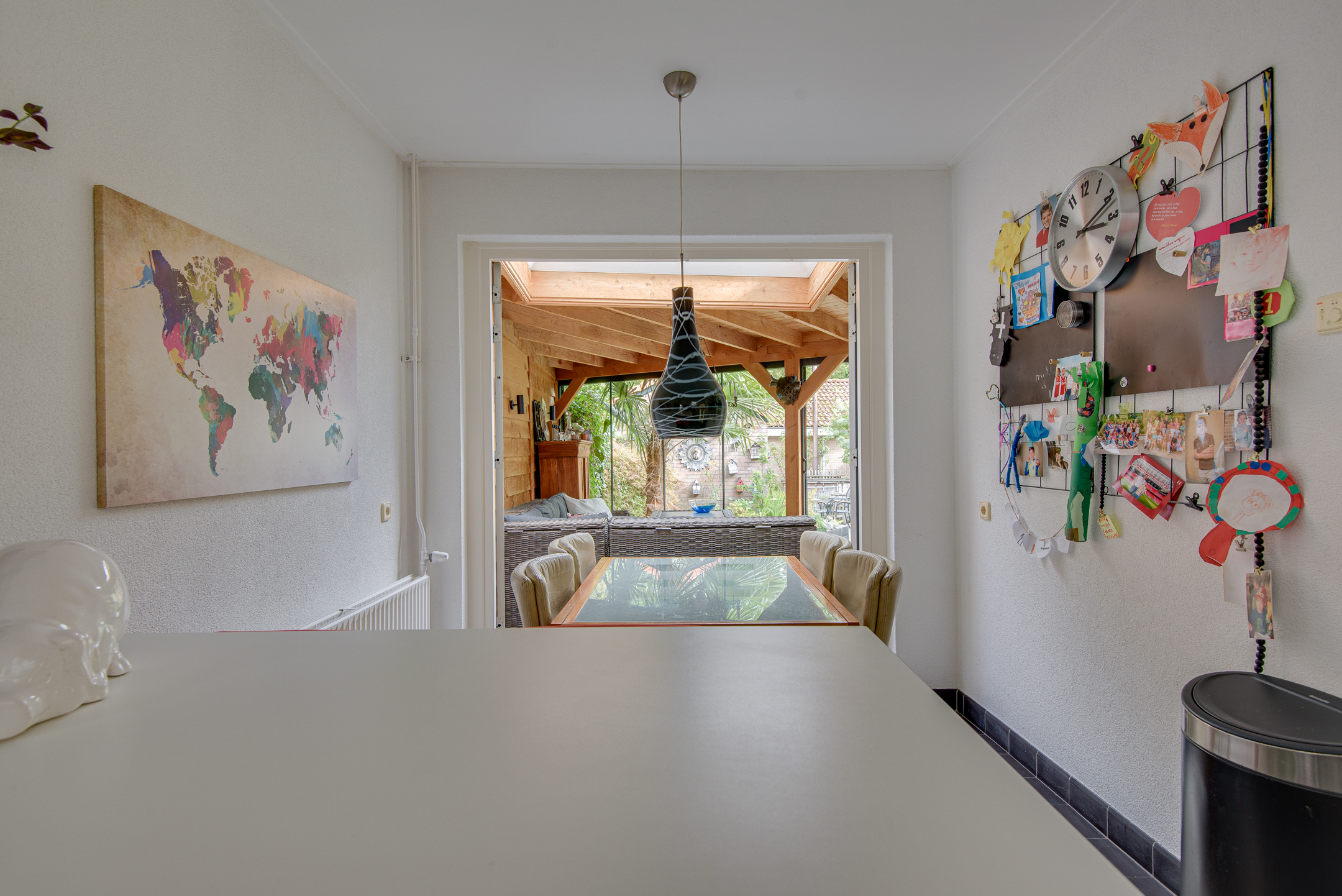 De keuken is compleet uitgerust met een 5-pits gasfornuis, afzuigkap, koelkast, vaatwasser, oven en spoelbak. Bovendien is er ruimte voor een extra eettafel. Vanuit de keuken stap je zo de serre in.