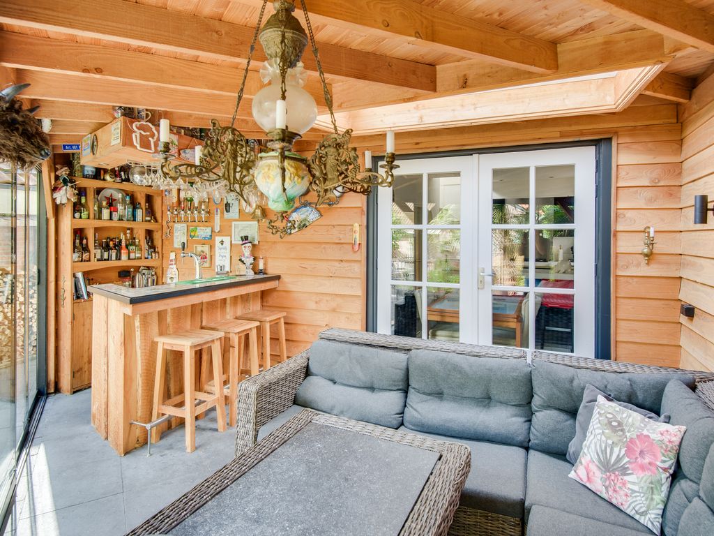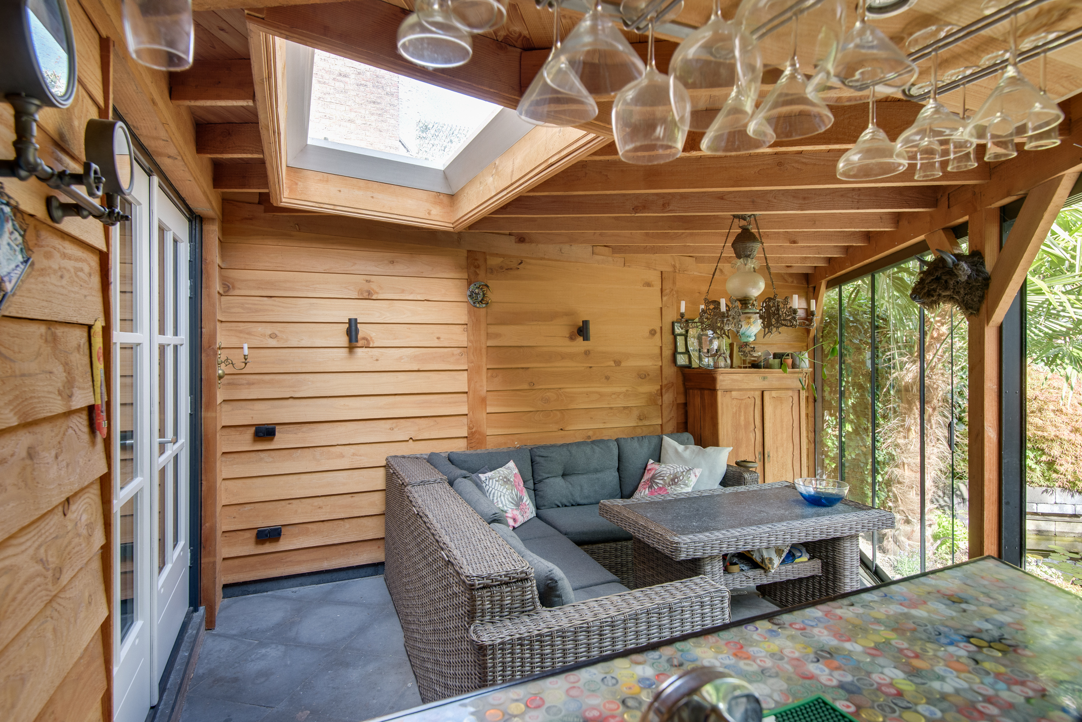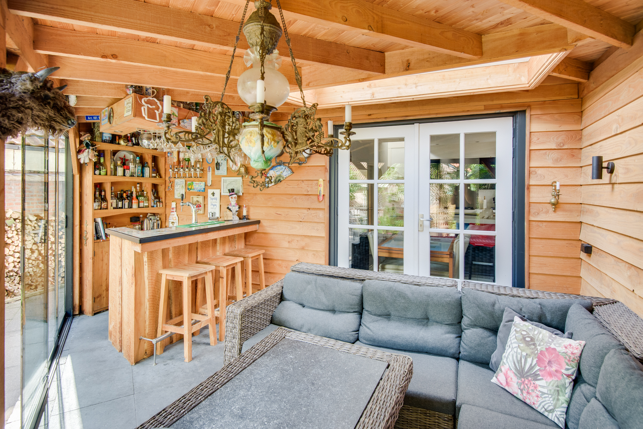 De serre is ingericht met een knusse zithoek en zelfs een bar. Een ideale plek voor gezellige avonden, zomer én winter. Op warme dagen schuif je de glazen deuren eenvoudig open en geniet je van het buitengevoel.