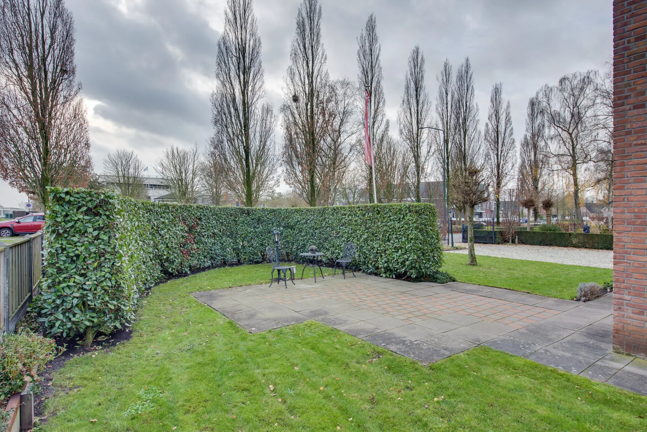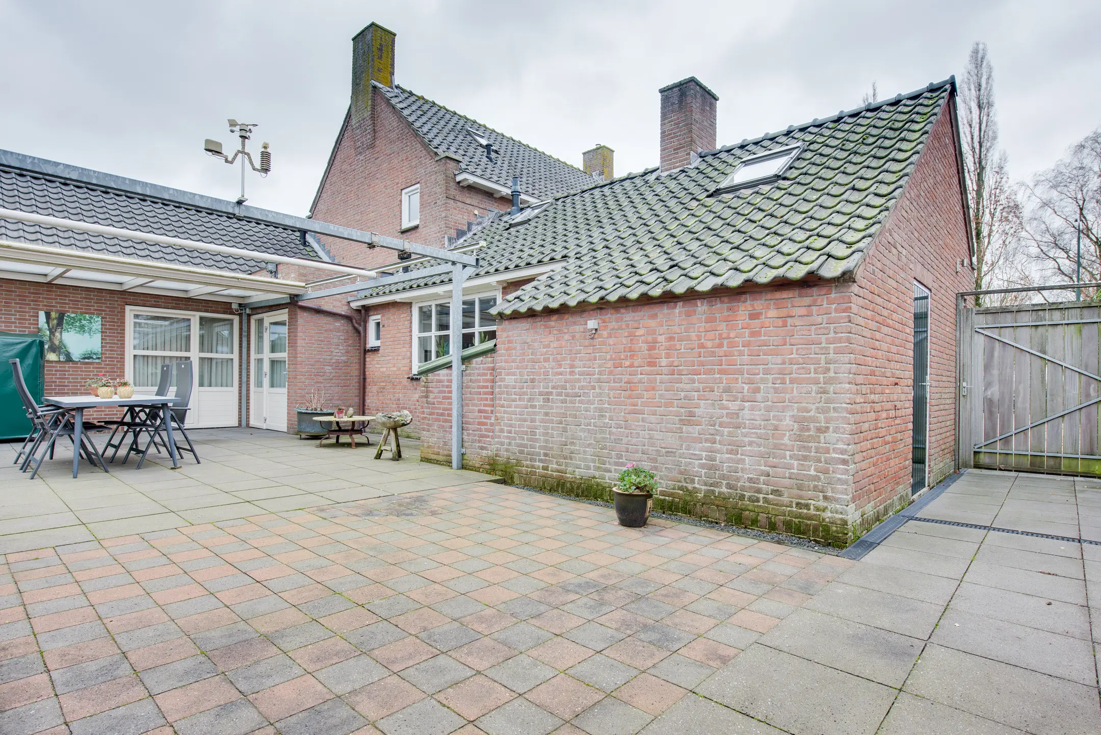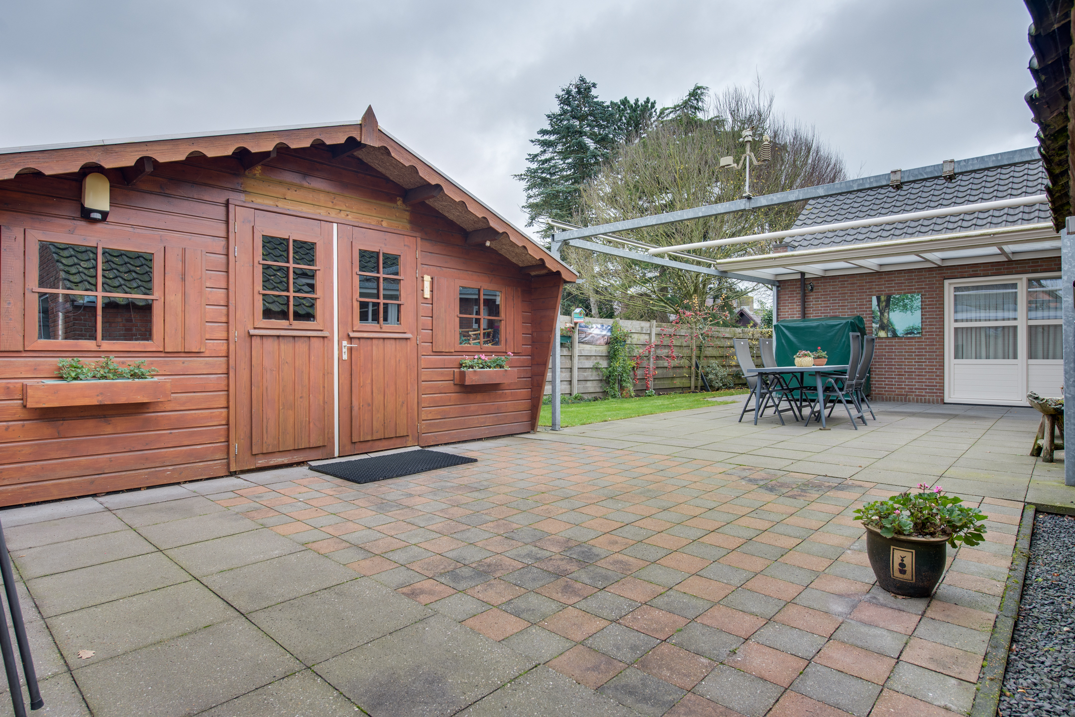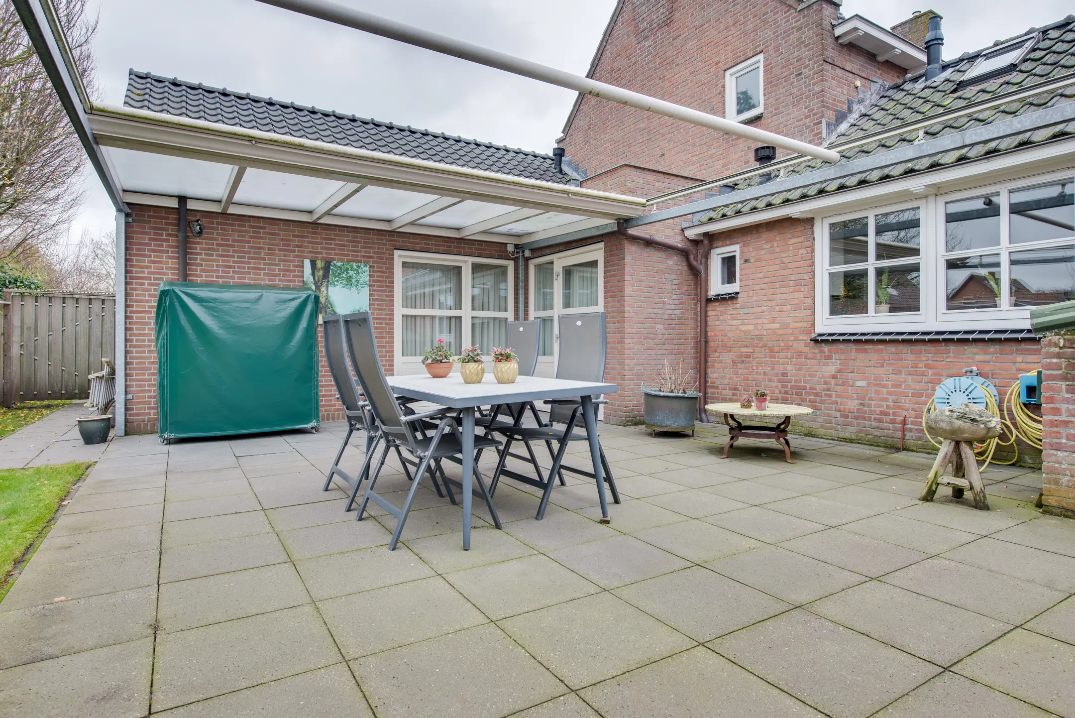 Een echte meerwaarde is de overkapping, die desgewenst geopend kan worden. Hierdoor is het mogelijk om bij zowel zonnig weer als op koelere of minder mooie dagen comfortabel buiten te zitten. Of het nu gaat om een ontspannen ochtendkoffie, een gezellige barbecue of lange zomeravonden met familie en vrienden — deze tuin biedt het allemaal.