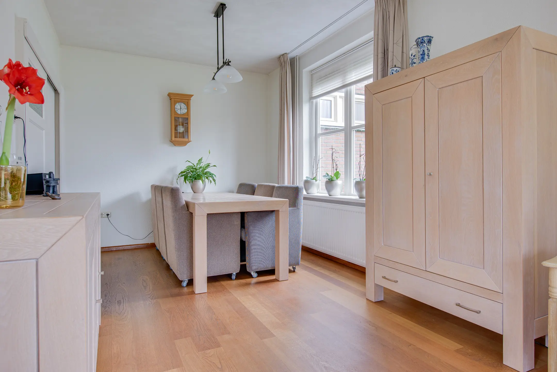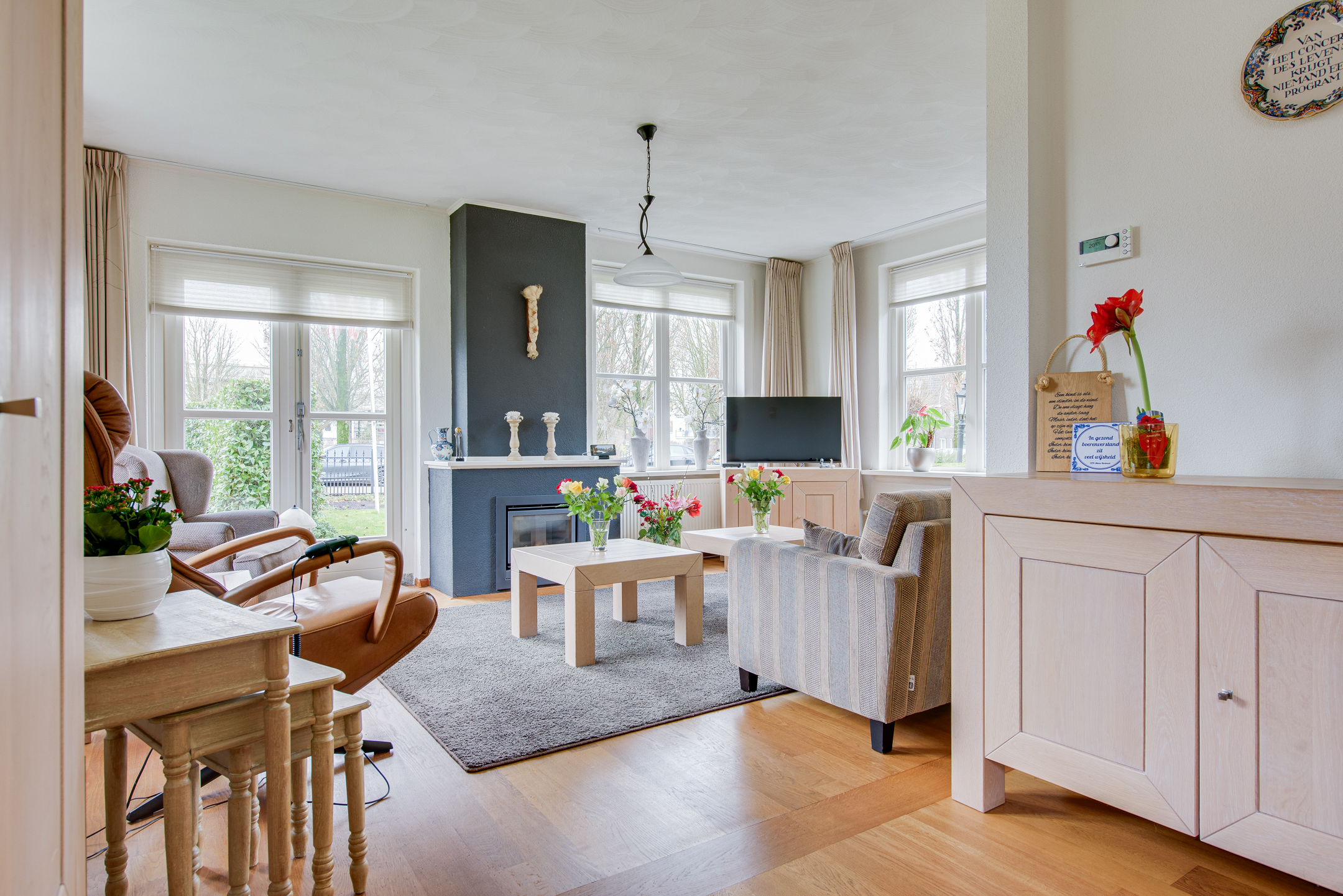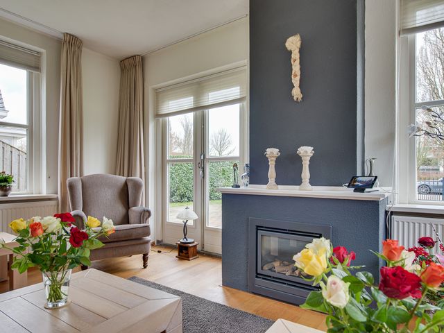 De royale woonkamer ligt aan de voorzijde van de woning en is dankzij de vele ramen en openslaande deuren heerlijk licht. Vanuit het zitgedeelte kijk je uit over de karakteristieke Voorstraat, terwijl het achterste gedeelte is ingericht als sfeervolle eetkamer. De gashaard zorgt hier voor extra warmte en gezelligheid.