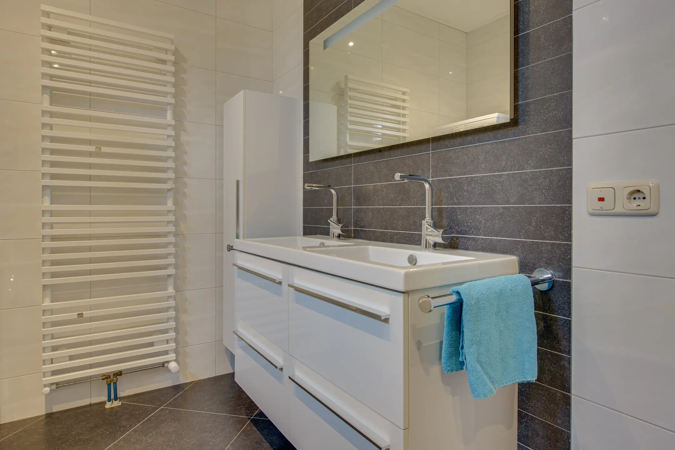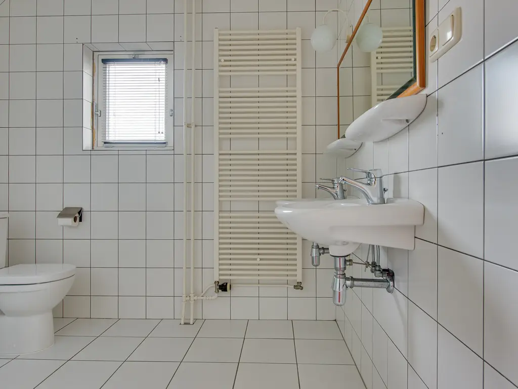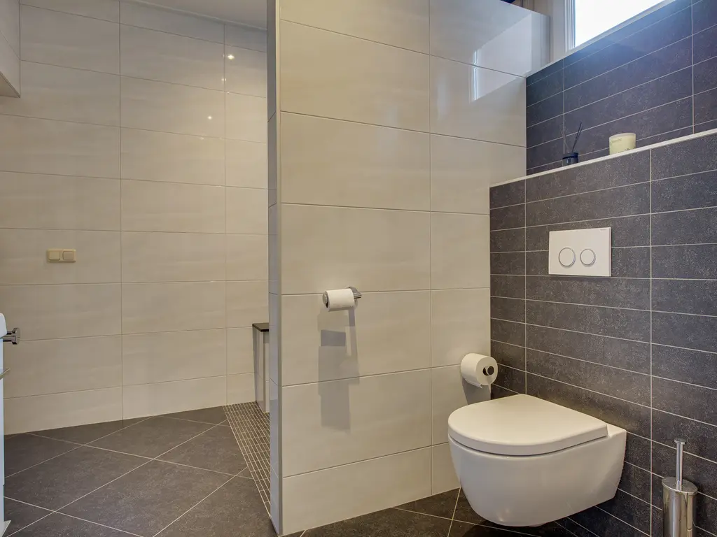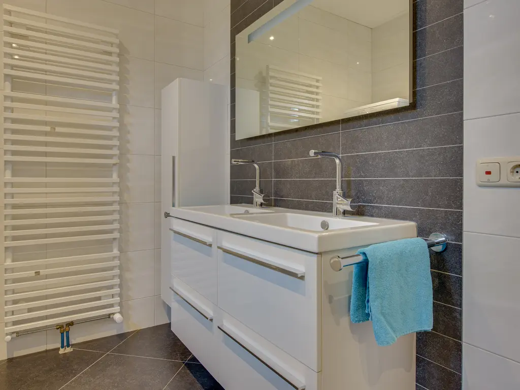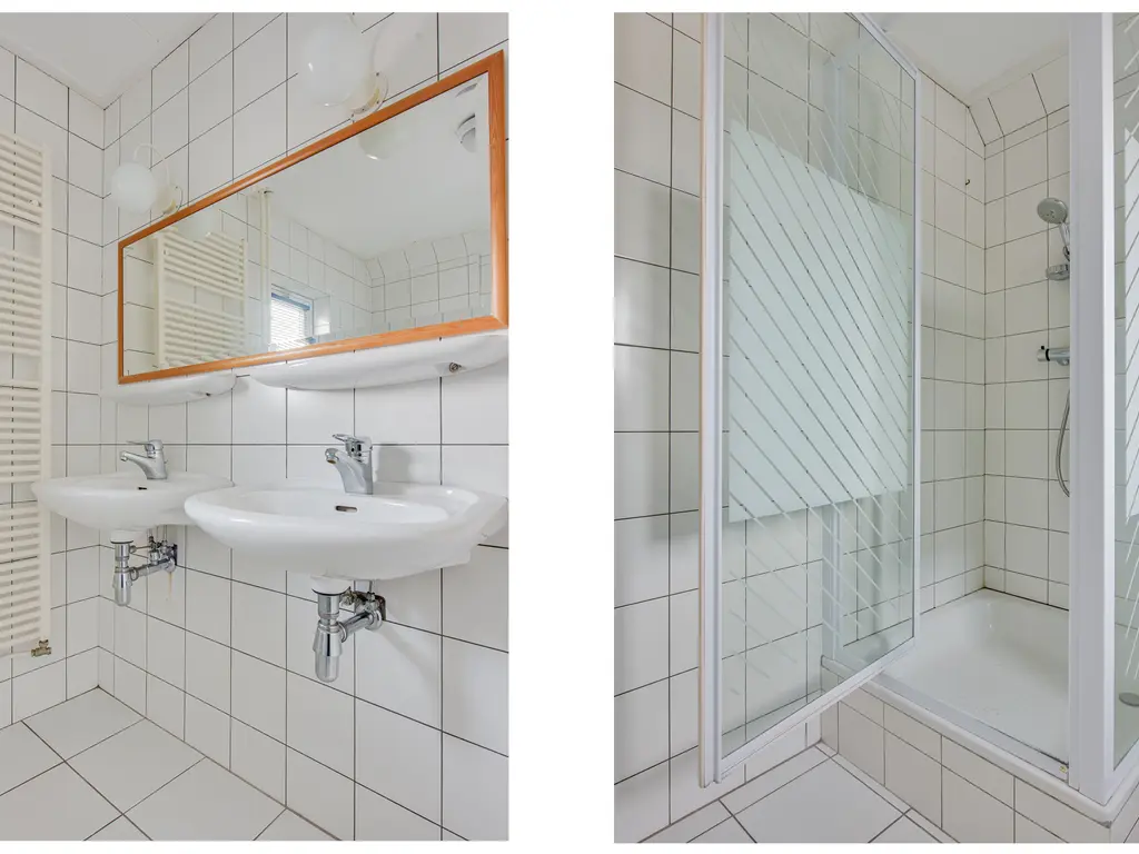 Op deze verdieping bevindt zich tevens een tweede badkamer, praktisch en compleet ingericht met een toilet, douche en een dubbele wastafel. Ideaal voor een gezin of voor gasten, waardoor er ’s ochtends geen wachttijden ontstaan.