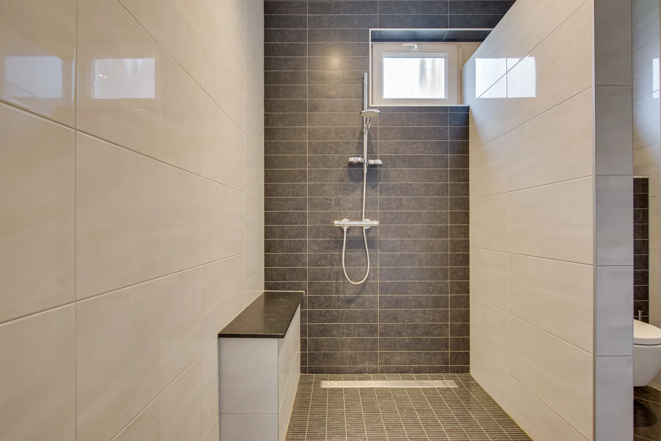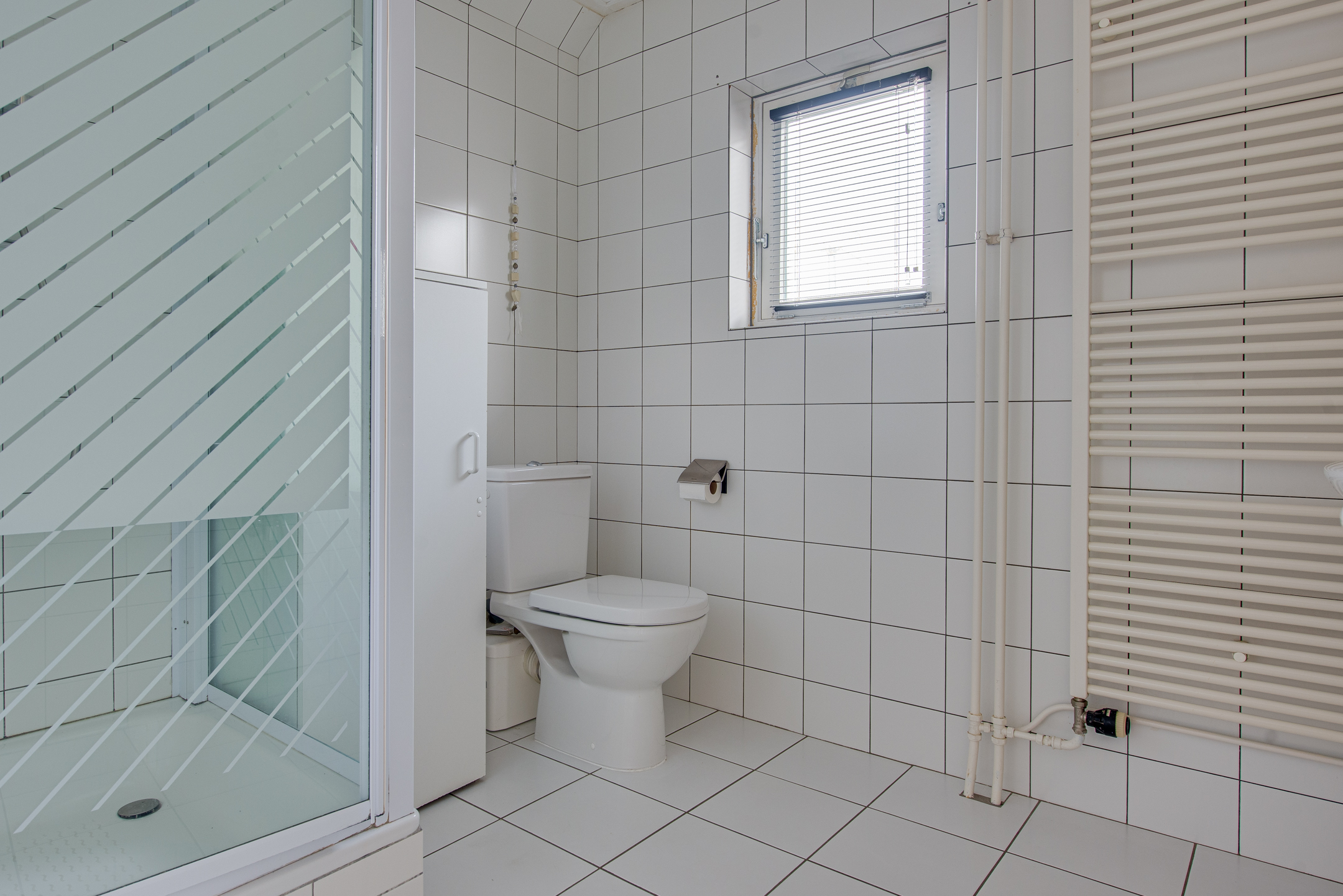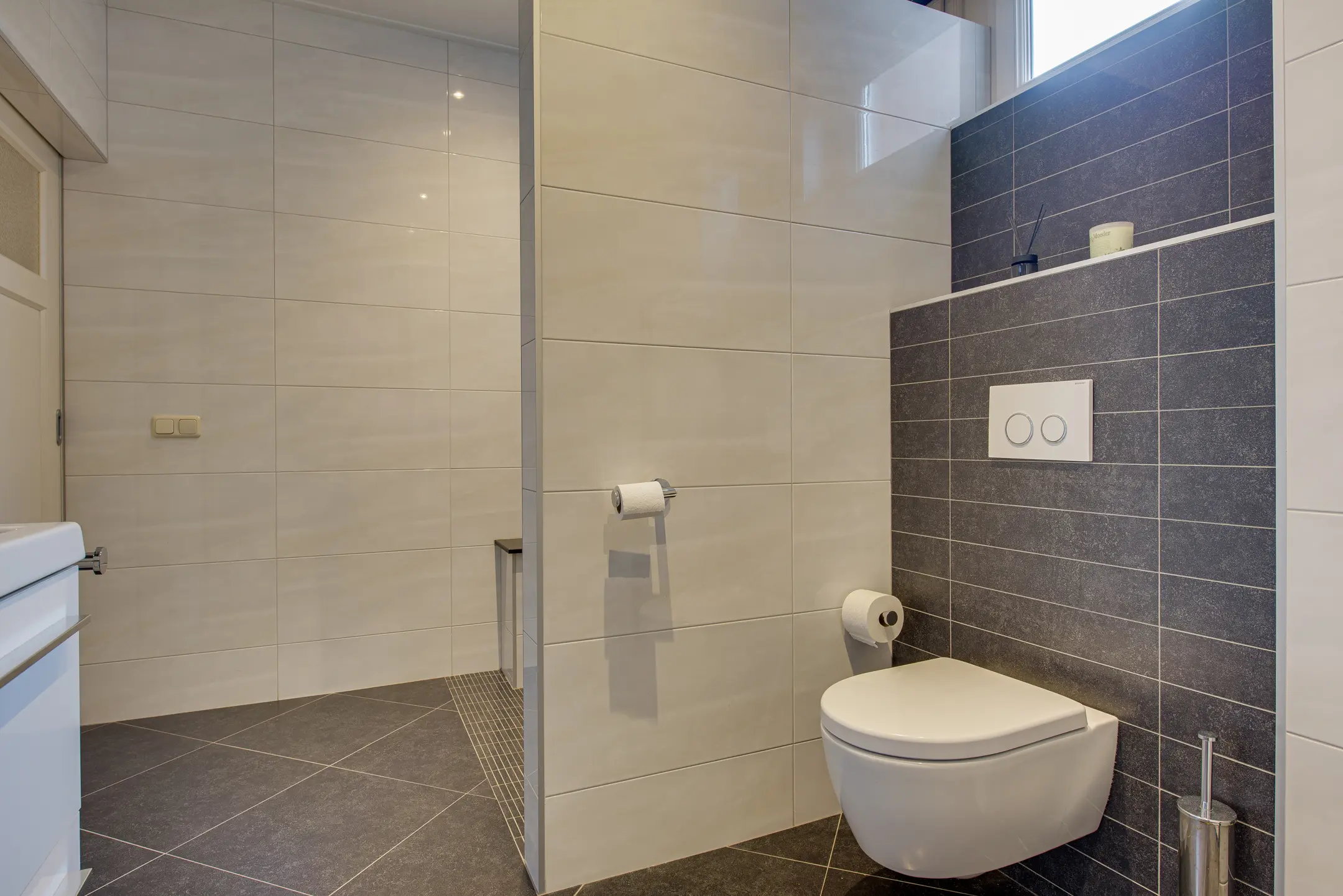 Op deze verdieping bevindt zich tevens een tweede badkamer, praktisch en compleet ingericht met een toilet, douche en een dubbele wastafel. Ideaal voor een gezin of voor gasten, waardoor er ’s ochtends geen wachttijden ontstaan.