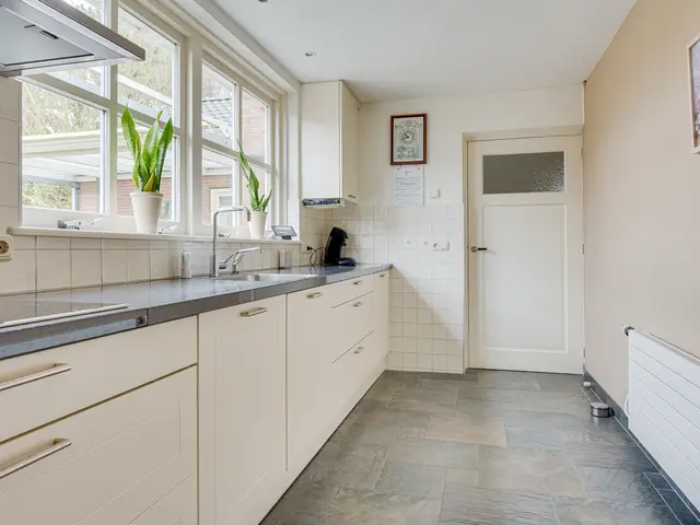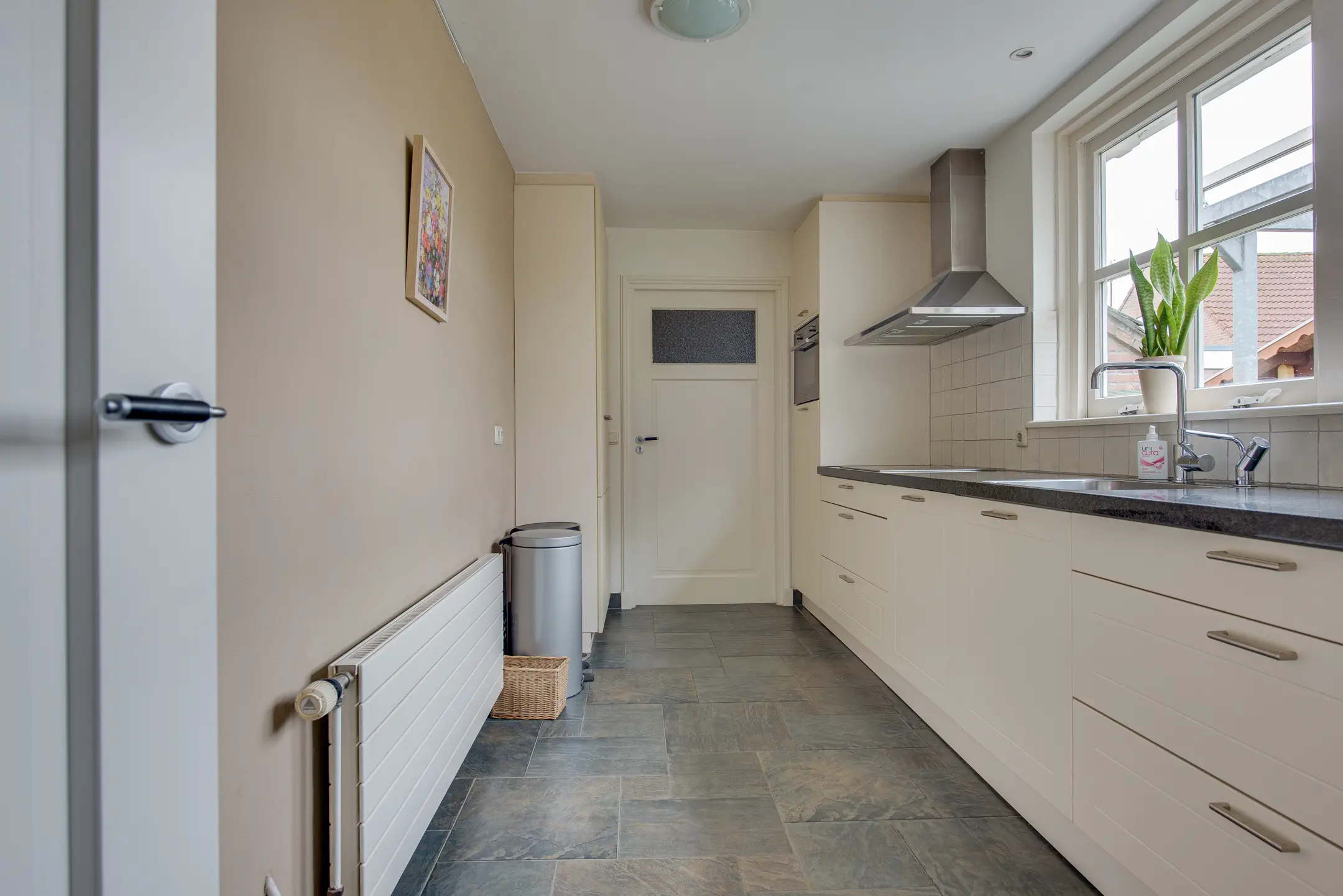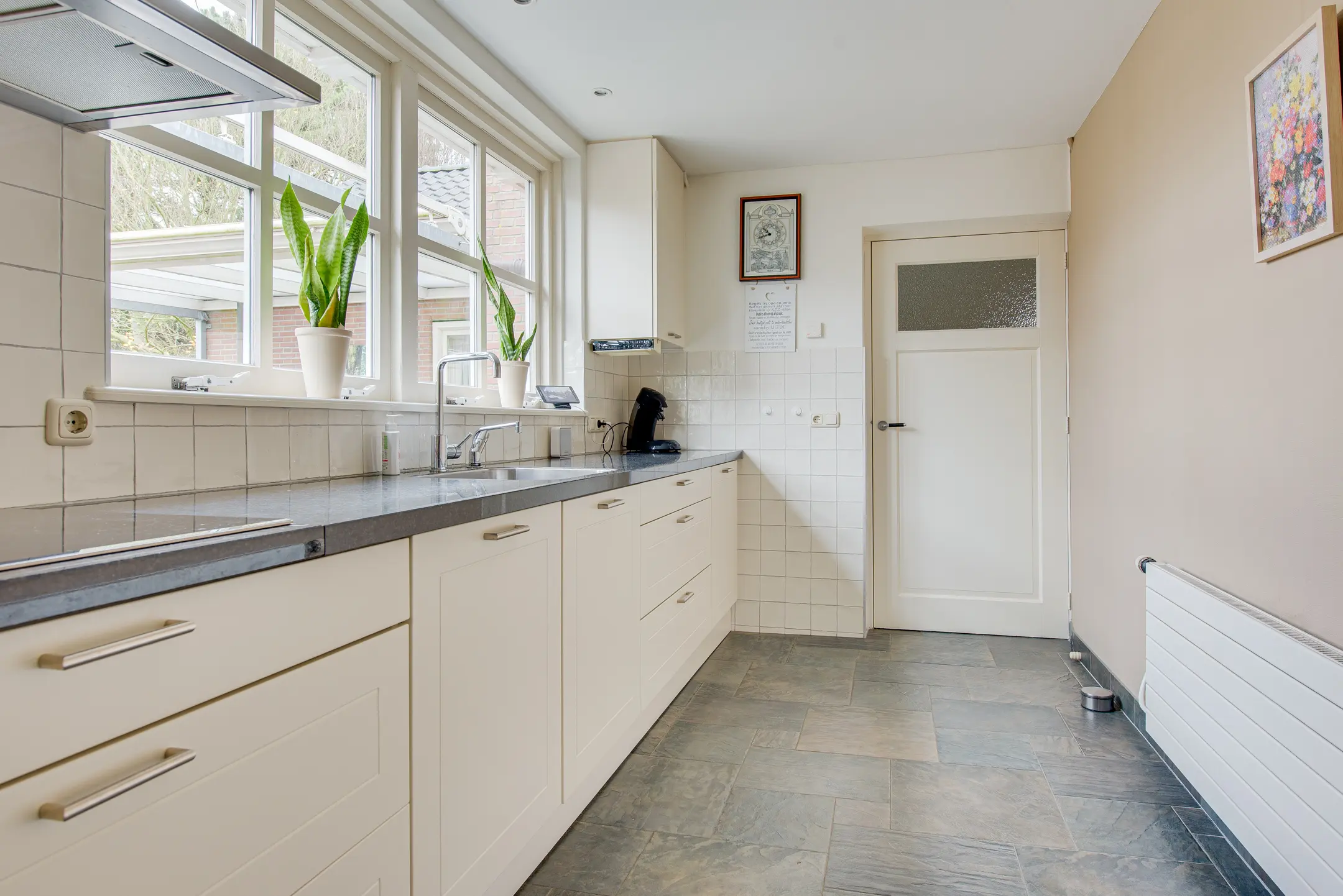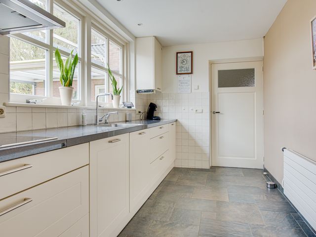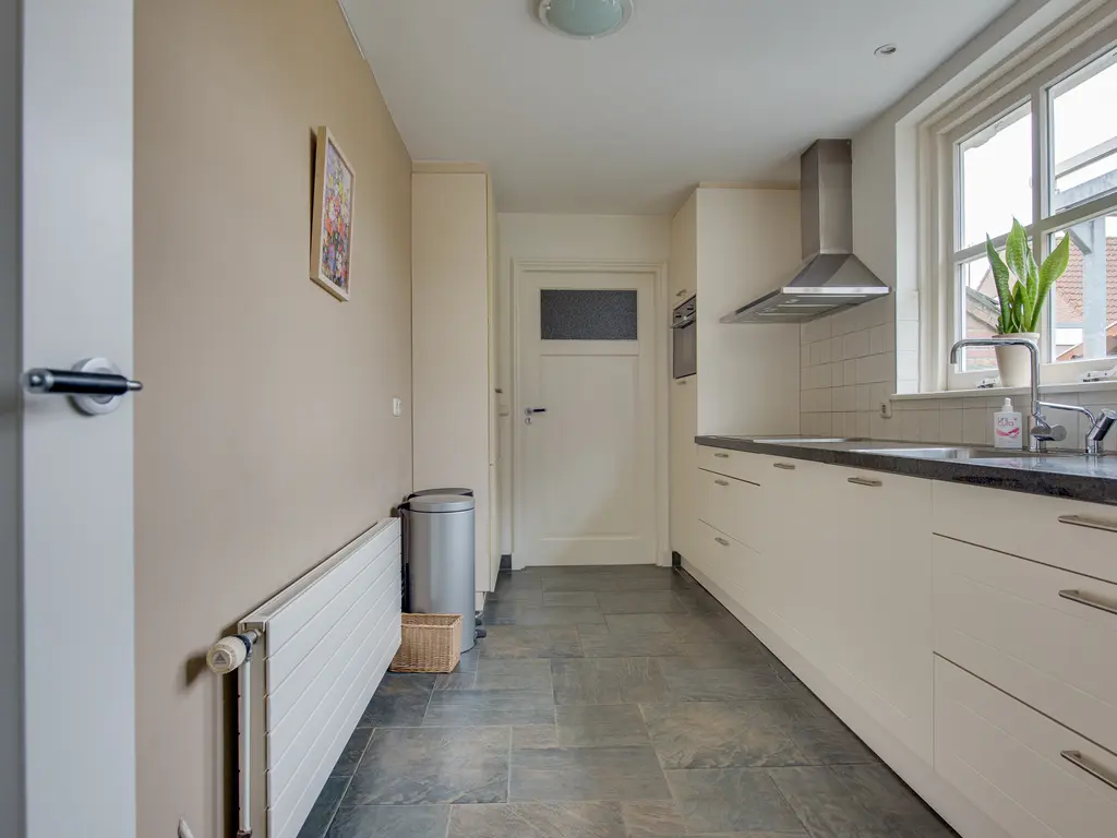 De keuken is in 2011 vernieuwd en uitgevoerd in een lichte, tijdloze stijl met een granieten werkblad. Deze is compleet uitgerust met onder andere een Quooker, keramische kookplaat, afzuigkap, combi-oven, vaatwasser en koelkast. Er is volop kastruimte en vanuit de keuken heb je zicht op de achtertuin én directe toegang tot de garage.