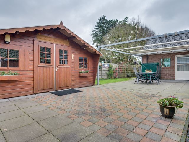 Achter in de tuin bevindt zich een vrijstaande houten schuur, voorzien van elektra. Deze is ideaal voor het stallen van fietsen, tuinmeubilair en gereedschap, maar biedt ook ruimte voor een hobby of extra opslag.