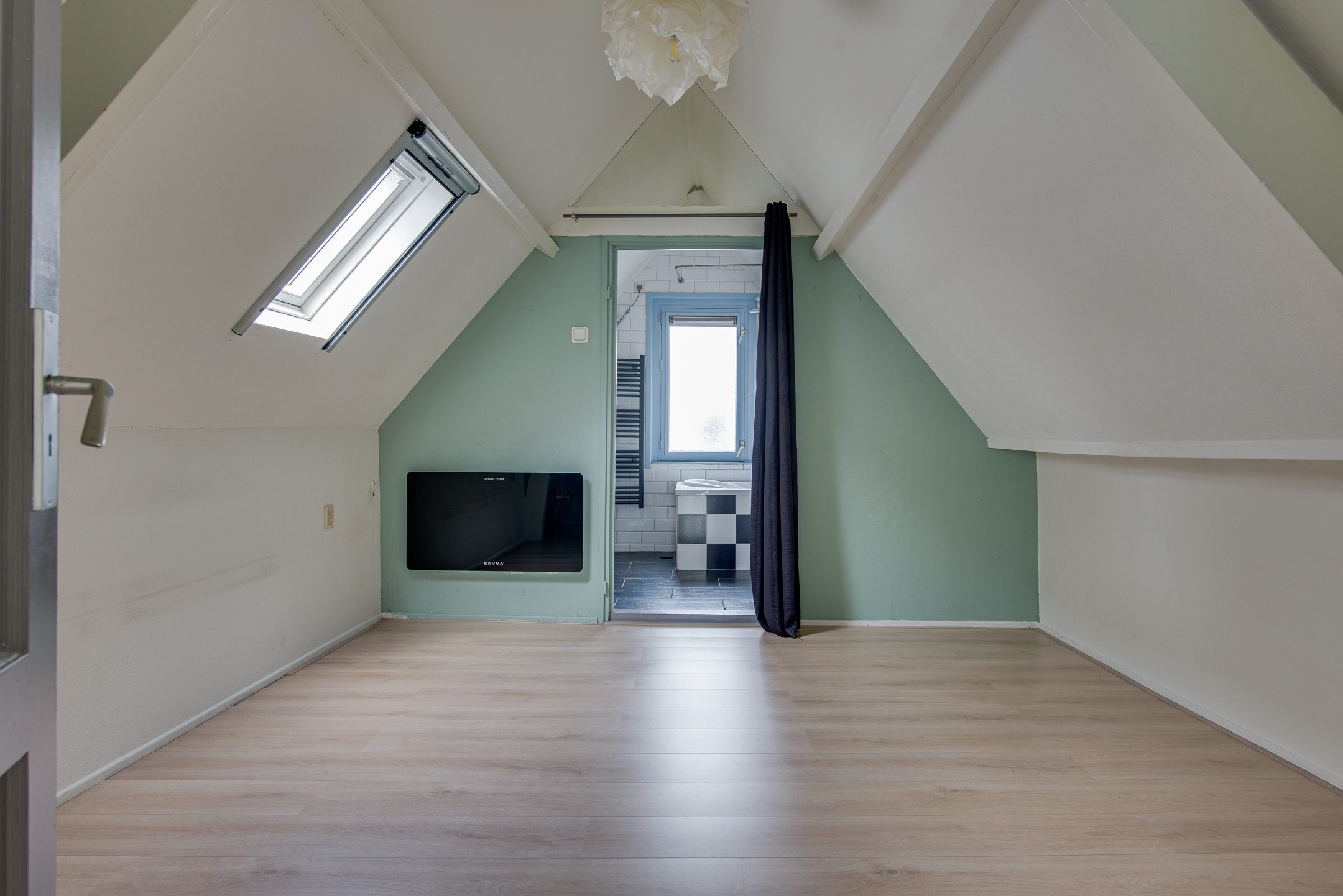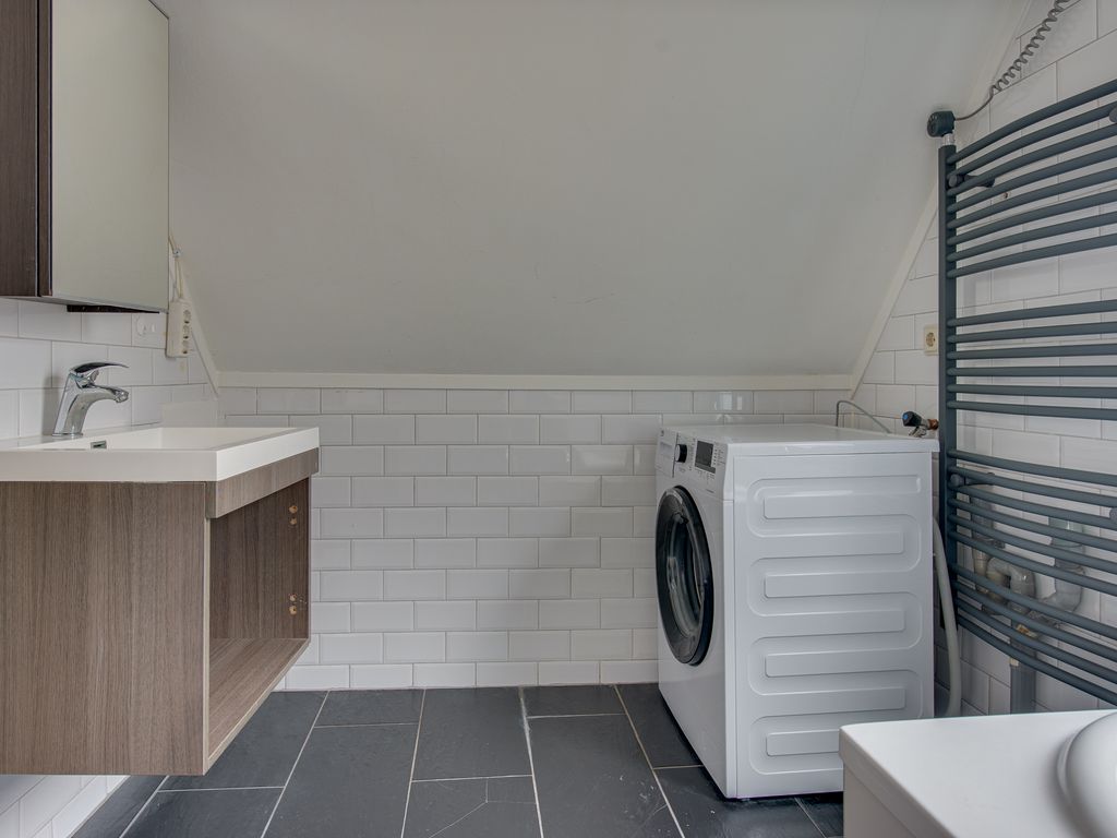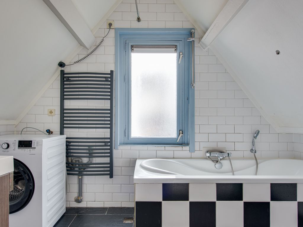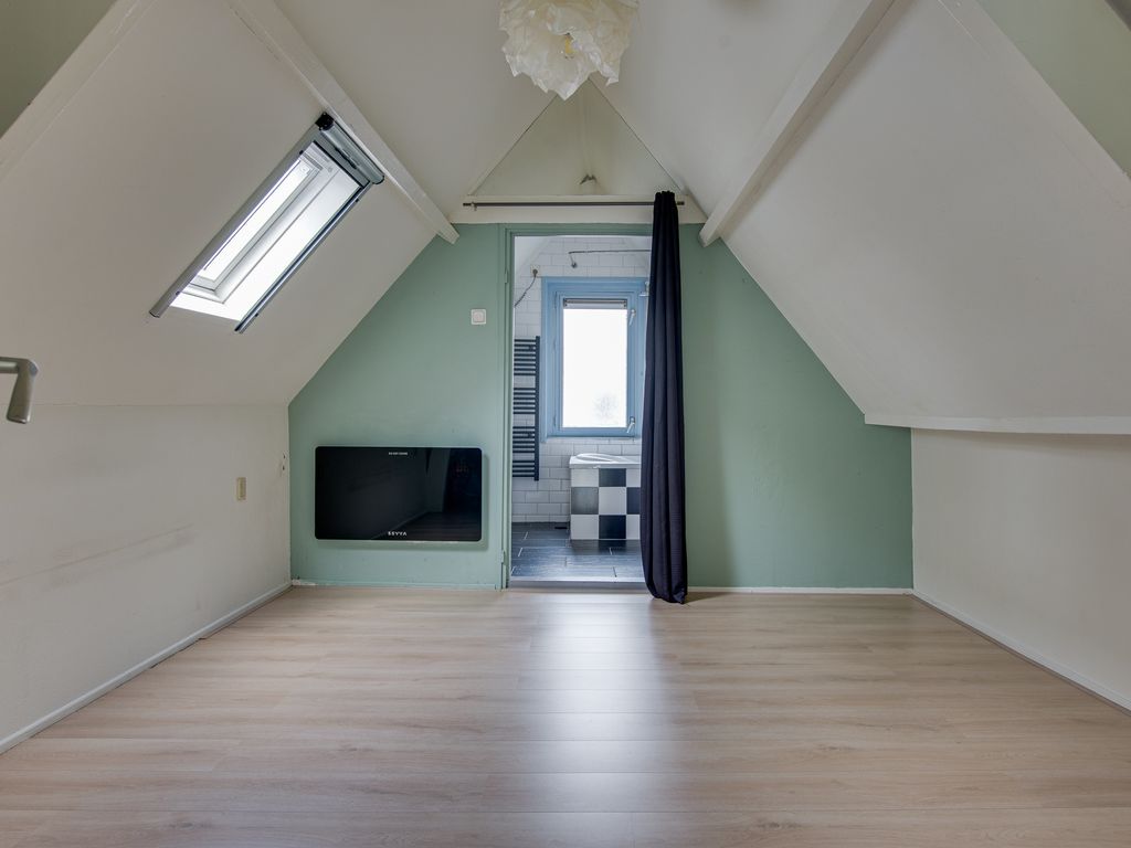 Vanuit de woonkamer stap je zó de slaapkamer in, compleet met Velux dakraam voor extra daglicht. De zichtbare spanten geven deze kamer net dat beetje extra charme en warmte. De aangrenzende badkamer is uitgerust met een wastafelmeubel, een ligbad met douchefunctie en de aansluiting voor de wasmachine.