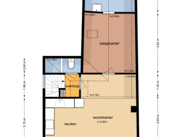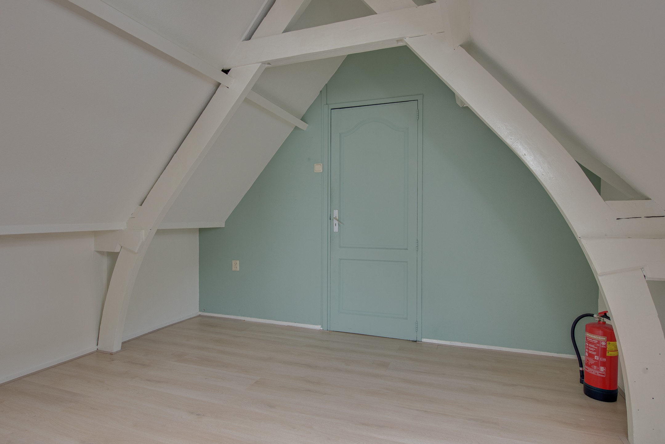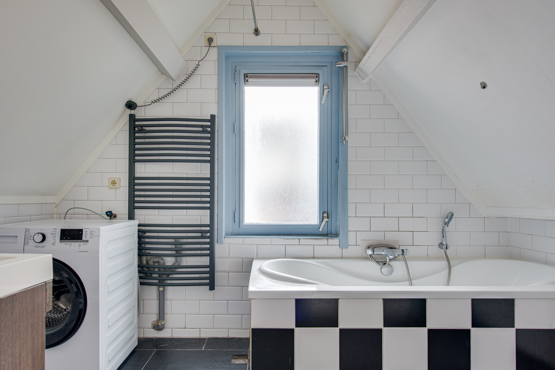 Vanuit de woonkamer stap je zó de slaapkamer in, compleet met Velux dakraam voor extra daglicht. De zichtbare spanten geven deze kamer net dat beetje extra charme en warmte. De aangrenzende badkamer is uitgerust met een wastafelmeubel, een ligbad met douchefunctie en de aansluiting voor de wasmachine.