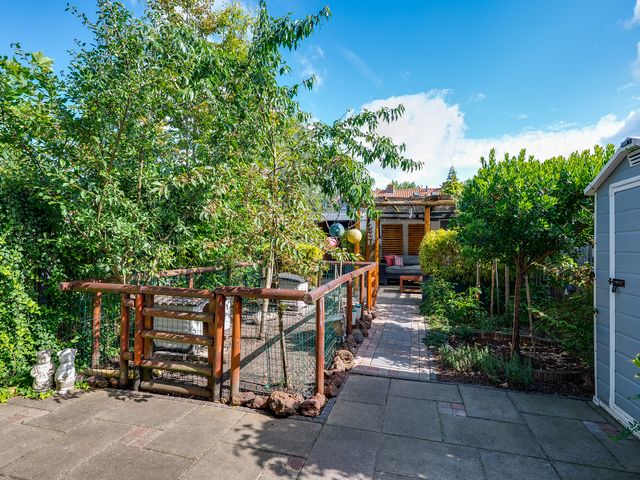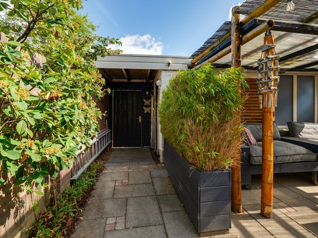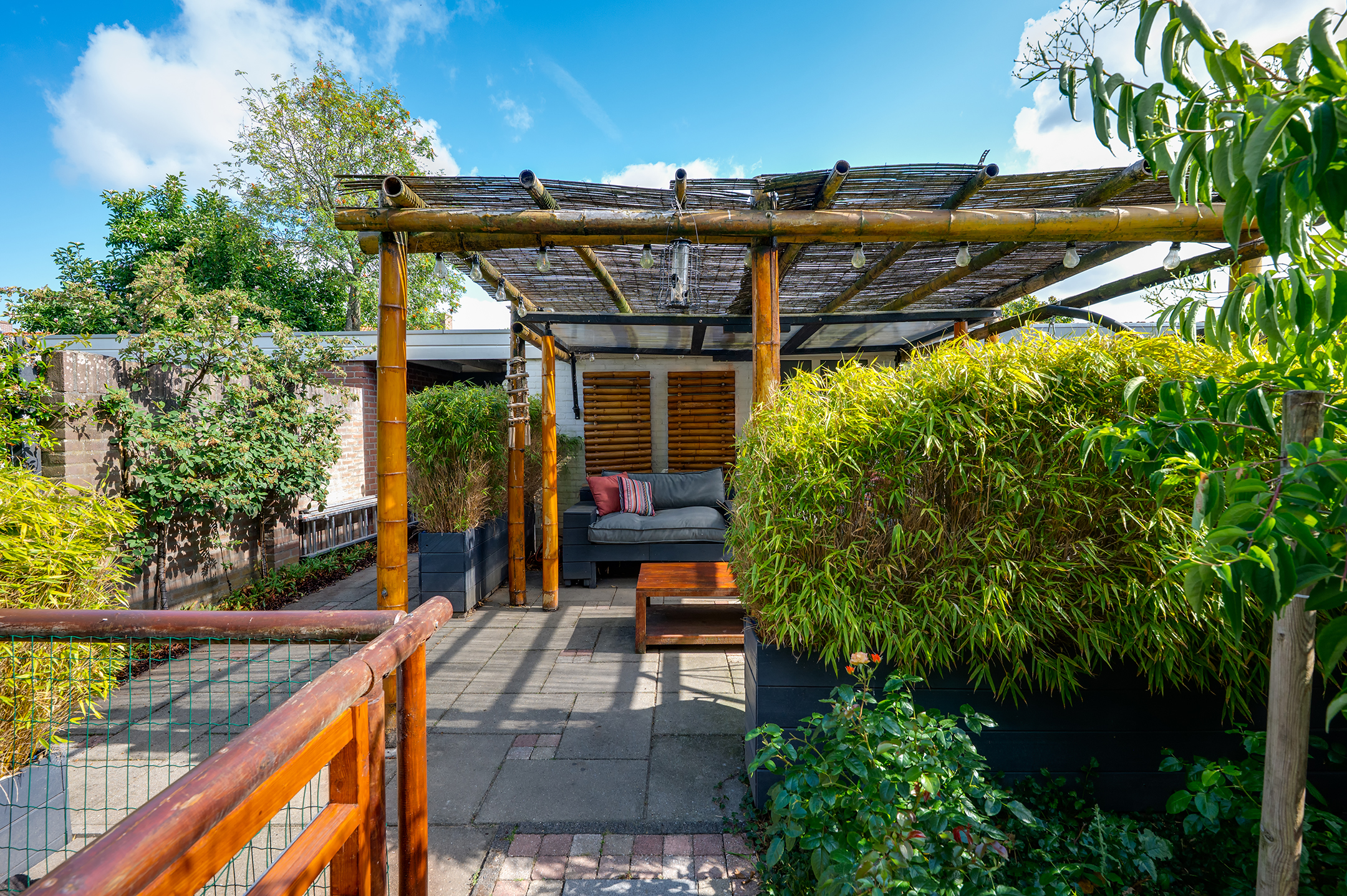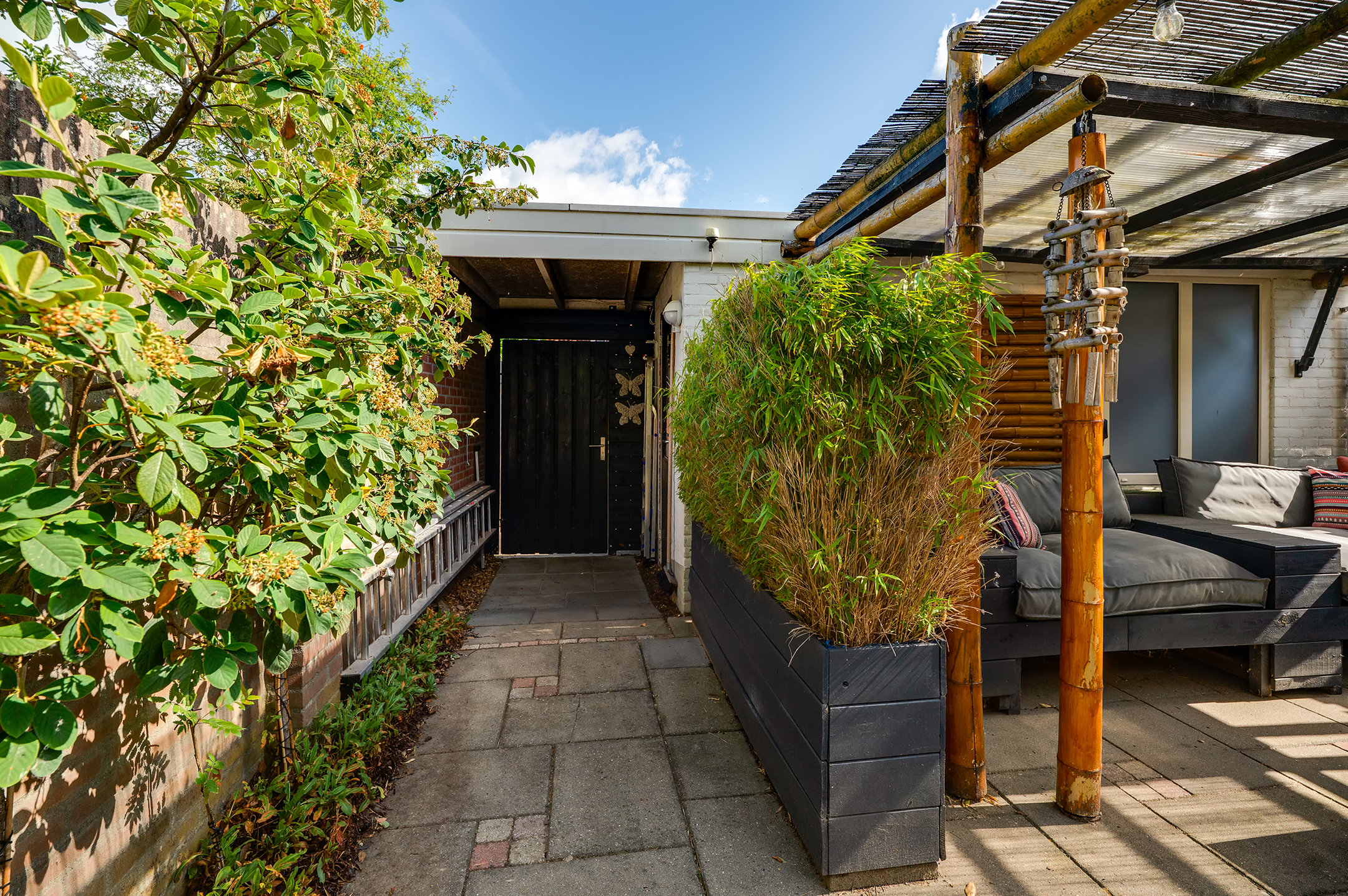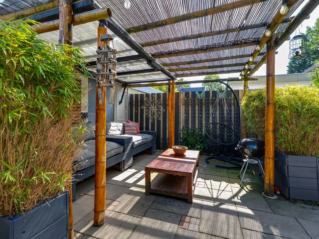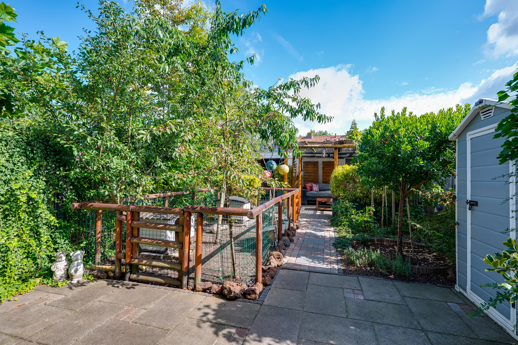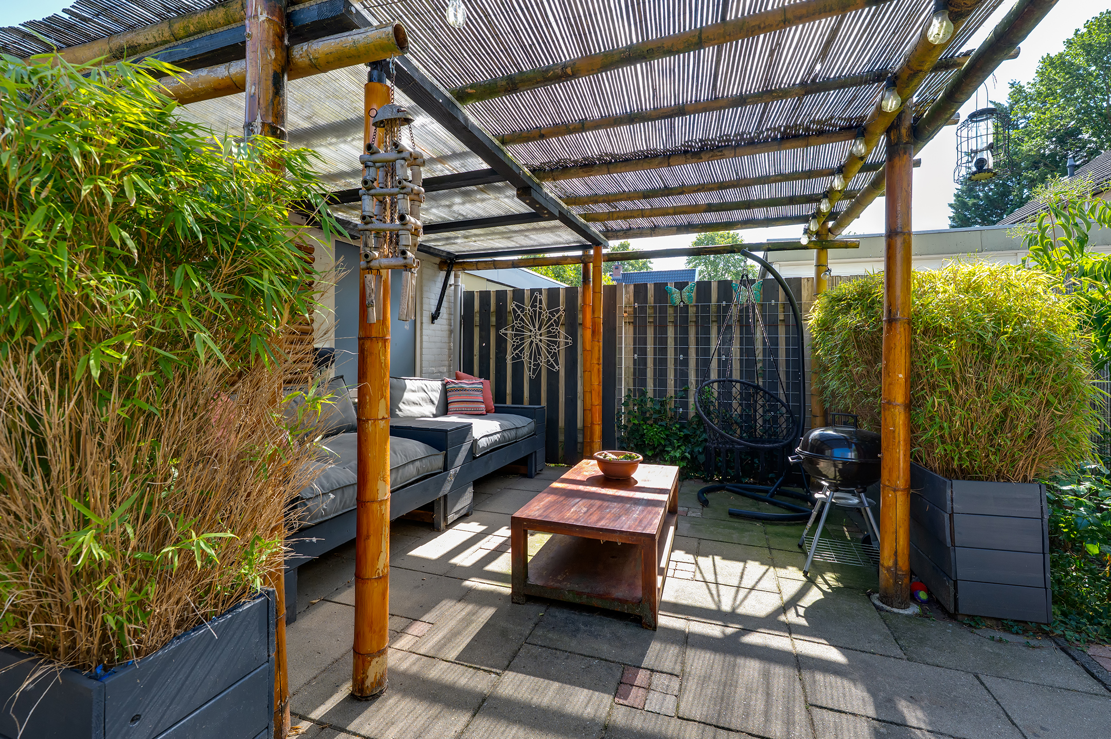 De achtertuin is keurig aangelegd, voorzien van een terras direct achter het huis én een stenen berging met elektra. En ondanks dat de tuin op het noorden is gesitueerd, is de tuin diep genoeg om schaduw en zonplekjes te vinden. Extra leuk: aan de schuur is een bamboe overkapping geplaatst die zorgt voor een knusse, bijna tropische sfeer. Hier is het puur genieten – van je eerste kopje koffie tot lange zomeravonden buiten!