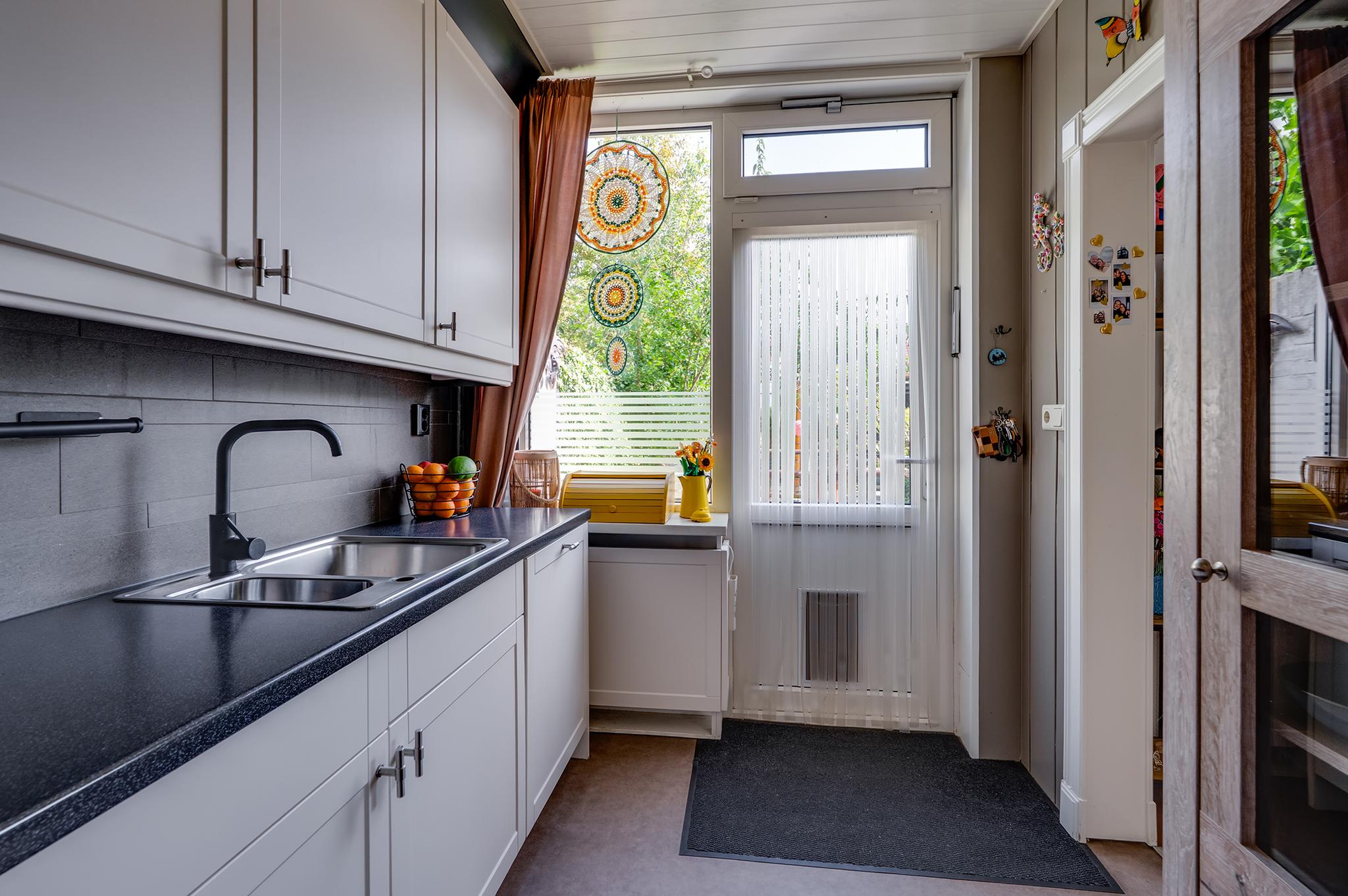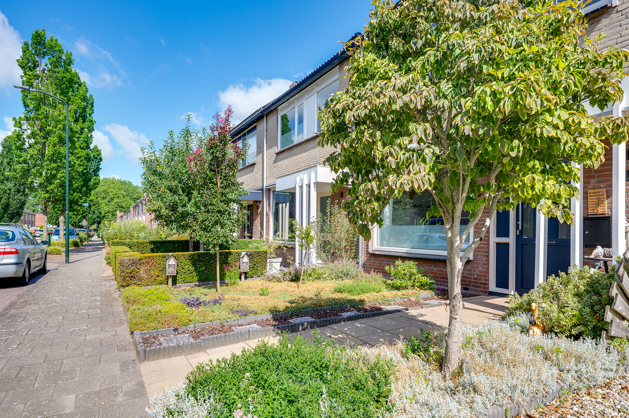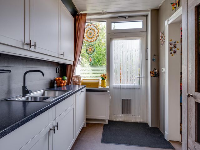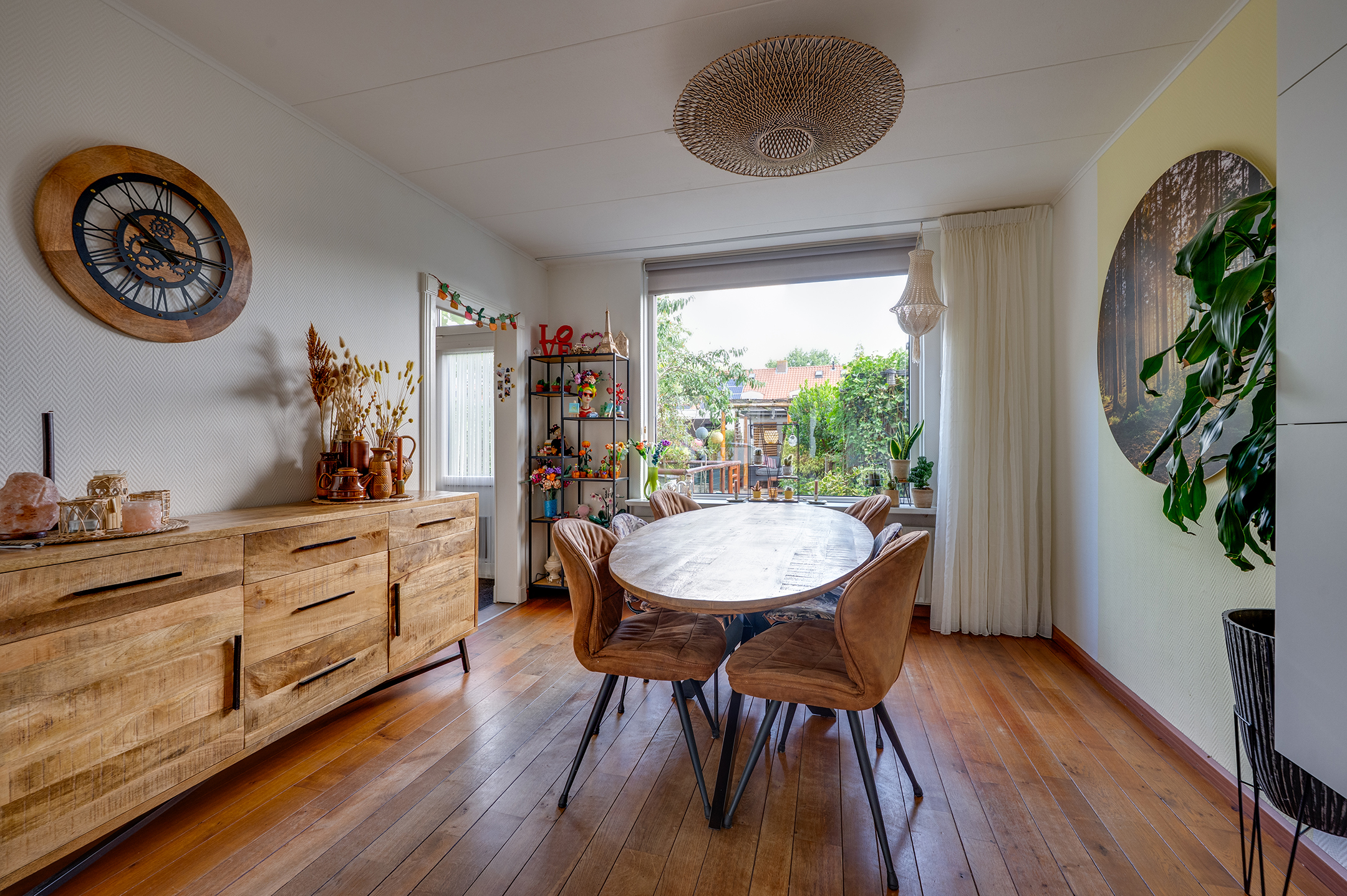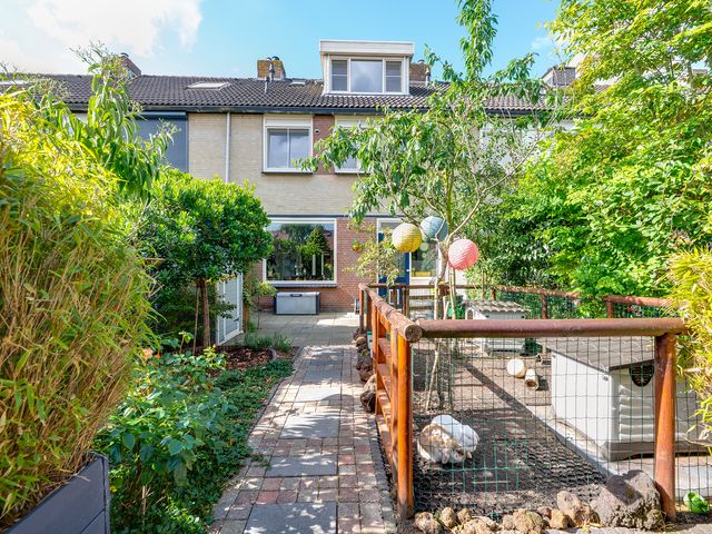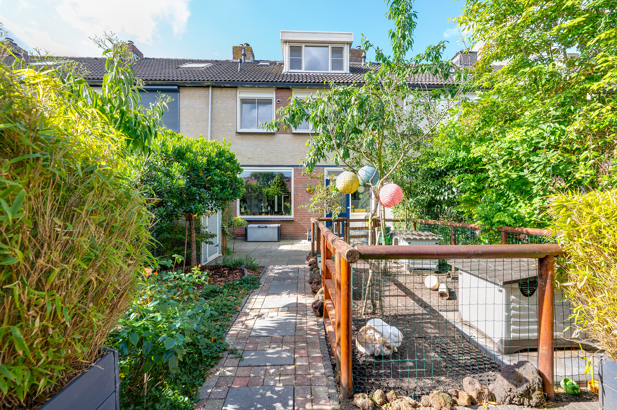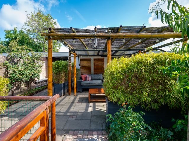 De achtertuin is keurig aangelegd, voorzien van een terras direct achter het huis én een stenen berging met elektra. En ondanks dat de tuin op het noorden is gesitueerd, is de tuin diep genoeg om schaduw en zonplekjes te vinden. Extra leuk: aan de schuur is een bamboe overkapping geplaatst die zorgt voor een knusse, bijna tropische sfeer. Hier is het puur genieten – van je eerste kopje koffie tot lange zomeravonden buiten!