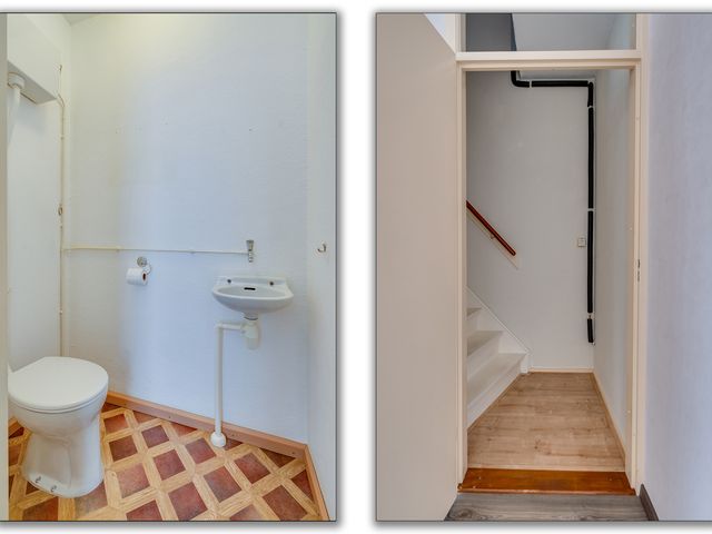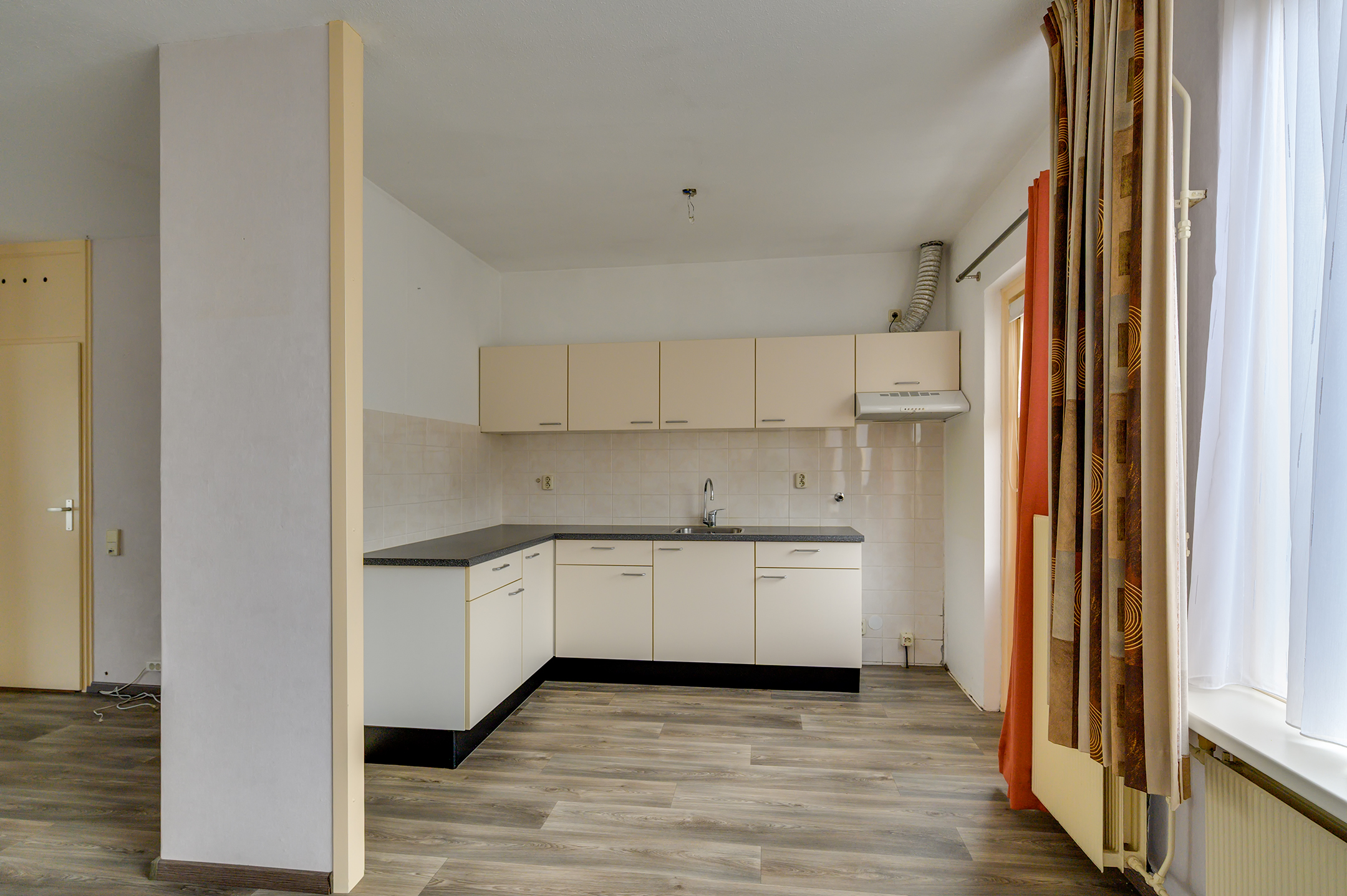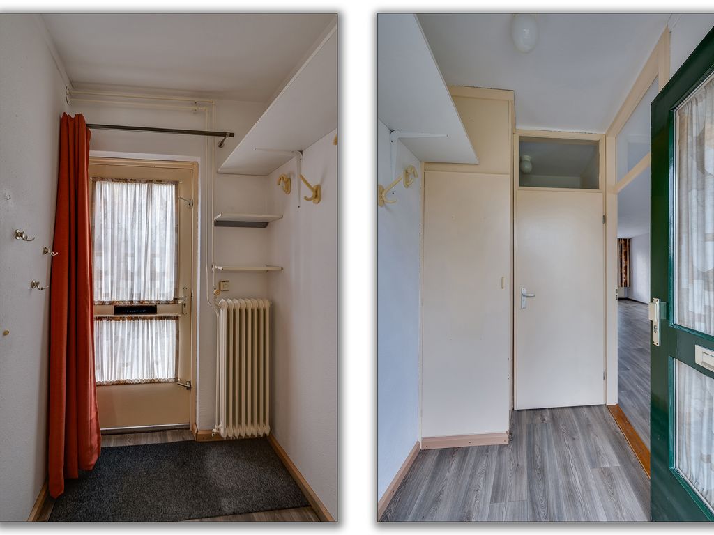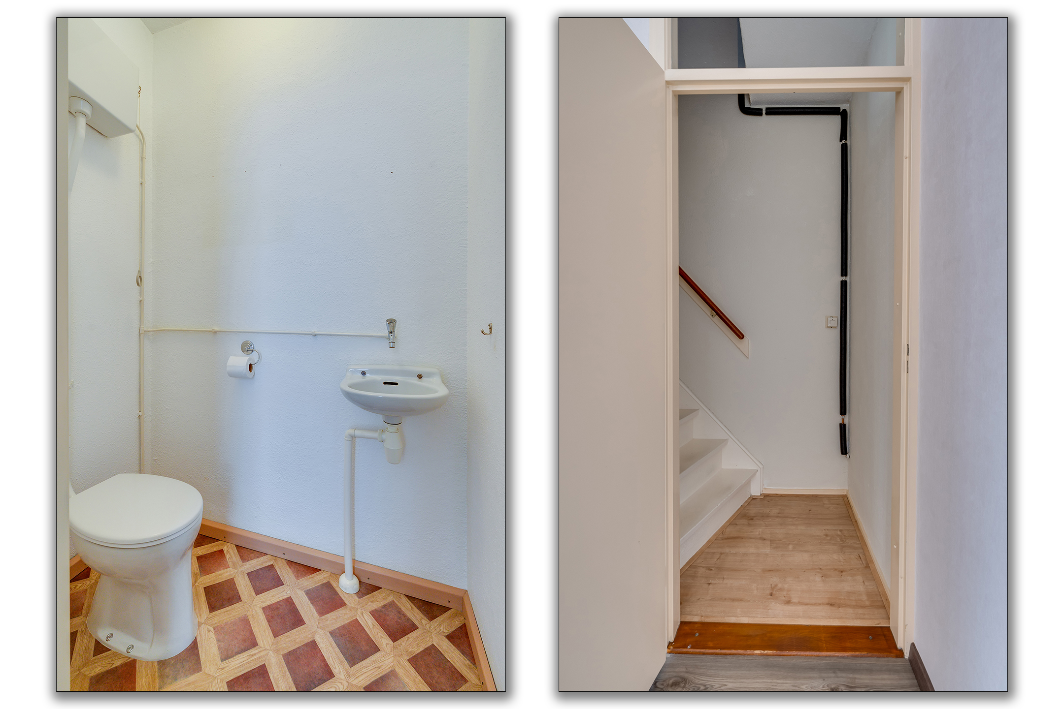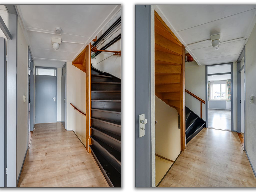 Entree/hal met zeil, meterkast (nieuwe groepenkast met 6 groepen en 2 aardlekschakelaars), toiletruimte met staand toilet en fonteintje. Doorzon woonkamer met zeil, provisiekast onder de trap en een deur met de vaste trap naar de slaapverdieping. Open keuken met zeil en een L-vormig keukenblok met afzuigkap.