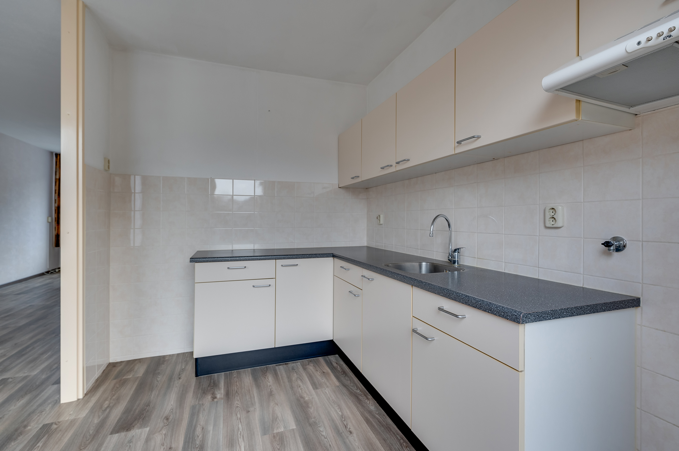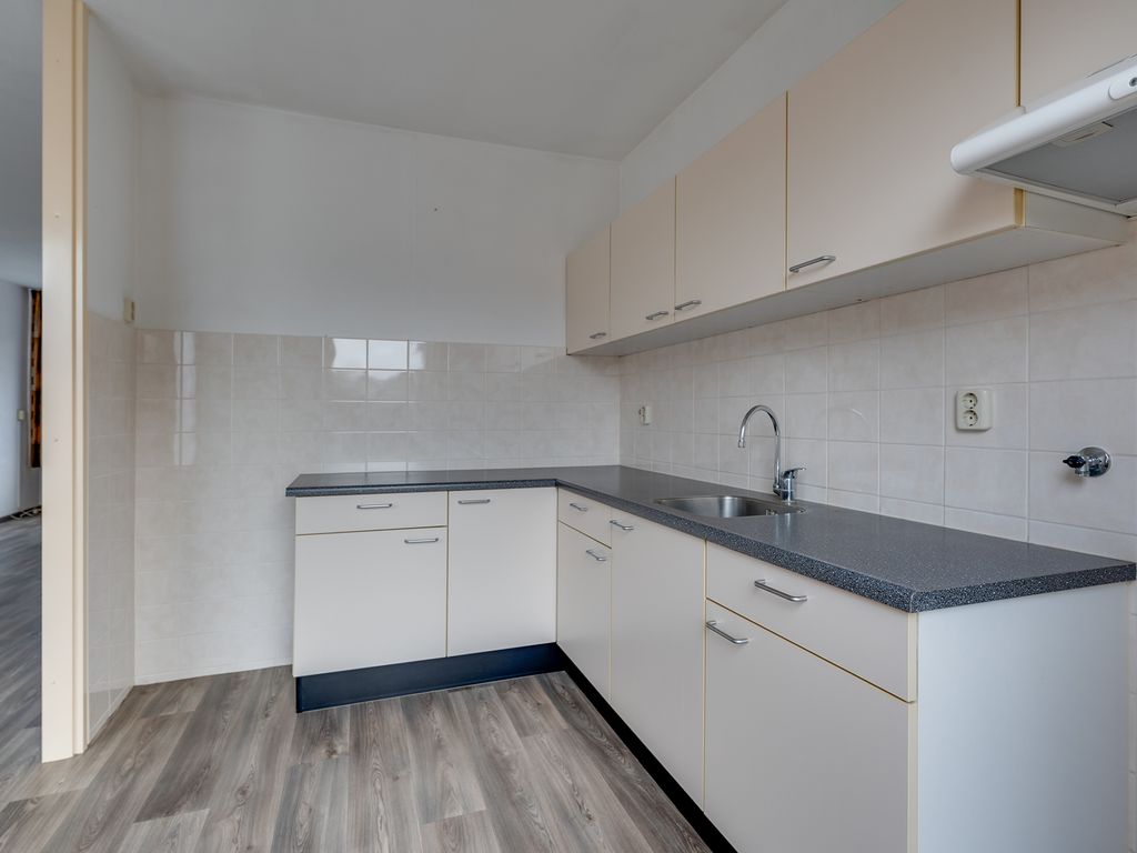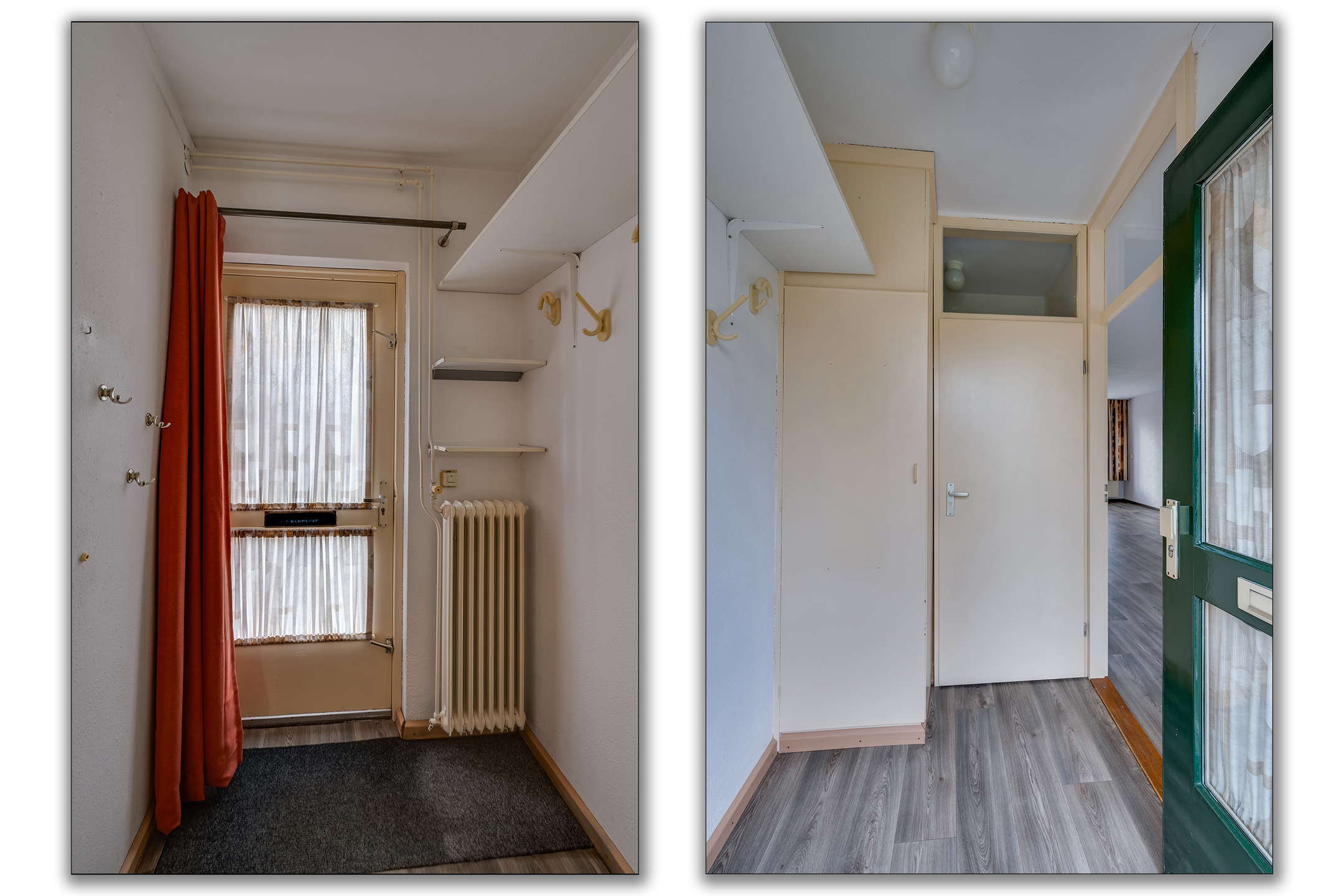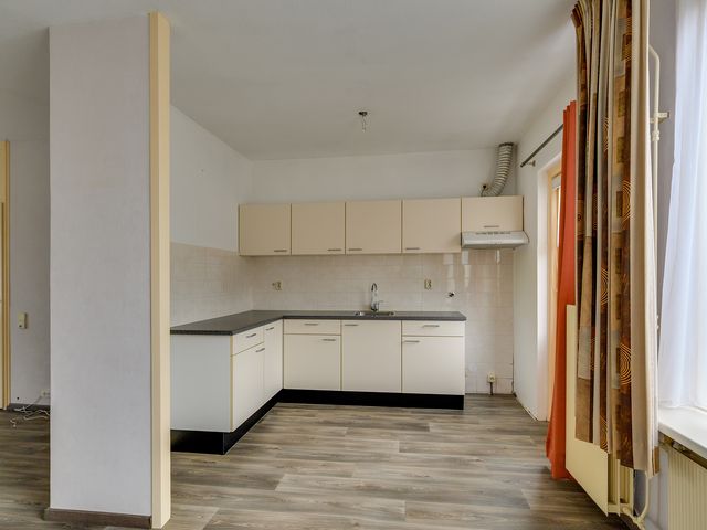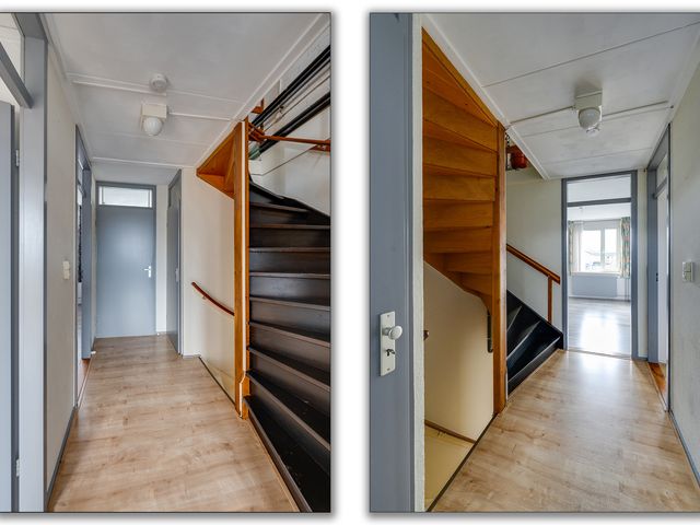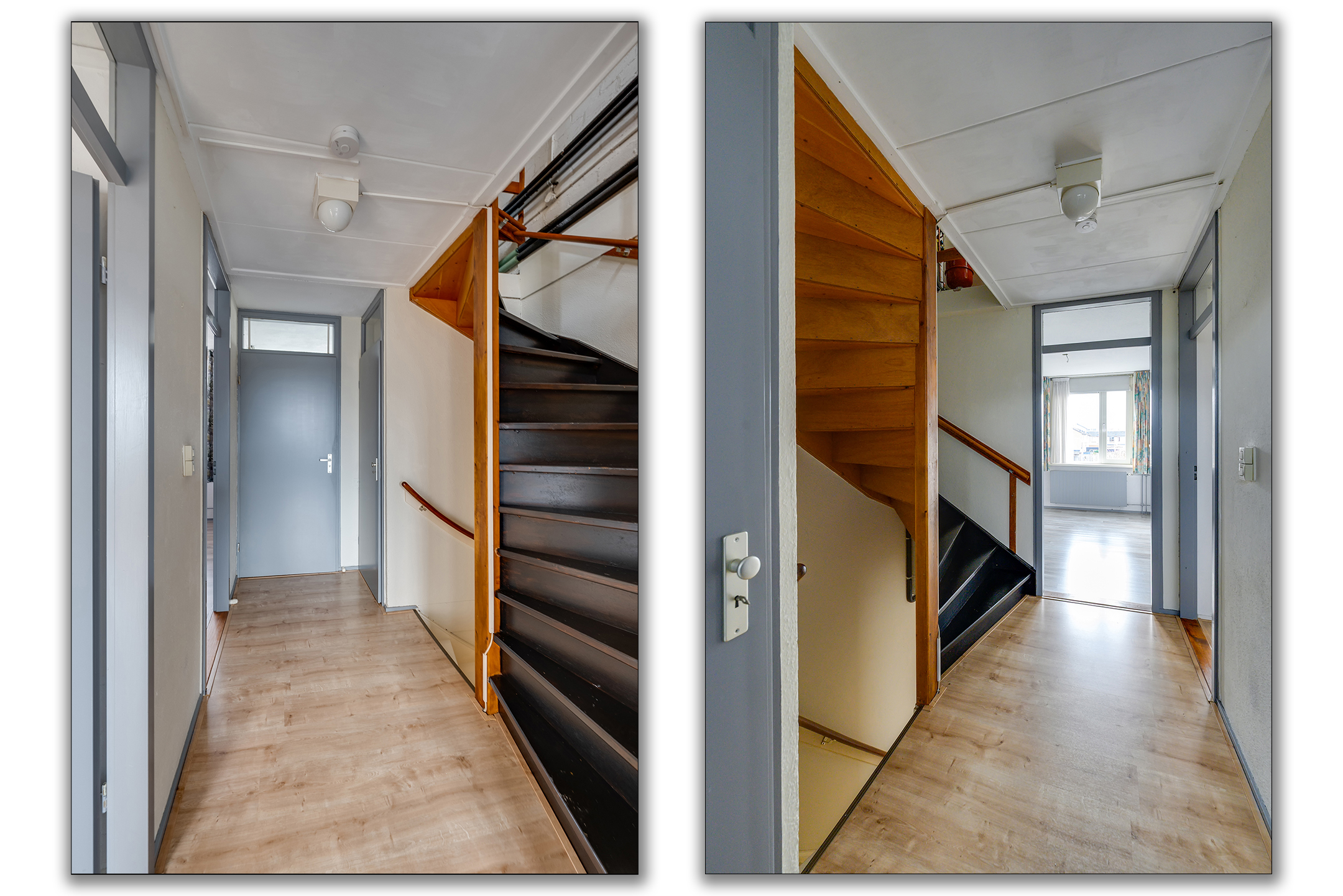 Entree/hal met zeil, meterkast (nieuwe groepenkast met 6 groepen en 2 aardlekschakelaars), toiletruimte met staand toilet en fonteintje. Doorzon woonkamer met zeil, provisiekast onder de trap en een deur met de vaste trap naar de slaapverdieping. Open keuken met zeil en een L-vormig keukenblok met afzuigkap.