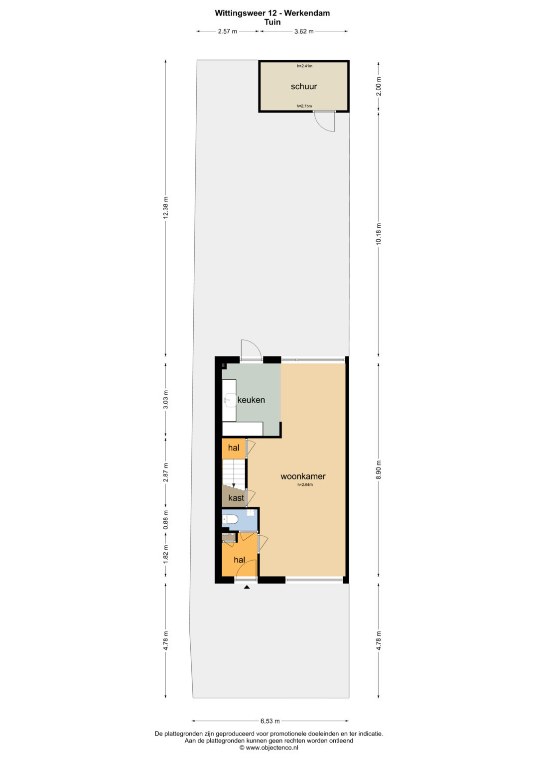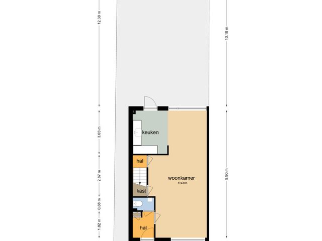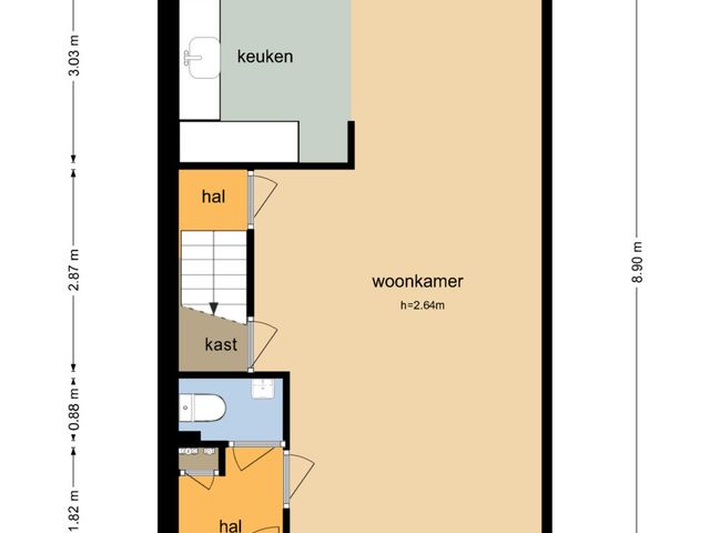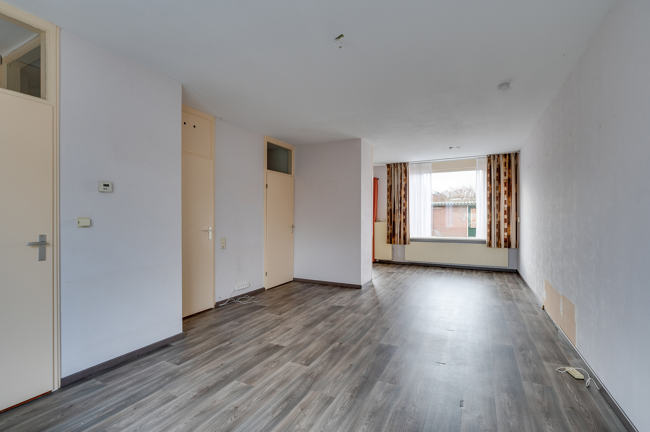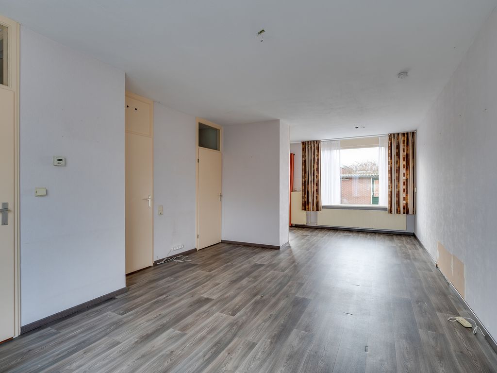 Entree/hal met zeil, meterkast (nieuwe groepenkast met 6 groepen en 2 aardlekschakelaars), toiletruimte met staand toilet en fonteintje. Doorzon woonkamer met zeil, provisiekast onder de trap en een deur met de vaste trap naar de slaapverdieping. Open keuken met zeil en een L-vormig keukenblok met afzuigkap.